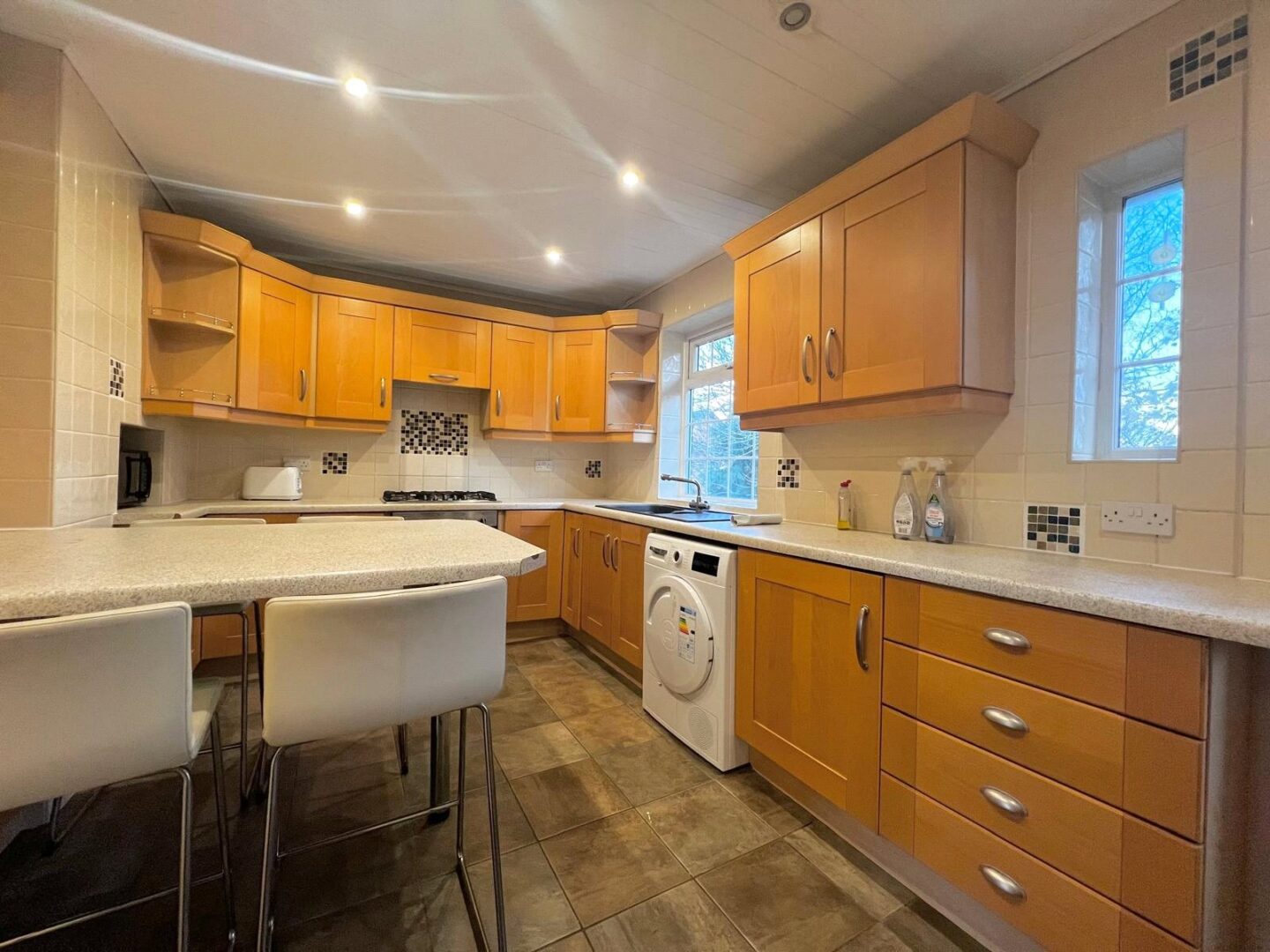 The property also benefits from a modern, tastefully presented dining kitchen, fitted with a range of contemporary wall and base units, integrated appliances, and generous work surface space. A breakfast bar provides a convenient spot for casual dining, and the kitchen opens out onto a private balcony, perfect for enjoying a morning coffee or evening breeze.