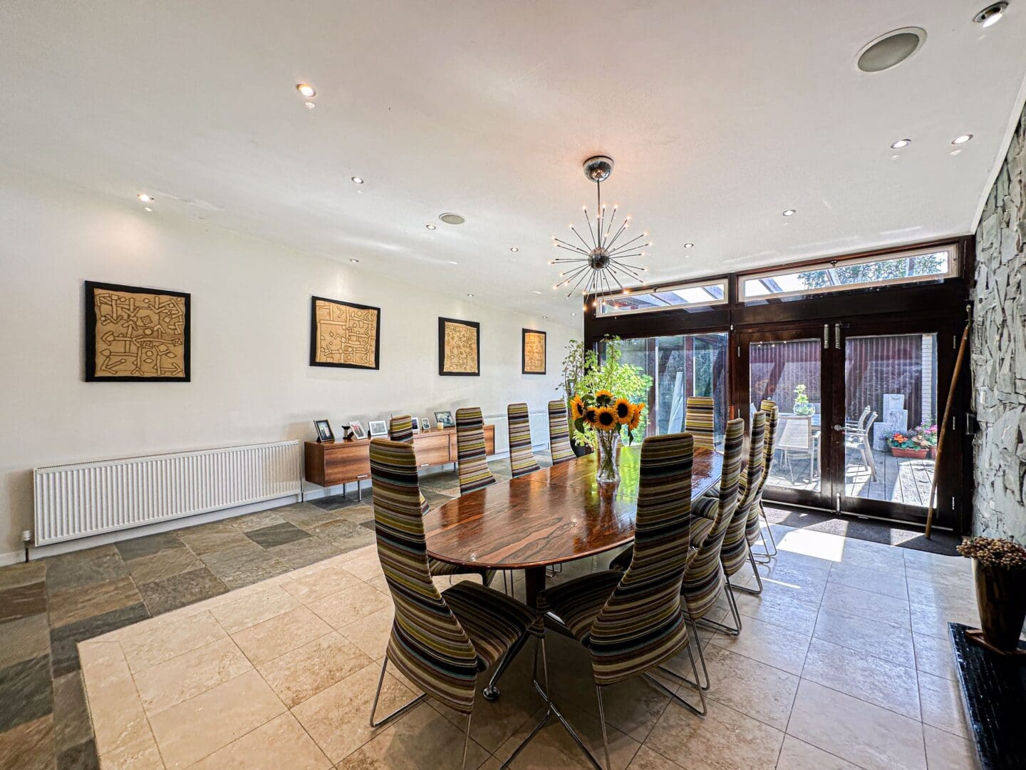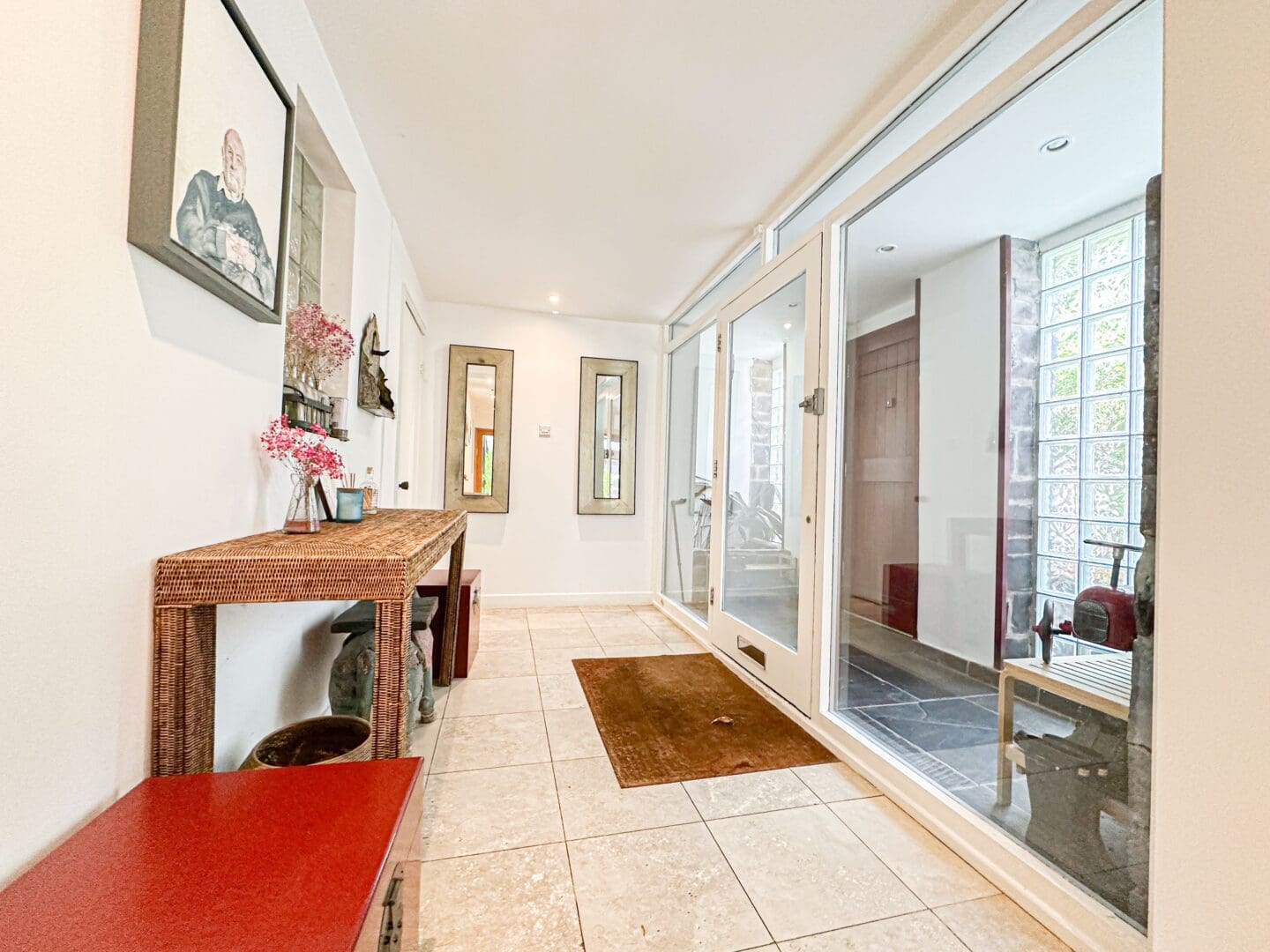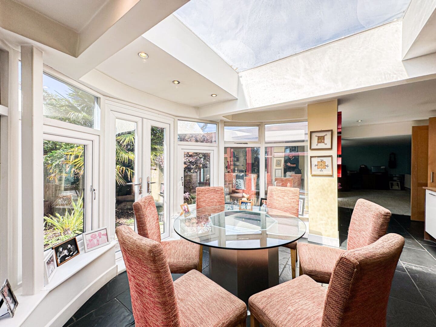 Entering via the porch, which is home to a convenient cloakroom and WC, you are greeted into the residence by an inviting entrance hall, leading through to a showstopping open plan living and dining area. Partially divided by a rock wall, this offers the ultimate social setting for entertaining guests. Beautifully presented throughout, this space enjoys floor-to-ceiling windows running the length of the room with french doors providing seamless access into the garden. Following this is a generous modern kitchen complete with a range of sleek fitted base and wall units, complementary worktops, a selection of integrated appliances and a centre island. With ample room to accommodate a dining table under the glass roof, this offers a delightful space for enjoying family mealtimes and cooking in company. The kitchen provides access into a well-equipped utility room and flows seamlessly into a further substantial sitting room which offers a tranquil setting perfect for relaxation, and is also home to a designated study space, ideal for those who work remotely.