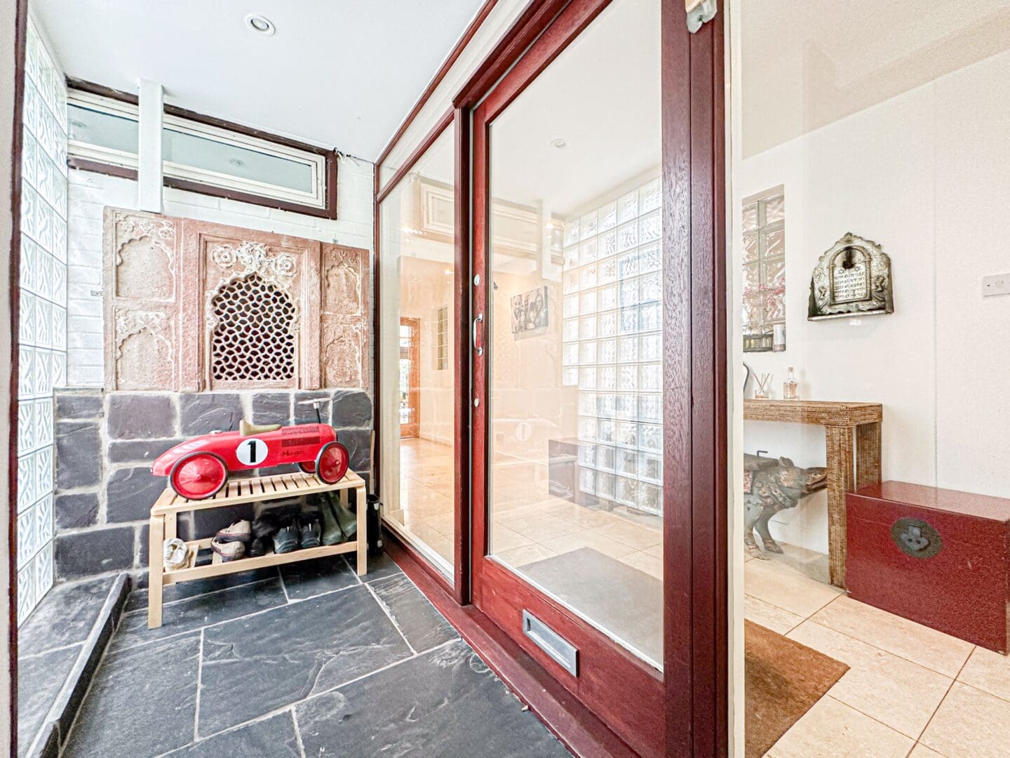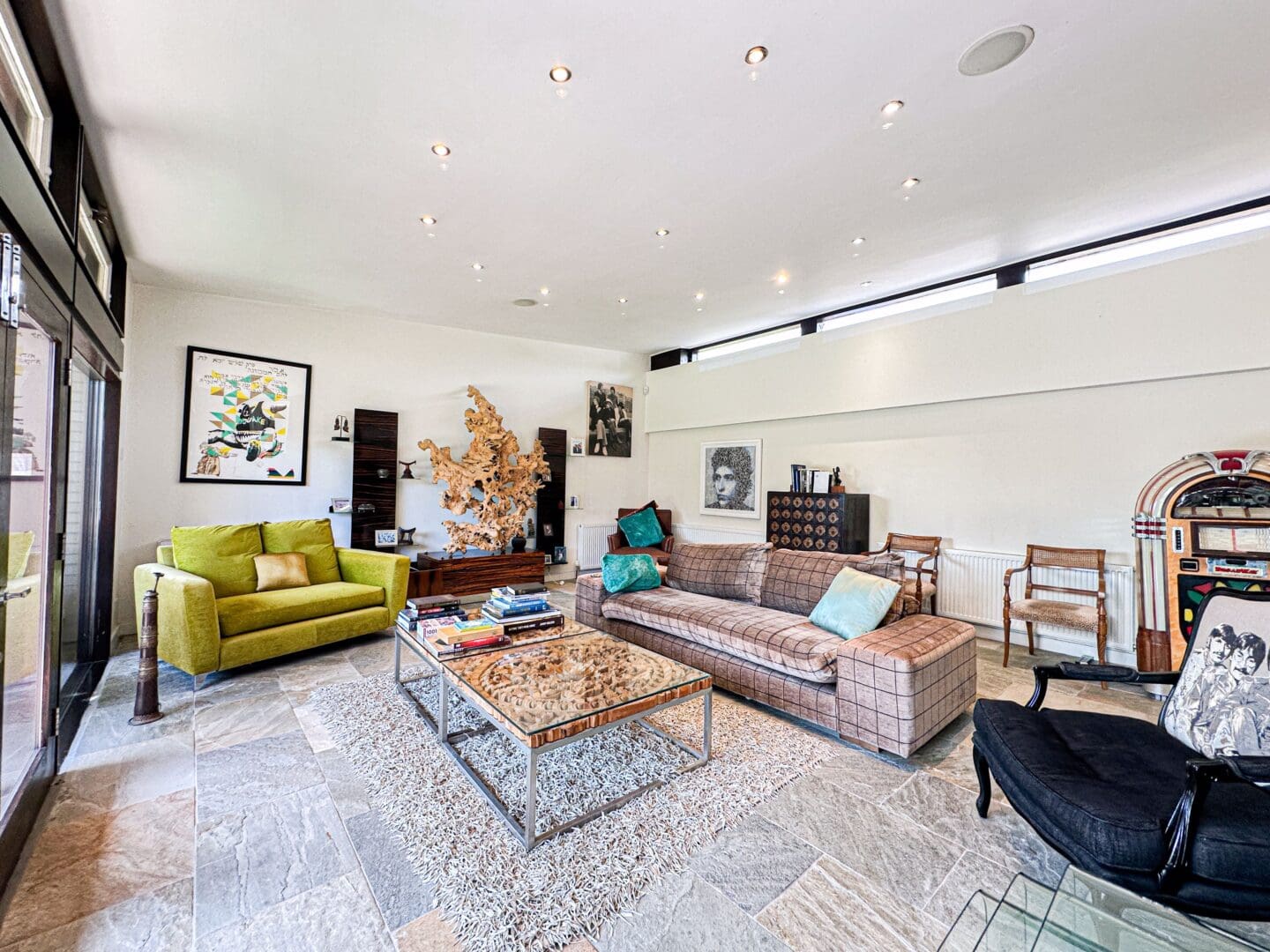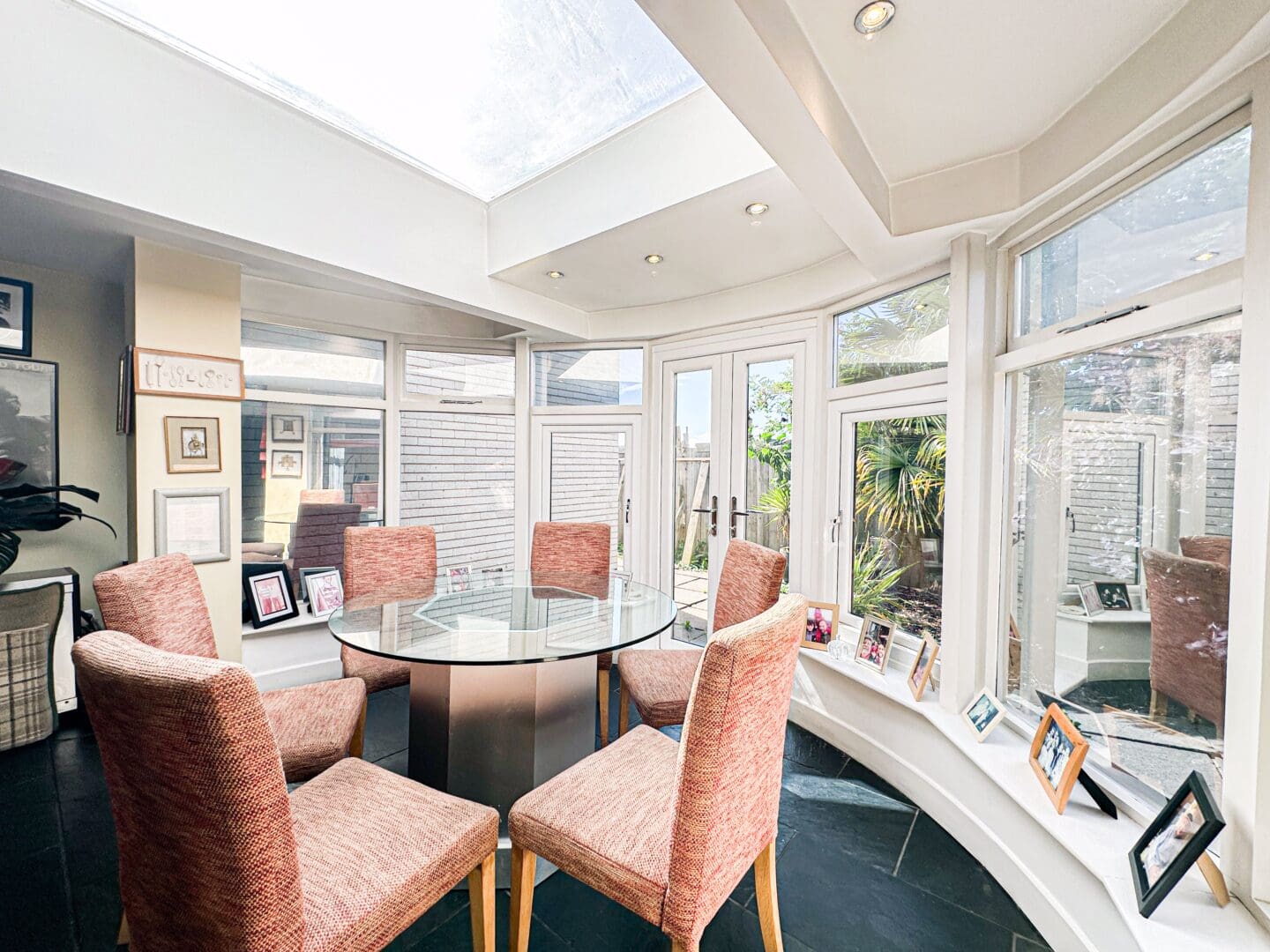Entering via the porch, which is home to a convenient cloakroom and WC, you are greeted into the residence by an inviting entrance hall, leading through to a showstopping open plan living and dining area. Partially divided by a rock wall, this offers the ultimate social setting for entertaining guests. Beautifully presented throughout, this space enjoys floor-to-ceiling windows running the length of the room with french doors providing seamless access into the garden. Following this is a generous modern kitchen complete with a range of sleek fitted base and wall units, complementary worktops, a selection of integrated appliances and a centre island. With ample room to accommodate a dining table under the glass roof, this offers a delightful space for enjoying family mealtimes and cooking in company. The kitchen provides access into a well-equipped utility room and flows seamlessly into a further substantial sitting room which offers a tranquil setting perfect for relaxation, and is also home to a designated study space, ideal for those who work remotely.