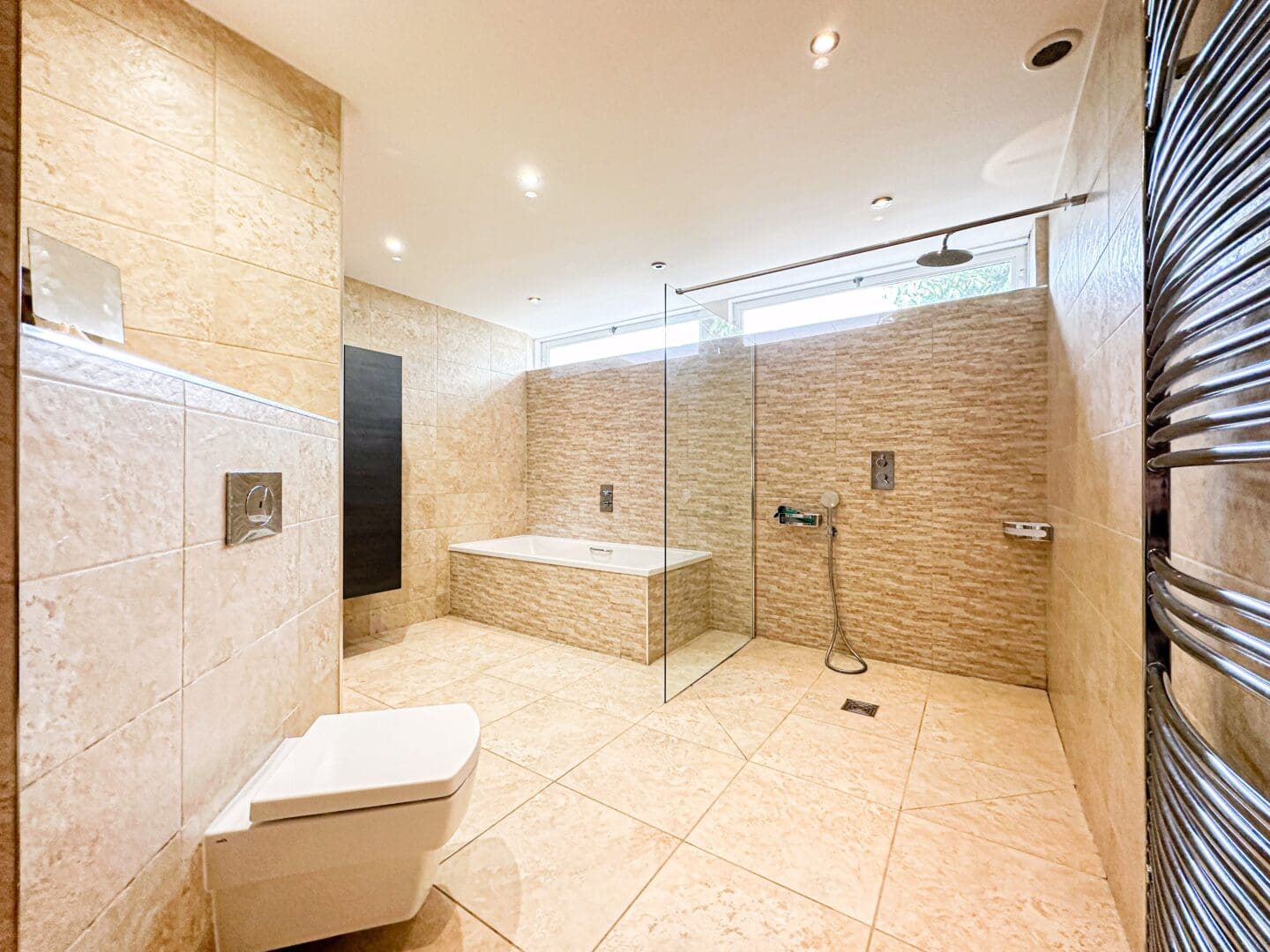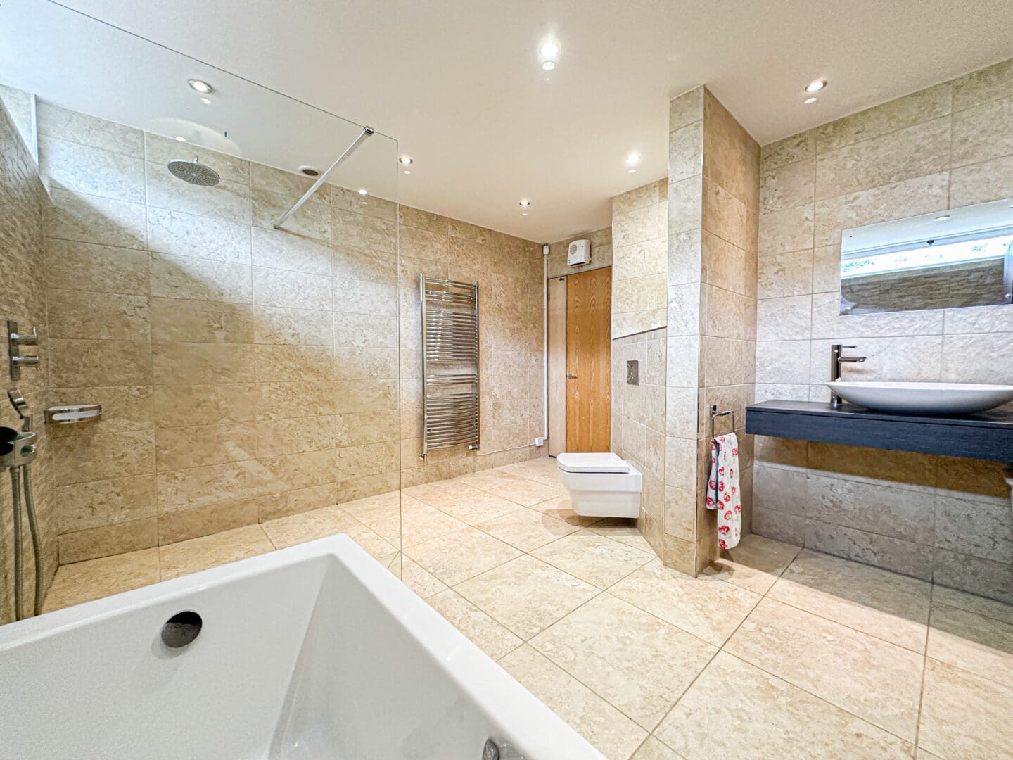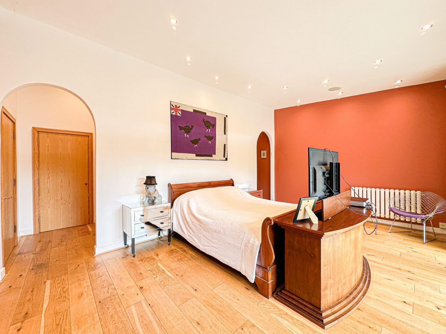 Continuing through, you will discover the fabulous master bedroom which boasts a large door opening out to the patio inviting in the morning sun, along with the added luxury of a walk-in wardrobe and deluxe four-piece ensuite bathroom. The remaining sleeping accommodation consists of three generously sized bedrooms, each finished to an excellent standard, accompanied by a contemporary style family bathroom suite and a kitchenette.