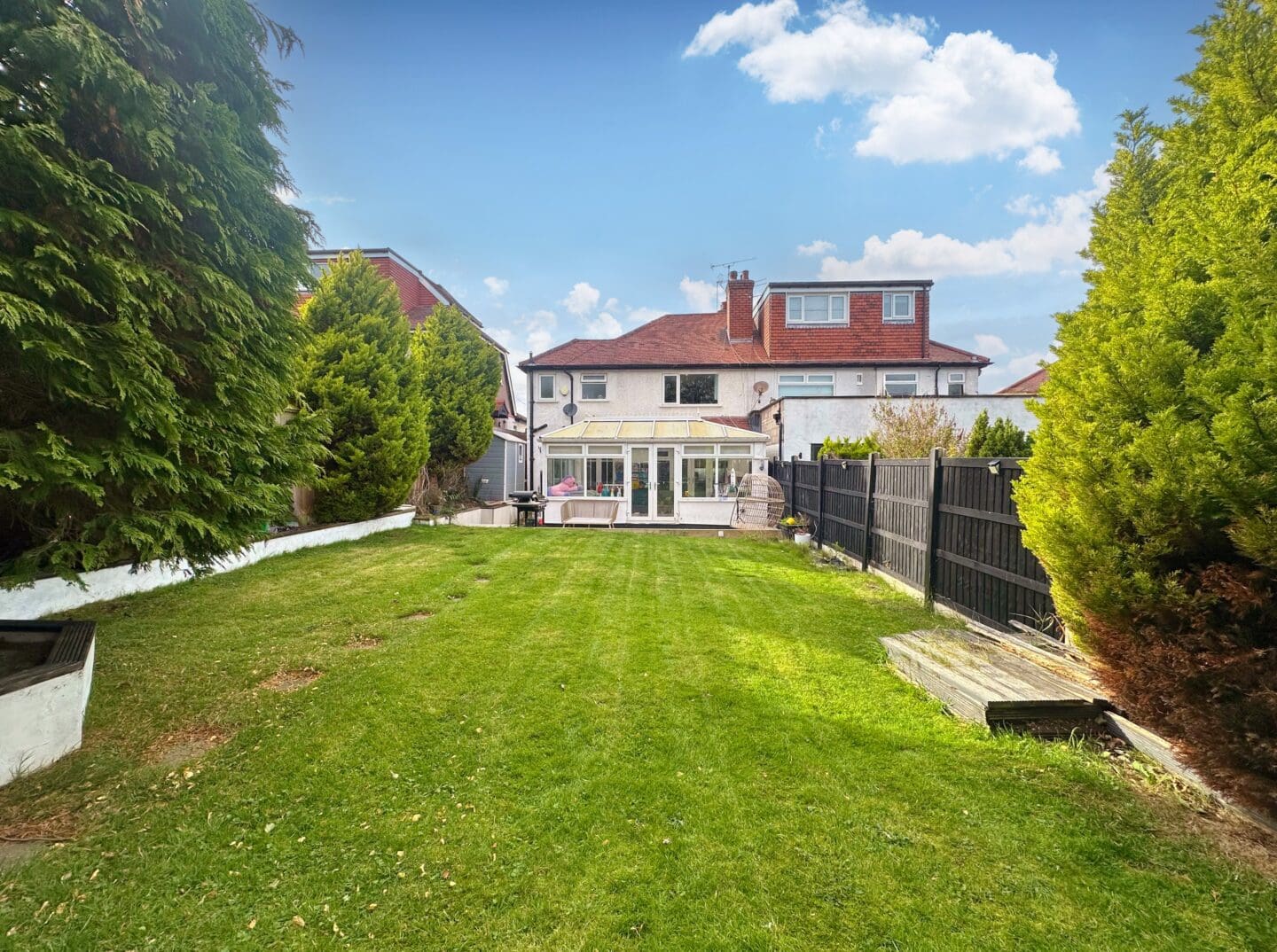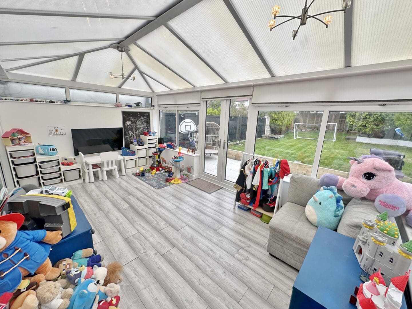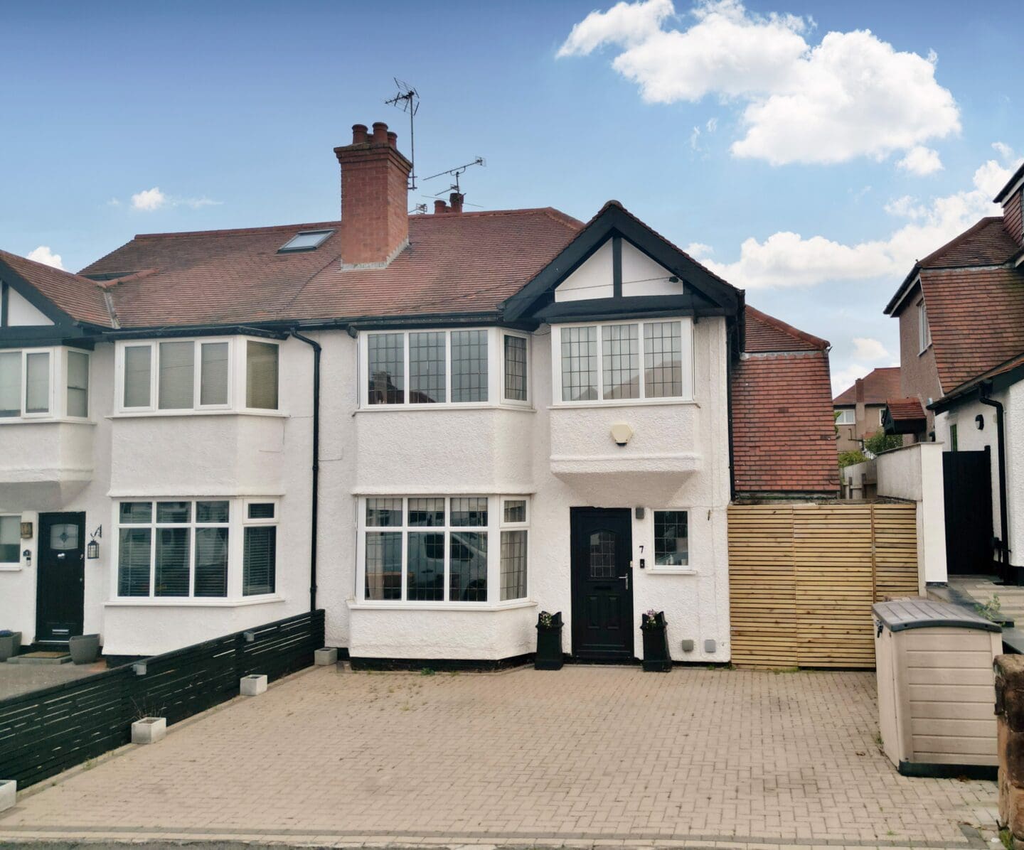 Outside, the property enjoys a block paved driveway with parking for two vehicles and a useful storage area to the front. The large rear garden is a standout feature, beautifully landscaped with a porcelain tiled patio and sweeping lawn, offering a wonderful space for outdoor entertaining and family time.