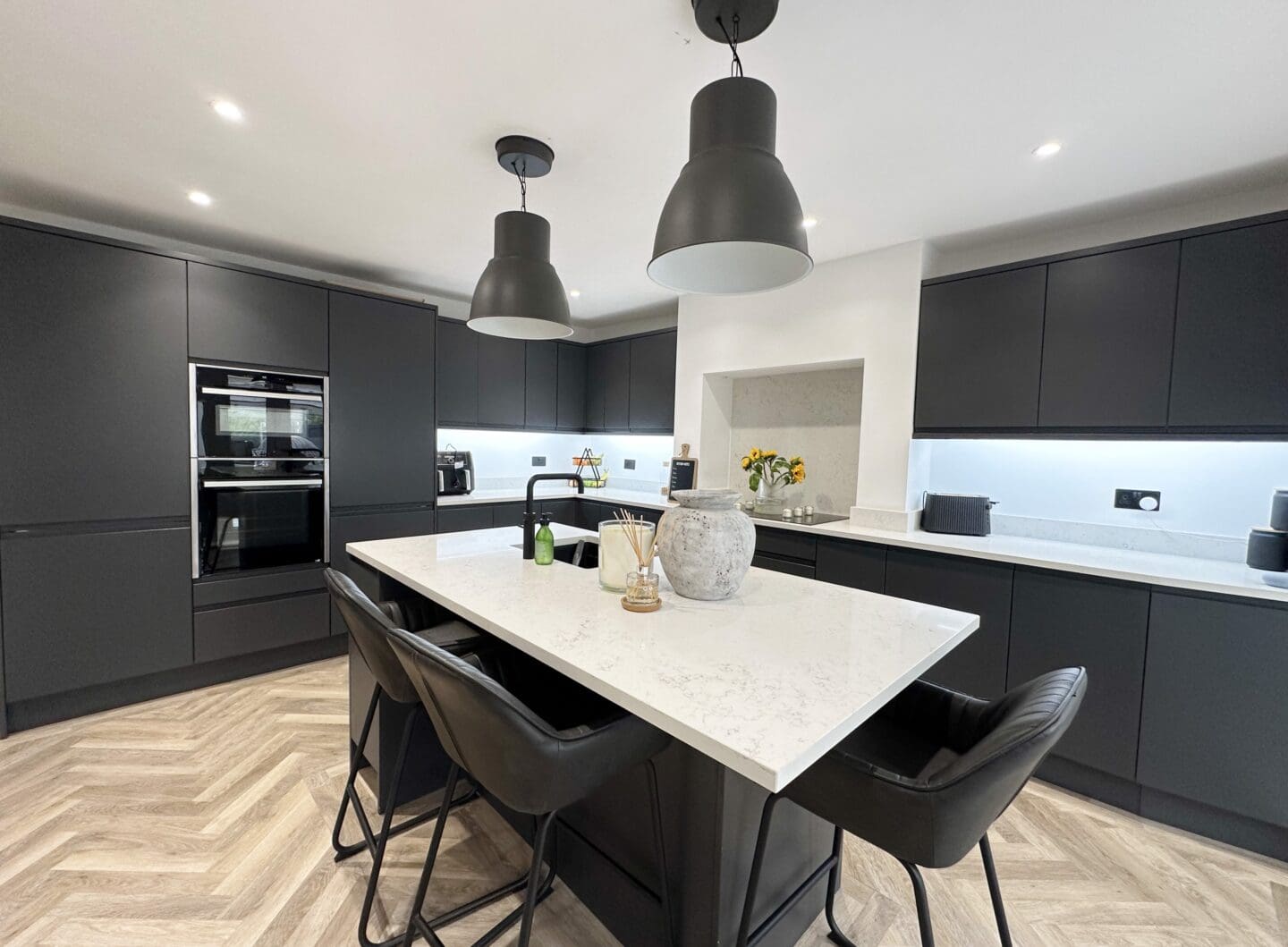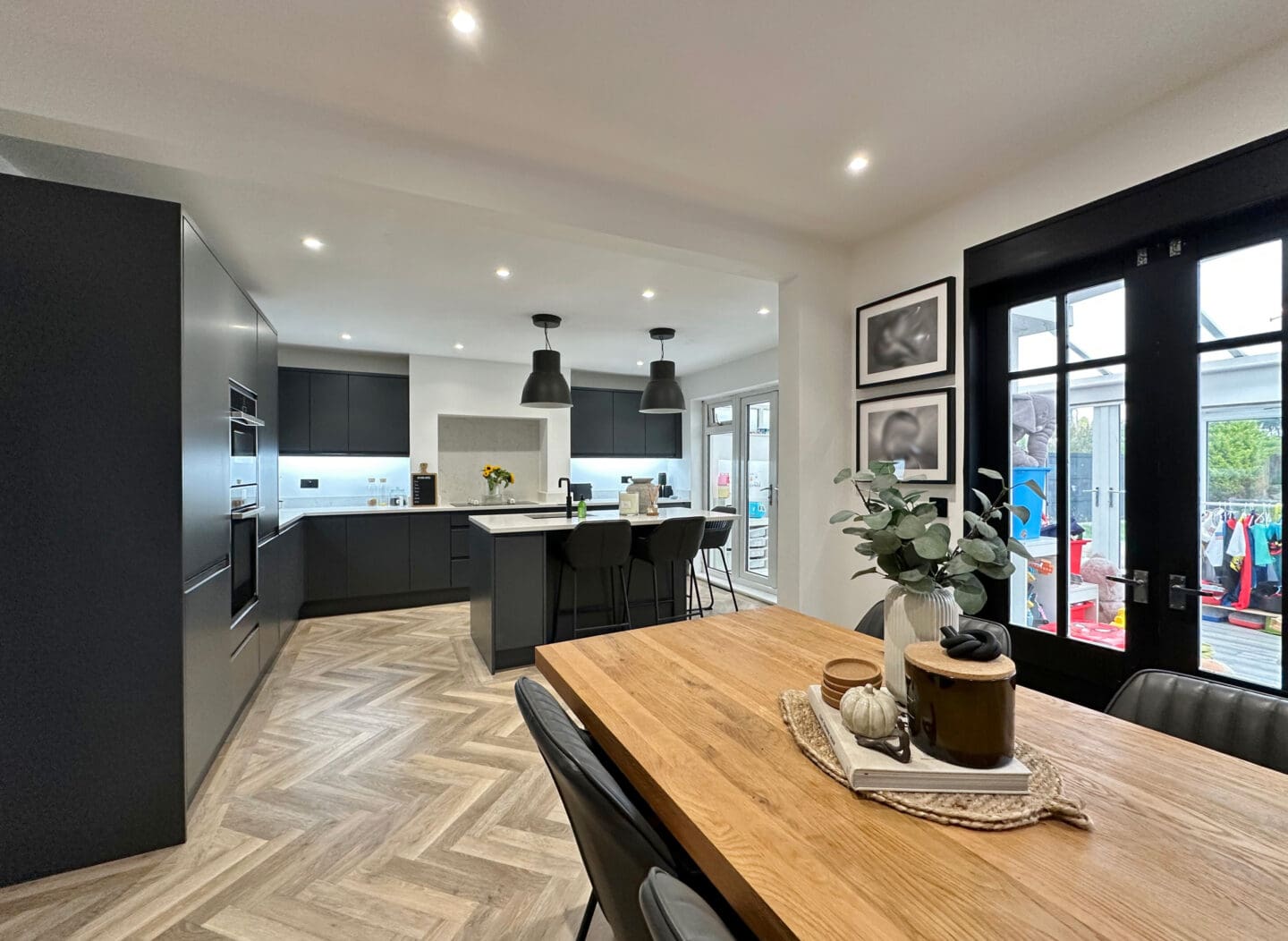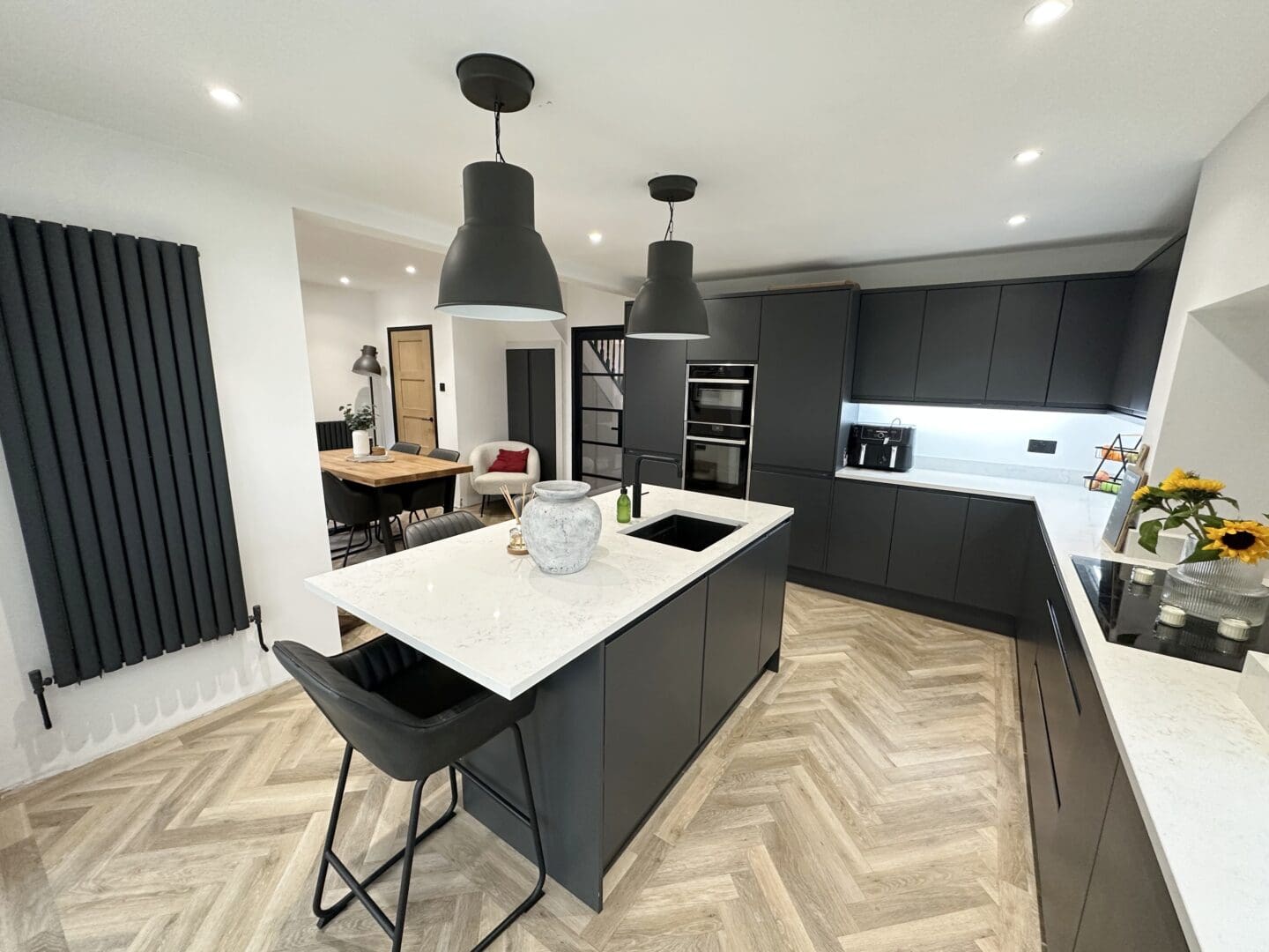 The welcoming hallway features refurbished original parquet flooring, which continues into a cosy front lounge with a bay window. To the rear, you’ll find a stunning open plan kitchen and dining area, fitted with a bespoke kitchen that includes a range of wall and base units, a central island, Quartz worktops, and premium Neff appliances including a slide and hide oven, combi oven and microwave, along with a Quooker boiling-water tap. A practical utility room with space for a washing machine and tumble dryer, while a spacious conservatory spans the width of the property, providing the perfect space to relax and enjoy views of the rear garden.
