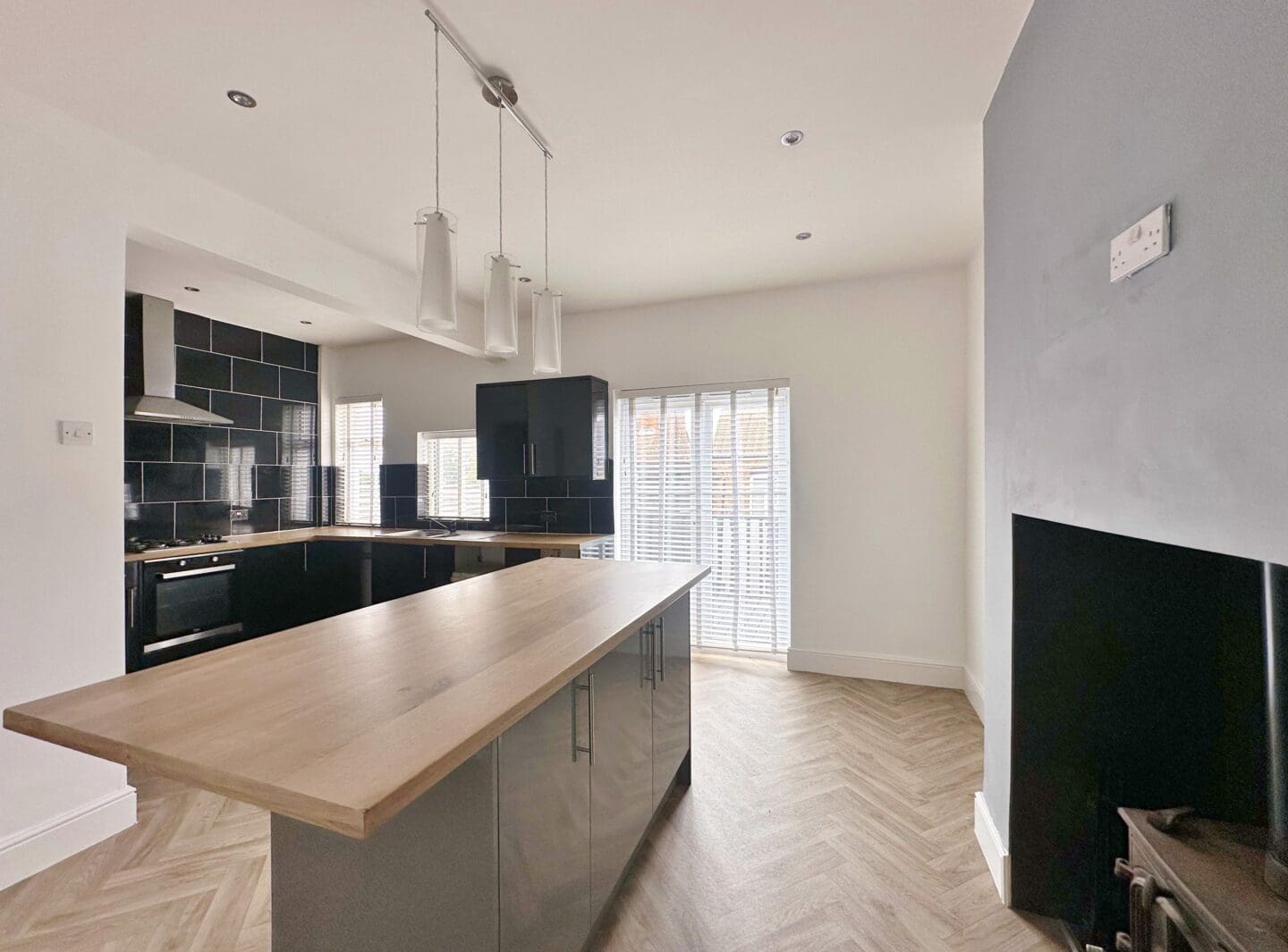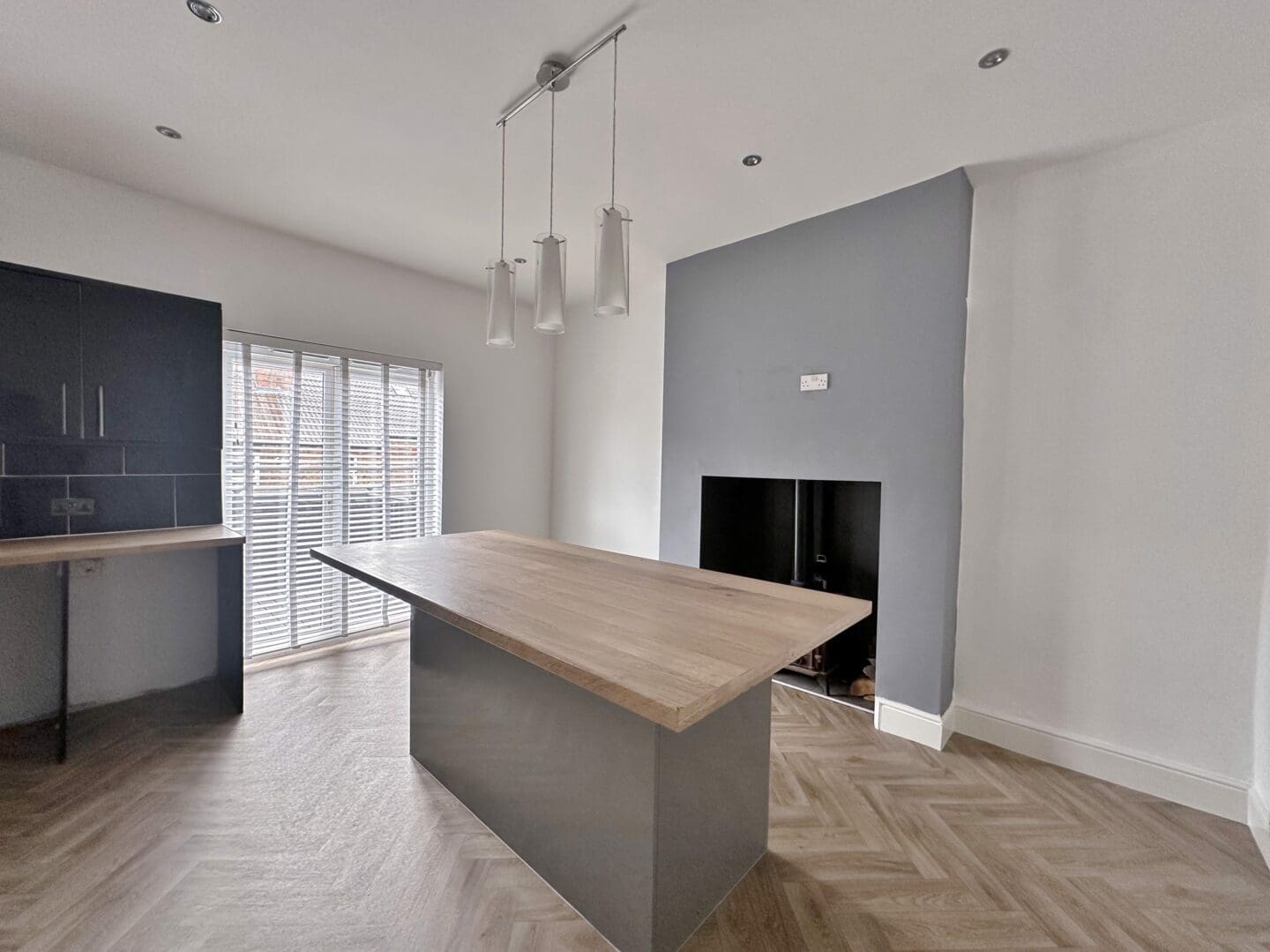 Step inside to find a welcoming hallway, spacious living room at the front of the house with a bay window that draws in the daylight. To the rear lies an impressive open plan kitchen and dining area, the social heart of the home. Complete with a large central island, excellent worktop space, and plenty of storage along with a log burning stove adding a homely feel and French doors that lead directly to a private, sunny courtyard style garden, offering low maintenance outdoor living. Upstairs, the main bedroom features its own bay window and built-in wardrobe, two further sizeable bedrooms and a three piece family bathroom complete this superb accommodation.