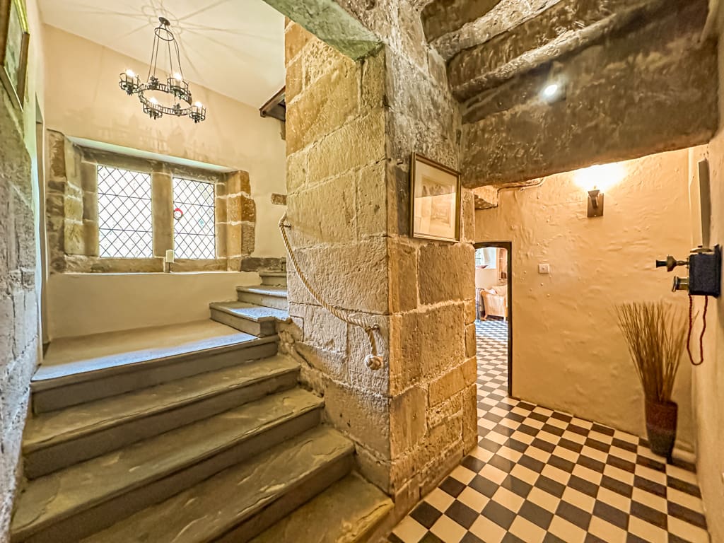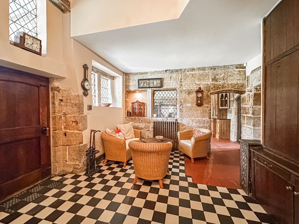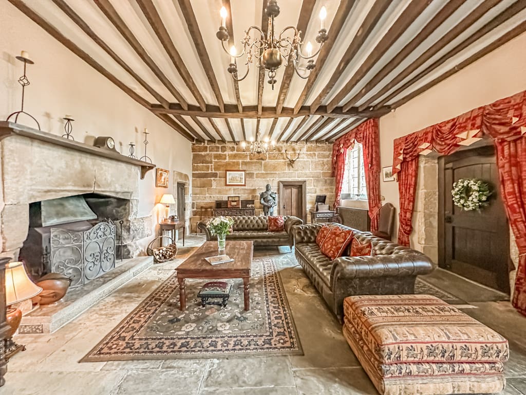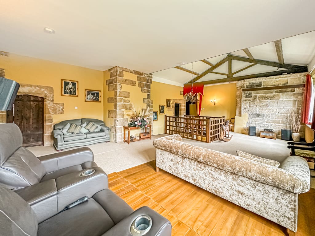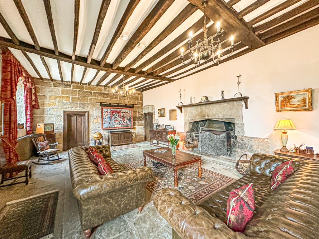 A semi circular stone porch with side stone seats leads to a solid oak front door which opens into the original Great Hall. With a deep stone fireplace and a glazed niche window revealing what is believed to be an original Priest hiding place. From here you have a lounge with beamed ceiling, recessed fireplace and door through to a study a particular feature being a galleried Library area and a balanced trap door to a dry cellar. A formal dining room is on the opposite side of this residence with large stone fireplace and character stained glass window. Bespoke oak fitted kitchen and a snug with storage and W.C off and door through to a covered loggia / patio area.