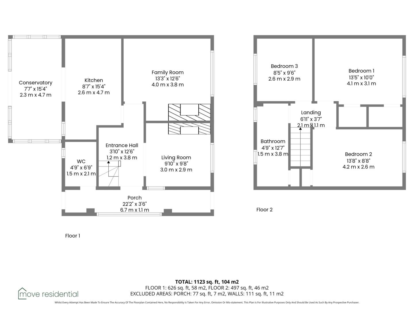 Following through the porch, you are greeted into the property by an entrance hall which leads through to two spacious reception rooms, each boasting a feature fireplace. Continuing through you will find a sizable kitchen with internal french doors providing access into a conservatory, and concluding the ground floor is a convenient WC.