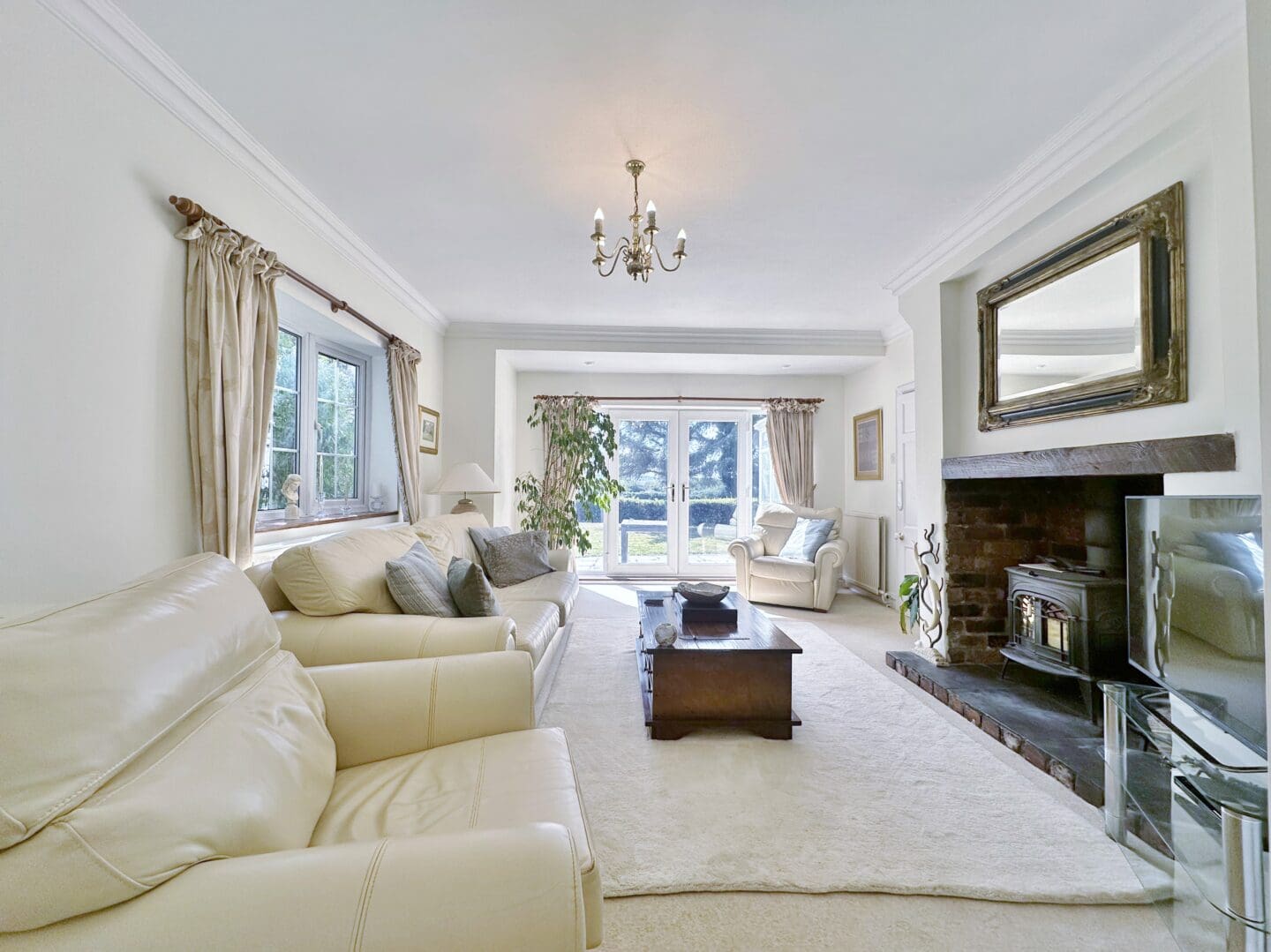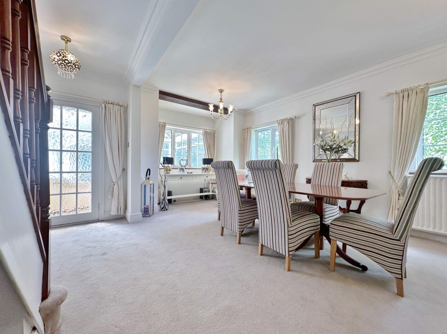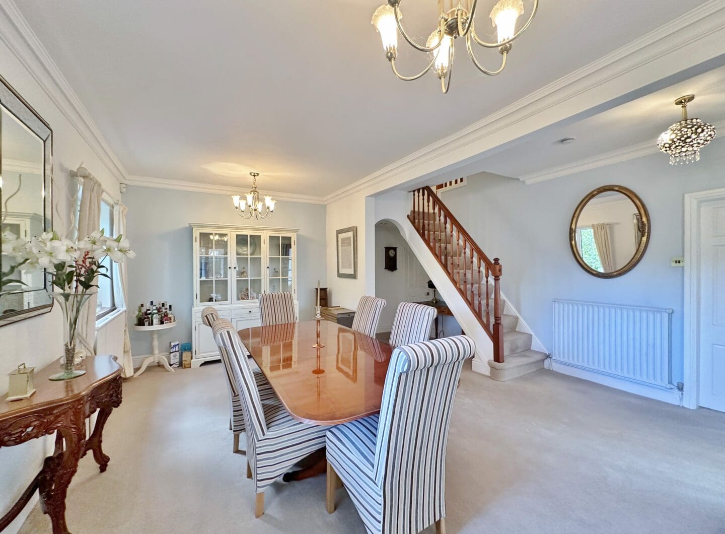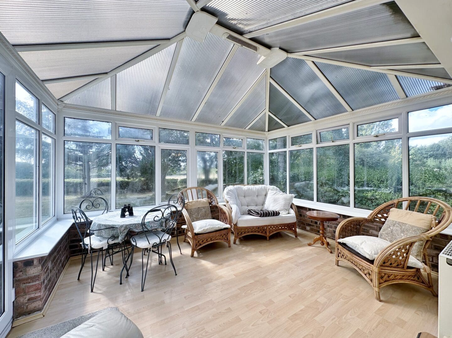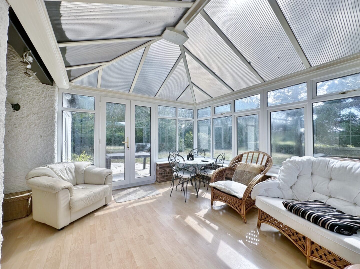 The internal accommodation extends to over 1,800 square feet, boasting generous proportions and a thoughtfully designed layout. A welcoming hallway leads you into the elegant lounge, complete with a charming feature fireplace, while the formal dining room provides an ideal space for entertaining and benefits from stairs to the first floor as well as direct access into the conservatory. Bathed in natural light, the conservatory captures stunning views over the expansive gardens, creating a perfect spot to unwind and take in the surroundings. From the hallway, you will also find a stylish four piece bathroom and a modern fitted kitchen, complemented by a utility room offering further practicality.