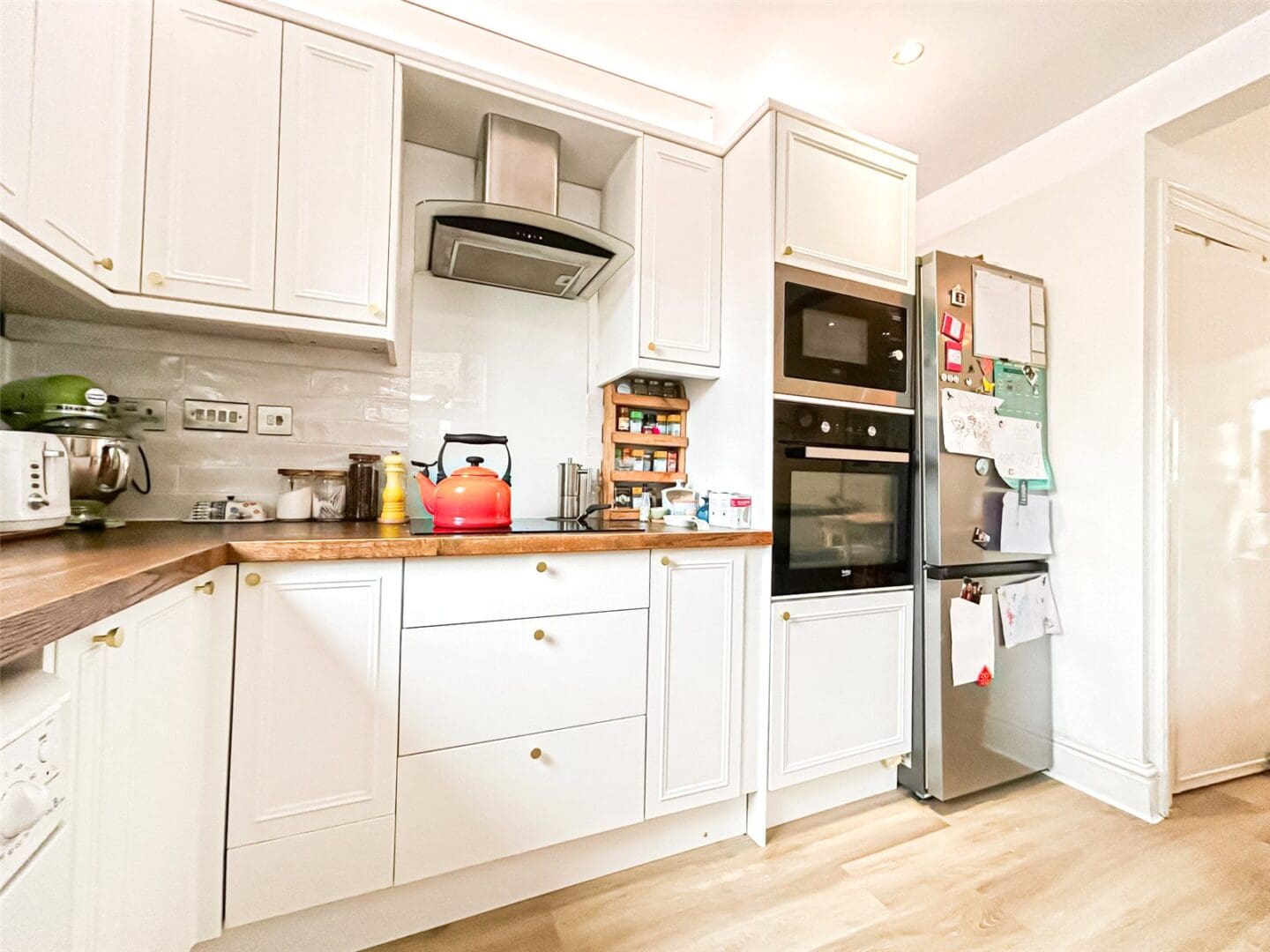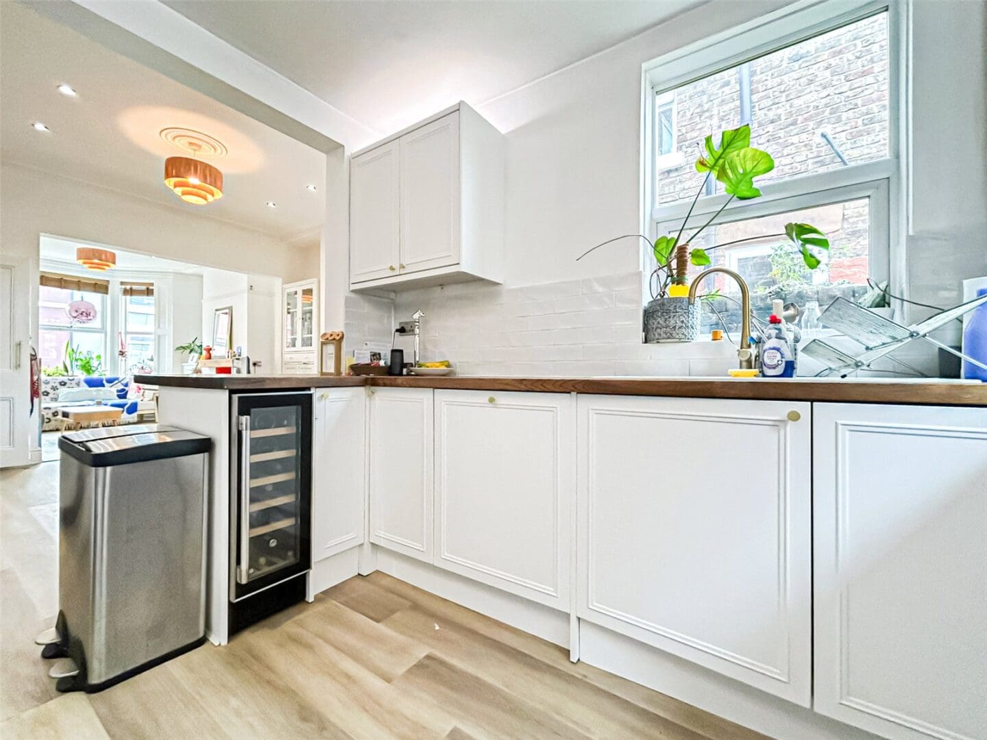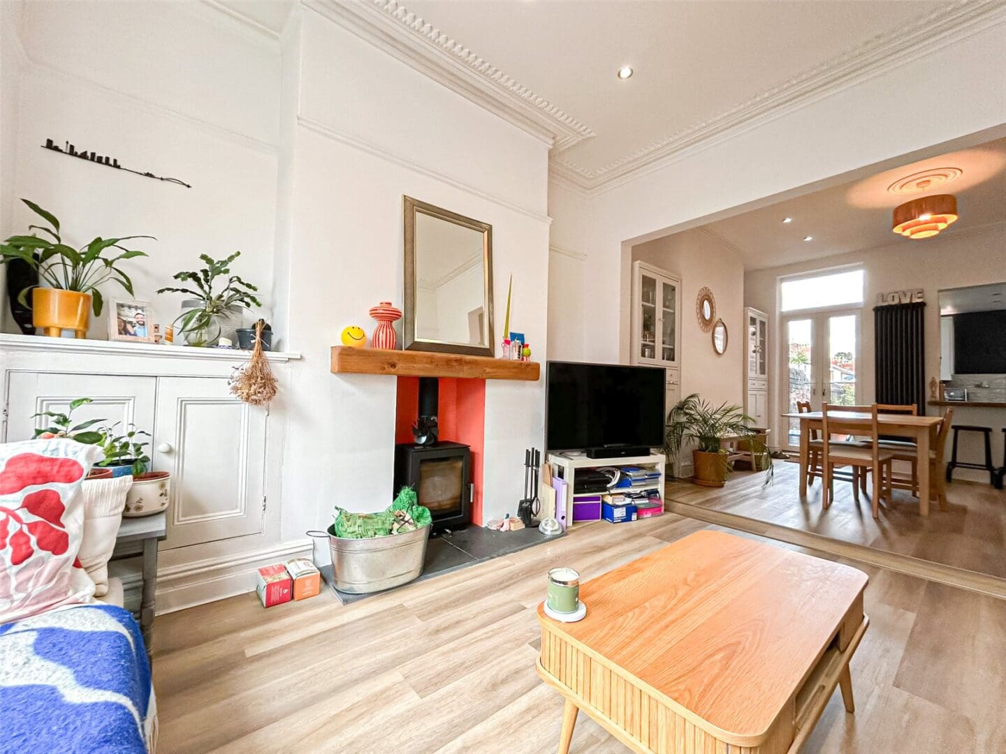 The heart of the home is a bright and welcoming living room featuring a log burner – perfect for cosy evenings in. The modern kitchen comes fully equipped, including a built-in wine fridge, ideal for entertaining or enjoying a relaxed night at home.