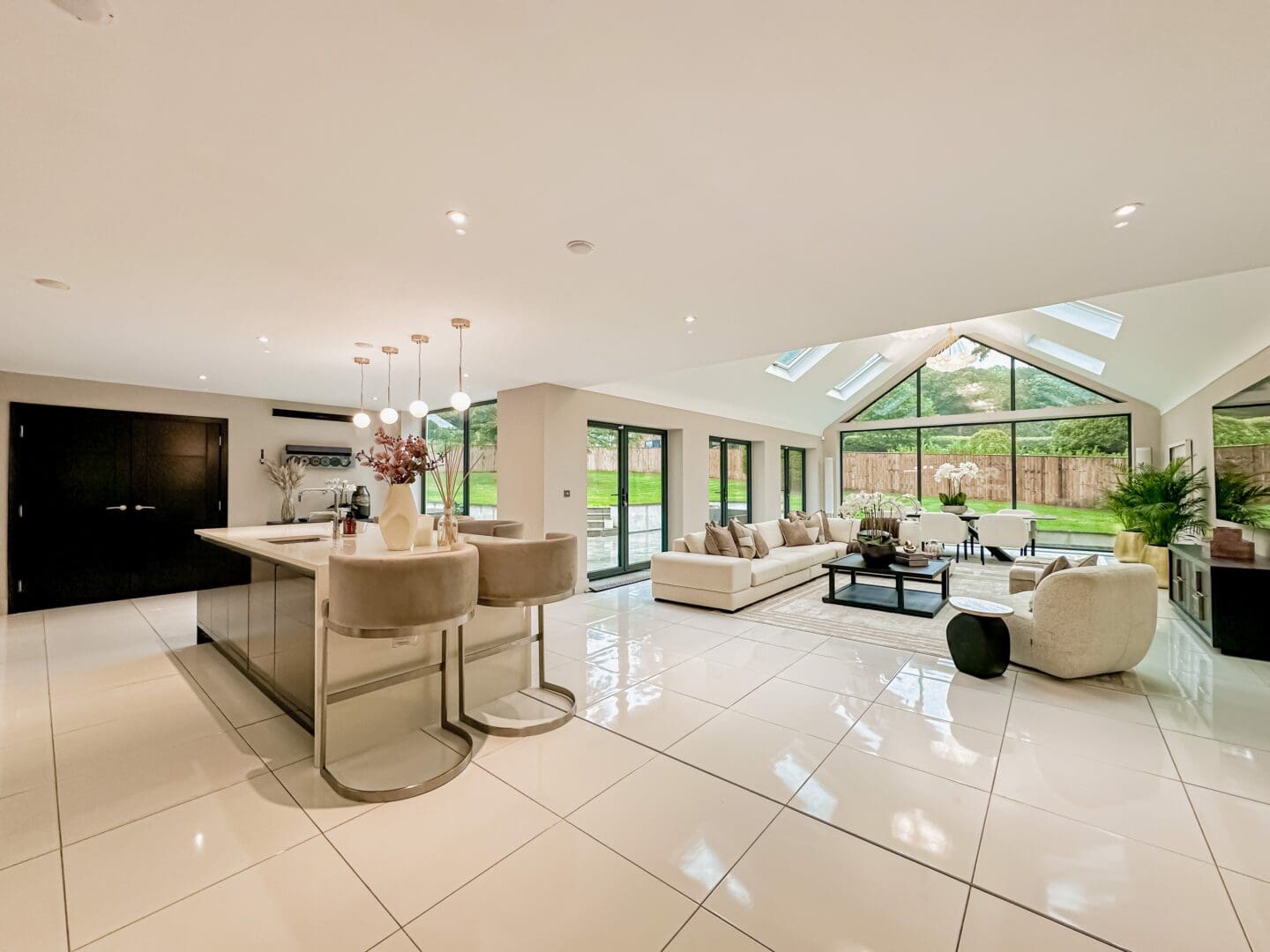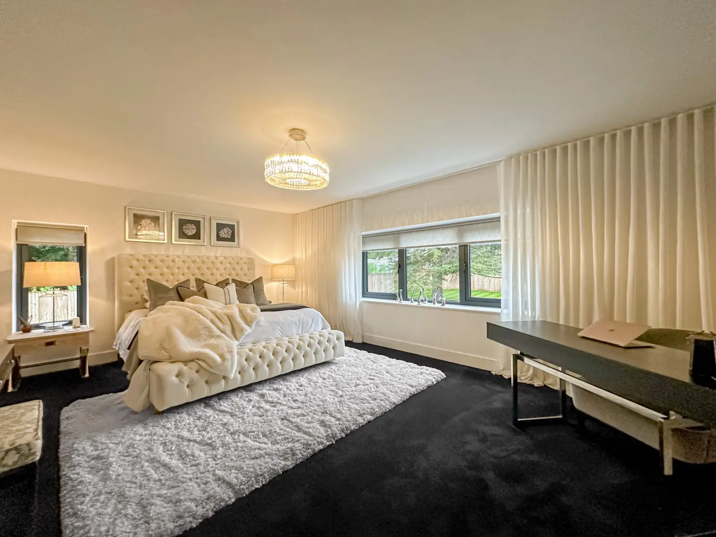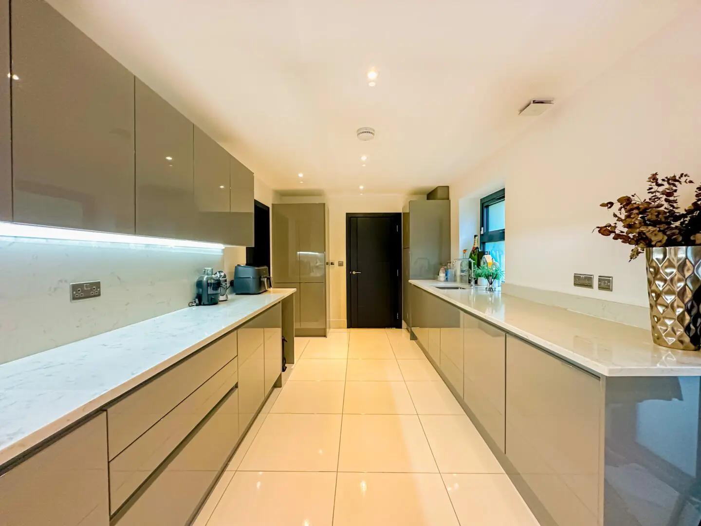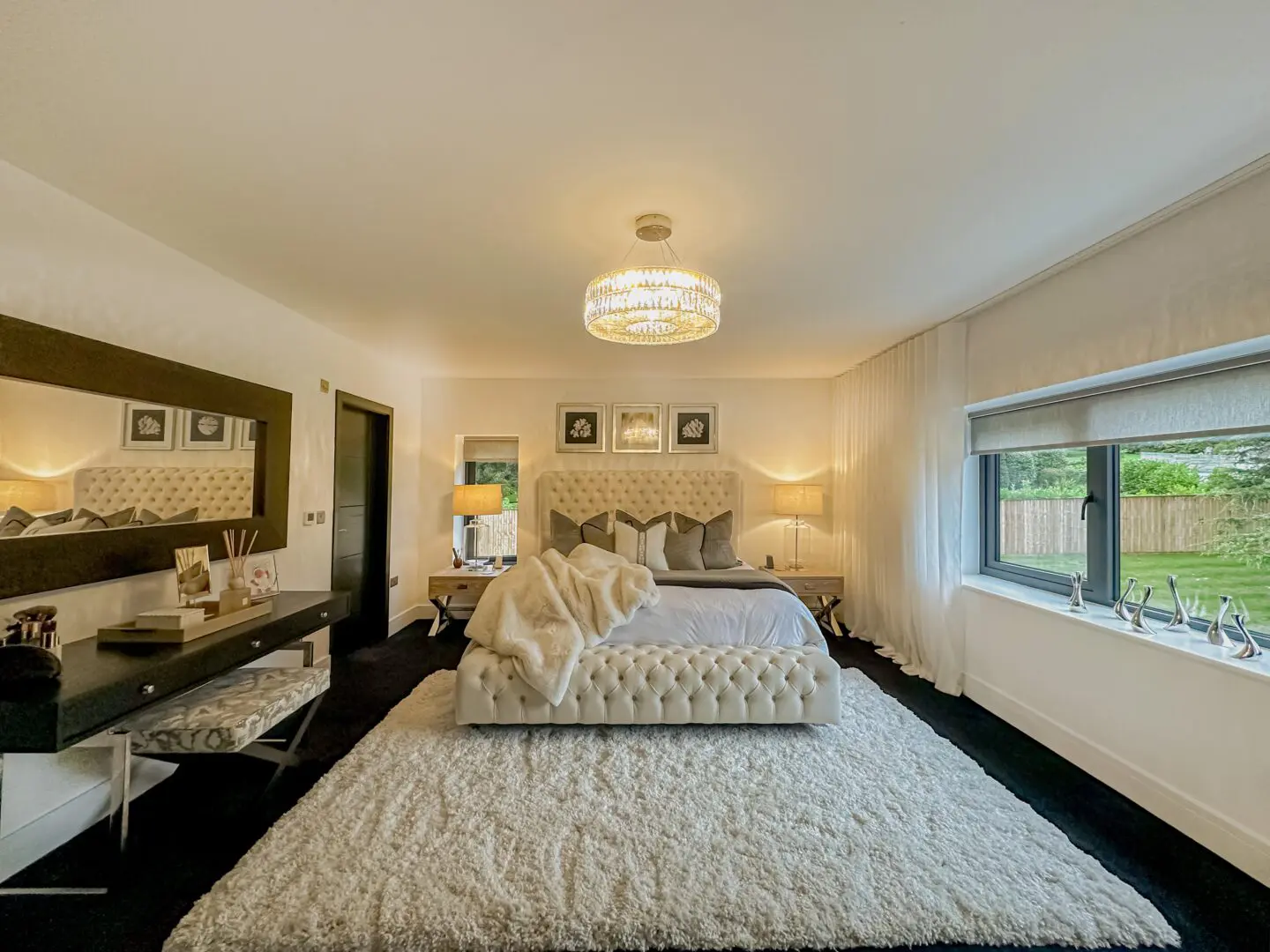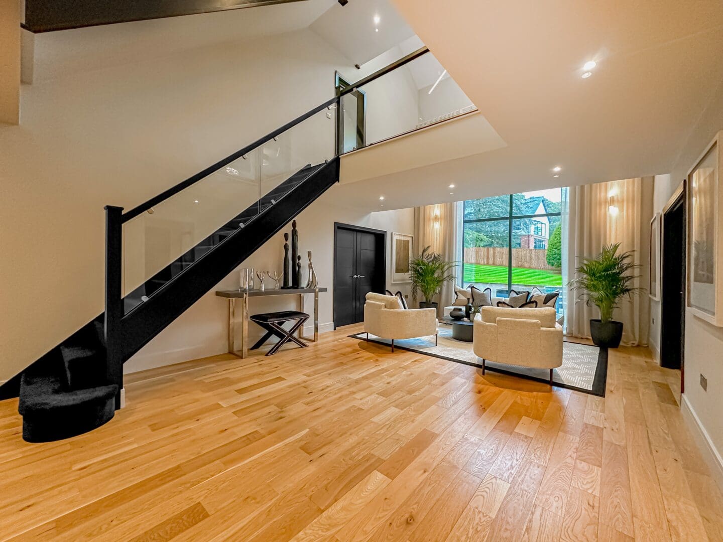 Upon entering, you are greeted by a grand triple height entrance hallway featuring a striking suspended landing and impressive double height windows. The ground floor offers a spacious lounge, a dedicated cinema room and a gym with bi-folding doors opening onto the beautifully landscaped rear garden. At the heart of the home lies the stunning open plan kitchen, living, and dining area, an expansive 1,100 square feet space showcasing a bespoke fitted kitchen and statement windows that create a perfect blend of elegance and functionality. Completing the ground floor are a cloakroom, W.C, plant room, utility room and an inner hallway leading to a shower room.