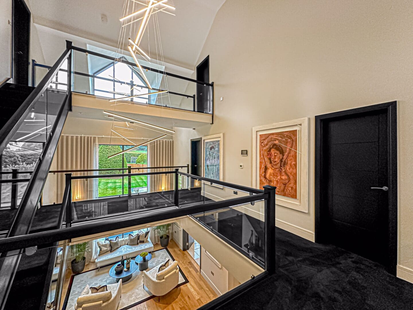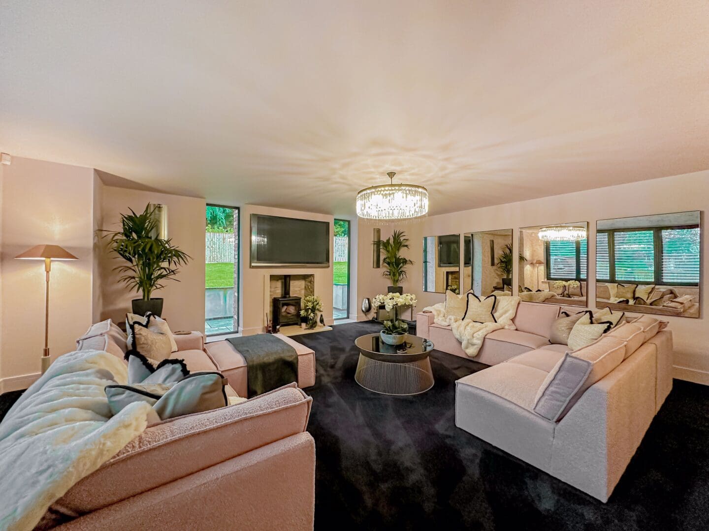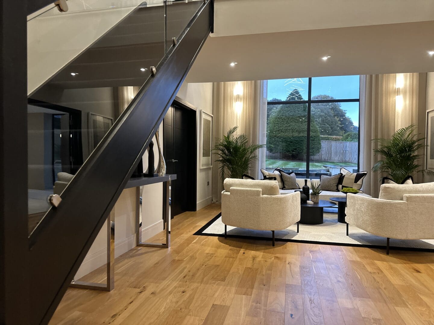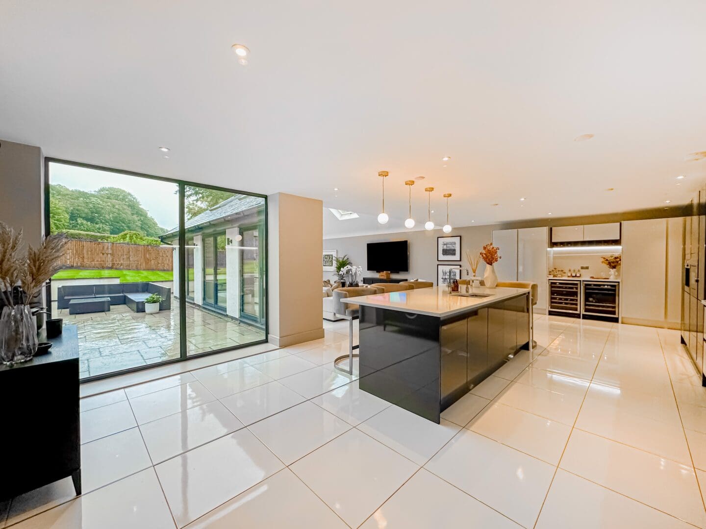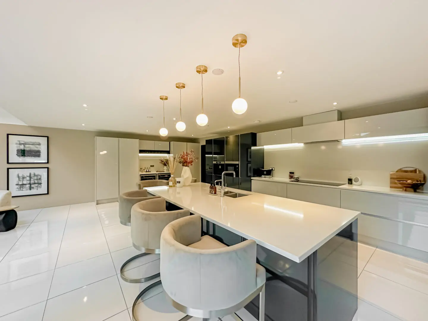 Upon entering, you are greeted by a grand triple height entrance hallway featuring a striking suspended landing and impressive double height windows. The ground floor offers a spacious lounge, a dedicated cinema room and a gym with bi-folding doors opening onto the beautifully landscaped rear garden. At the heart of the home lies the stunning open plan kitchen, living, and dining area, an expansive 1,100 square feet space showcasing a bespoke fitted kitchen and statement windows that create a perfect blend of elegance and functionality. Completing the ground floor are a cloakroom, W.C, plant room, utility room and an inner hallway leading to a shower room.