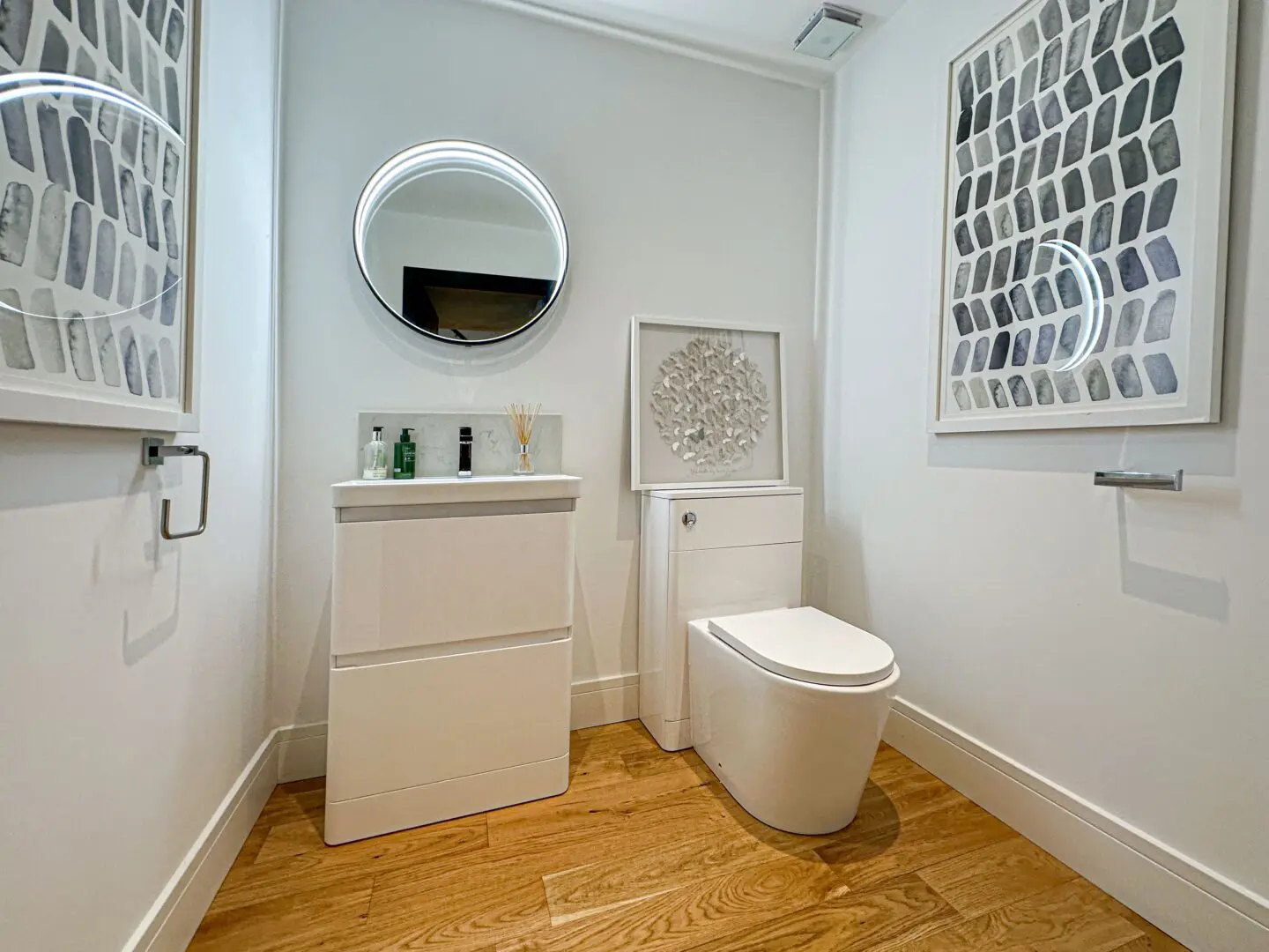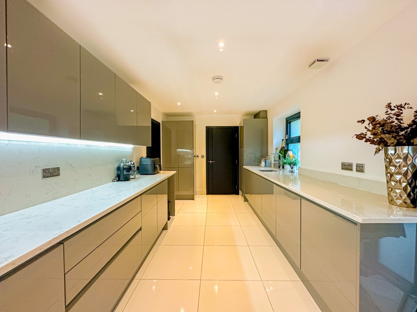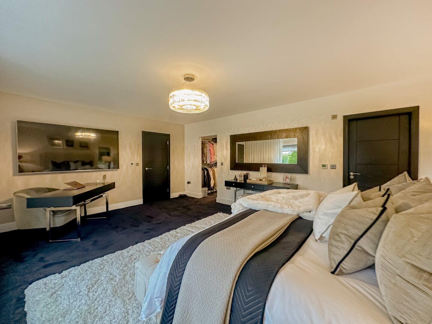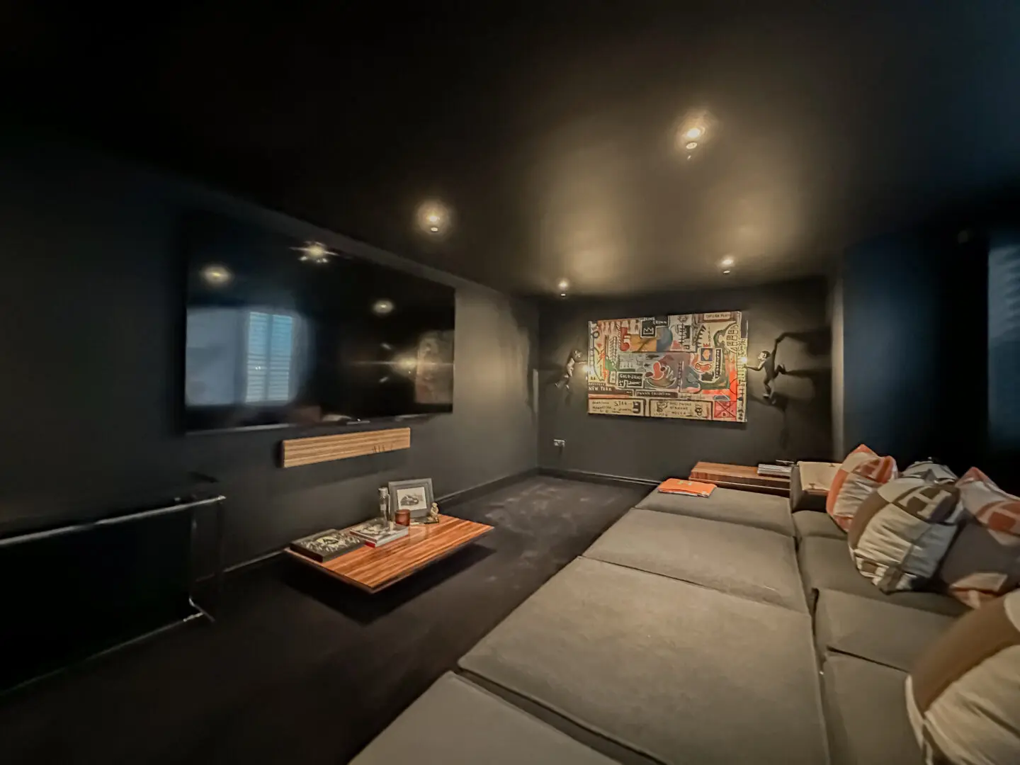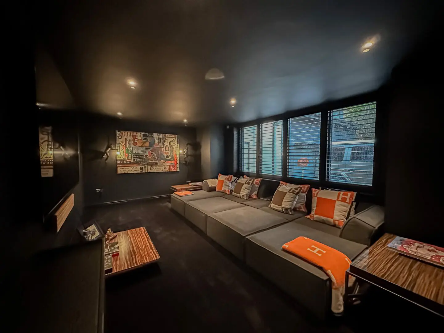 Upon entering, you are greeted by a grand triple height entrance hallway featuring a striking suspended landing and impressive double height windows. The ground floor offers a spacious lounge, a dedicated cinema room and a gym with bi-folding doors opening onto the beautifully landscaped rear garden. At the heart of the home lies the stunning open plan kitchen, living, and dining area, an expansive 1,100 square feet space showcasing a bespoke fitted kitchen and statement windows that create a perfect blend of elegance and functionality. Completing the ground floor are a cloakroom, W.C, plant room, utility room and an inner hallway leading to a shower room.