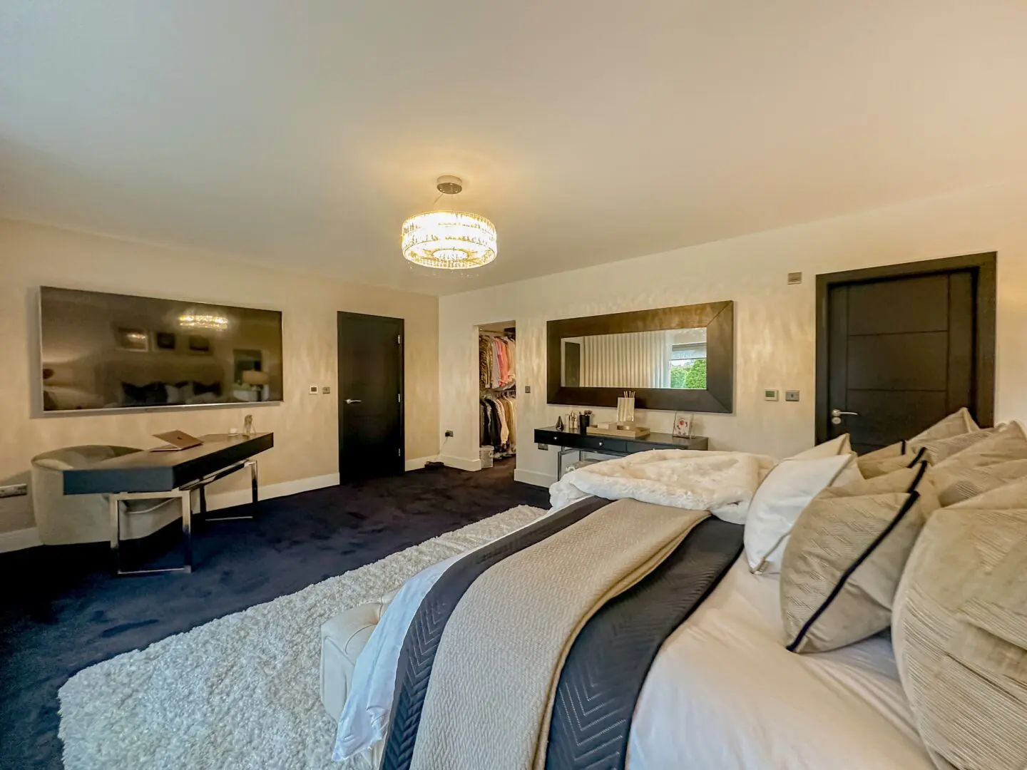 The first floor features the dramatic floating landing, giving access to the sumptuous master suite complete with dressing room and luxurious en suite bathroom. along with access to a further bedroom currently used as a walk in wardrobe. Two additional generous double bedrooms, each with their own dressing rooms and en suites are also located on this level. The second floor continues to impress, offering two further double bedrooms, again each benefiting from dressing rooms and en suite shower rooms. A large guest suite, situated above the garage and accessed via the inner hallway, provides ideal accommodation for visitors or extended family.