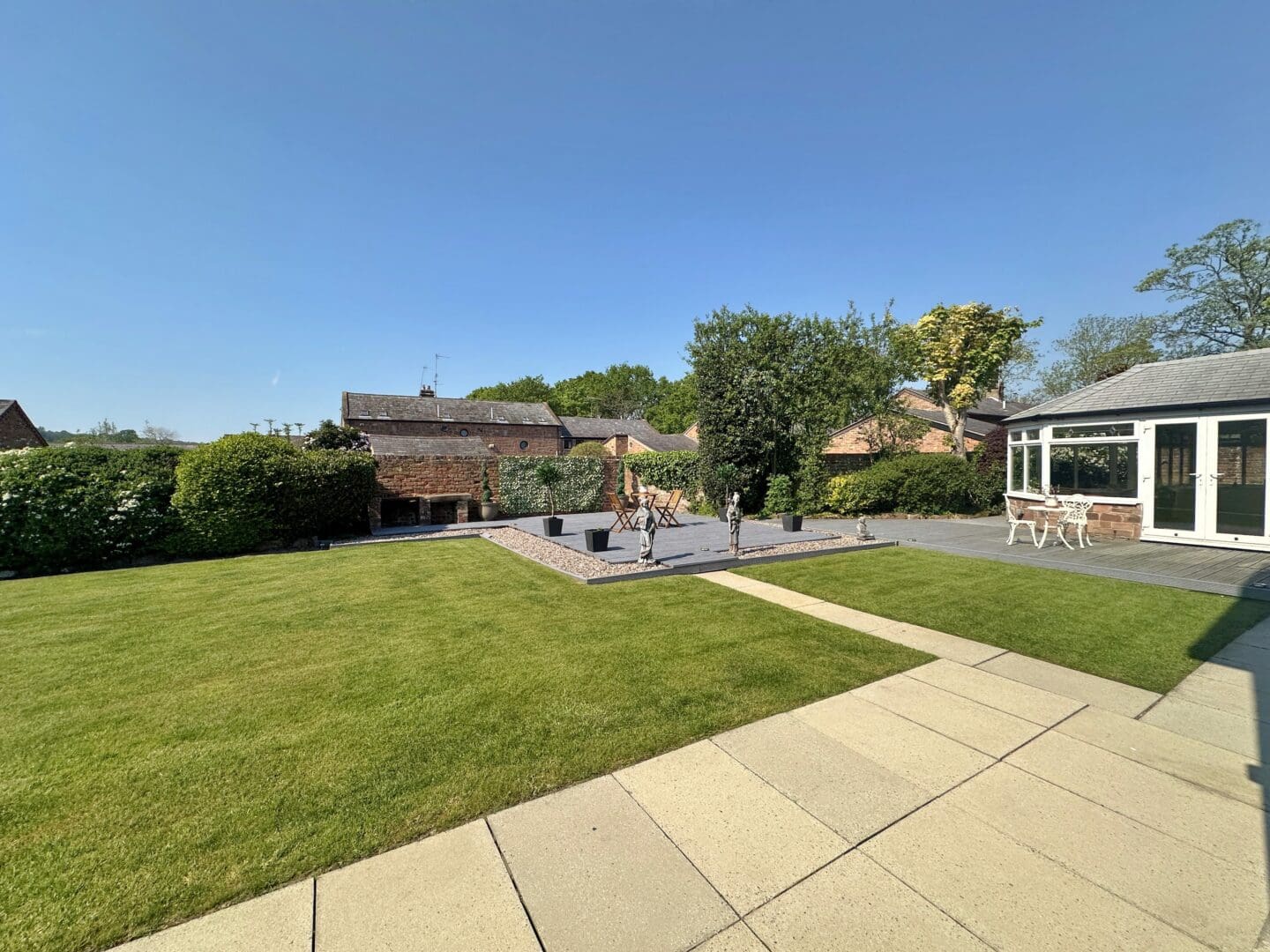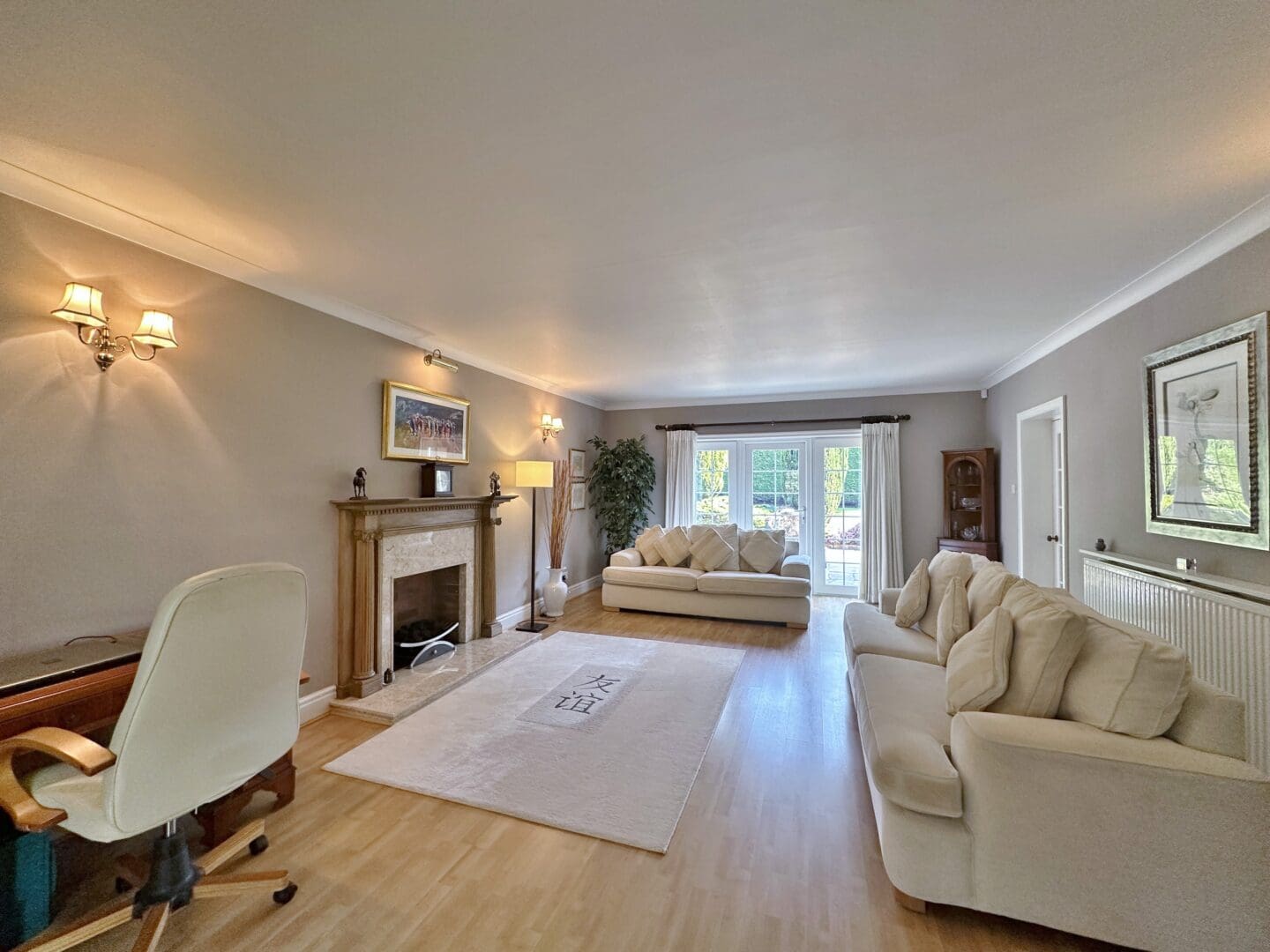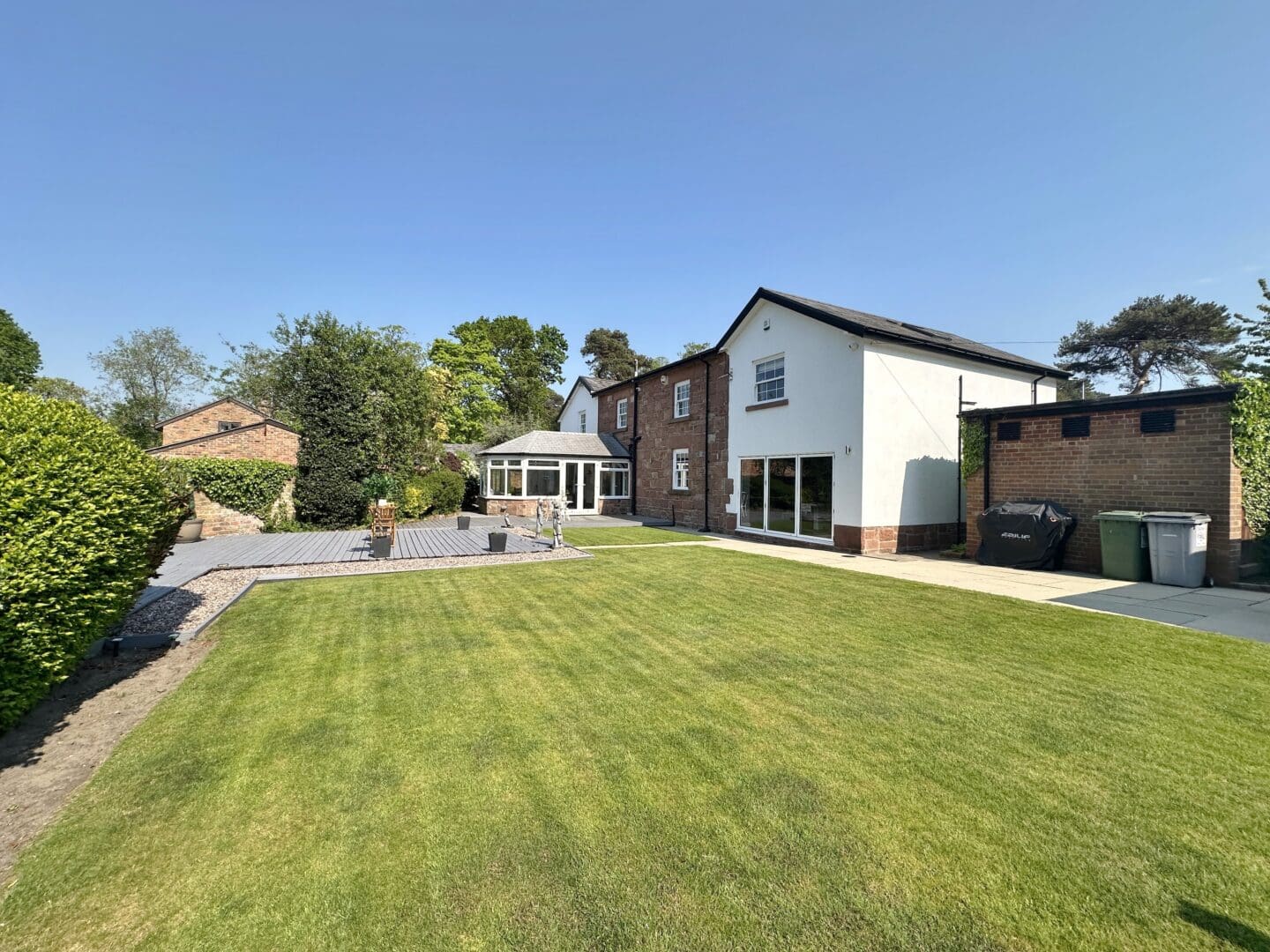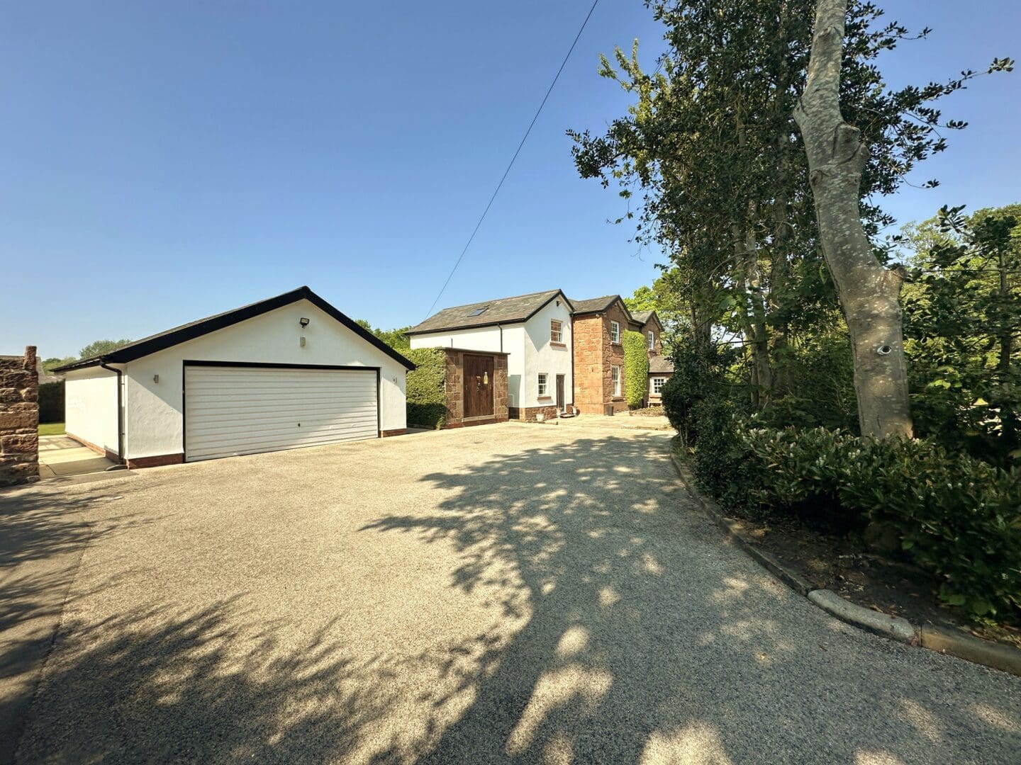 Accessed via a private driveway, the home includes a detached double garage and sits within extensive mature grounds. The rear garden enjoys a sunny southerly aspect and includes both decked and lawned areas, ideal for entertaining or relaxing in privacy.