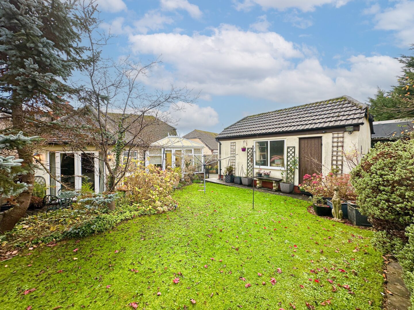 Entering via the porch, you are greeted into the property by an inviting entrance hall which leads through to a spacious dining room. Tastefully decorated featuring attractive wood style flooring, this presents a delightful setting for enjoying mealtimes with family and friends. The dining room is followed by a generous l-shaped lounge where the impeccable presentation continues. Enjoying French doors which provide seamless access out to the rear and flood the space with natural light, this provides a tranquil space to relax and unwind whilst enjoying views of the garden. Continuing through you will find a modern fitted kitchen which flows seamlessly into a conservatory, creating a social setting ideal for entertaining and cooking in company. The ground floor sleeping accommodation consists of two bright and generously sized double bedrooms, served by a deluxe fully tiled four-piece family bathroom suite. The first floor is dedicated to the beautifully presented master bedroom which is bathed in light courtesy of a skylight, and enjoys the added luxury of an ensuite WC.