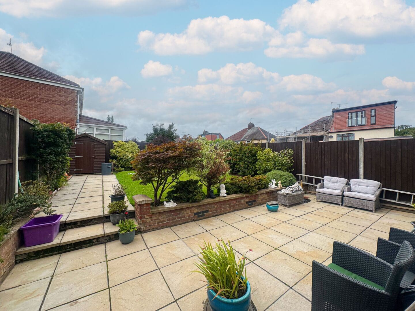 Externally, the property is further enhanced by a vast landscaped garden to the rear which provides an outdoor oasis for the whole household to enjoy. A neatly maintained lawn offers plenty of room for recreational activities, whilst a smartly flagged patio area presents a serene setting for al-fresco dining and entertaining. To the front, a substantial driveway provides ample off-road parking and a garage offers additional storage space.