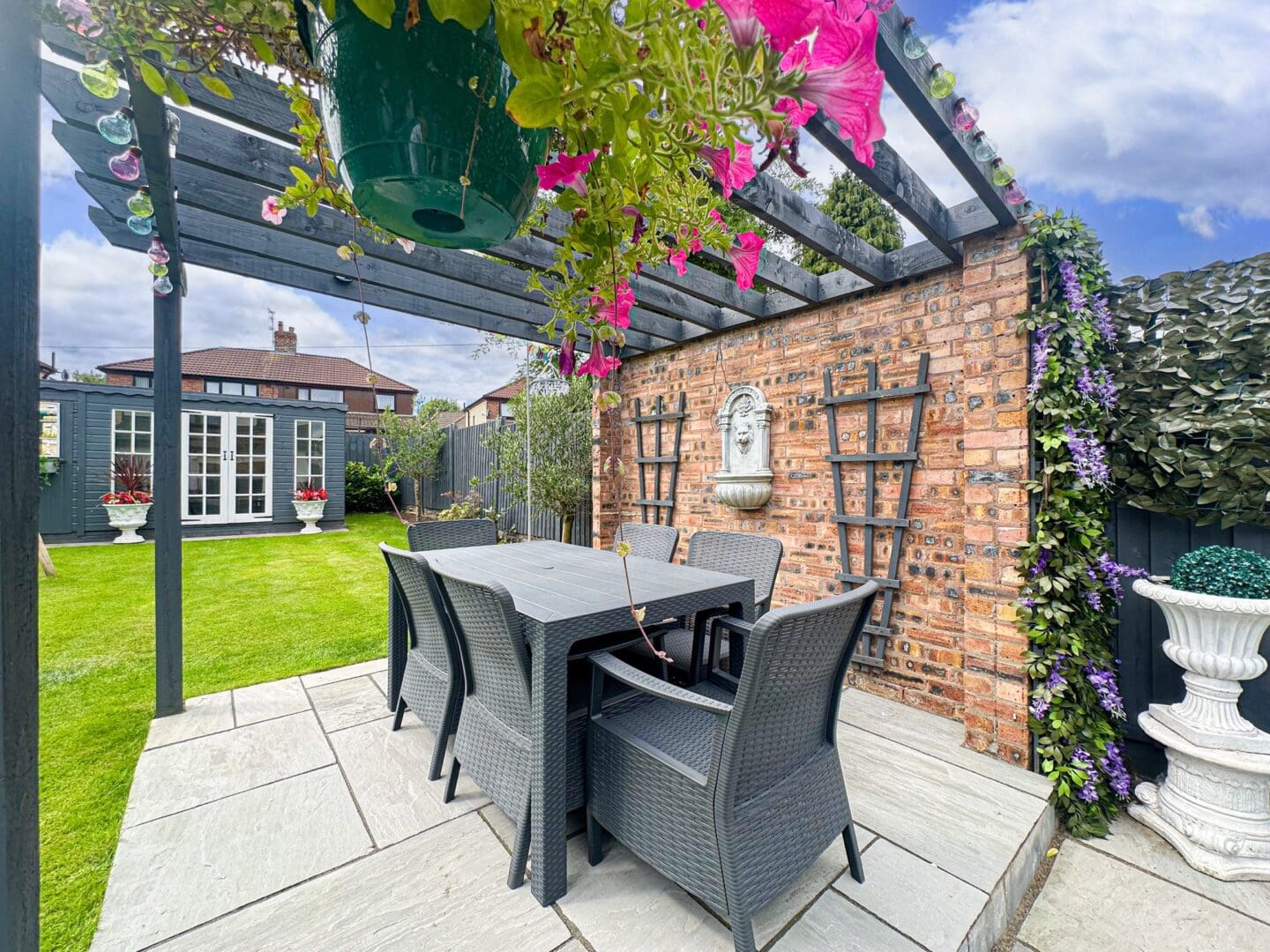 Externally, the property is further enhanced by a meticulously maintained landscaped rear garden which enjoys a sunny south facing aspect, providing a delightful outdoor space for the whole household to enjoy. A neatly manicured lawn offers plenty of room for recreational activities, a whilst a smartly flagged patio area presents a serene setting for al-fresco dining and entertaining. To the front, a substantial gated driveway provides ample off-road parking.