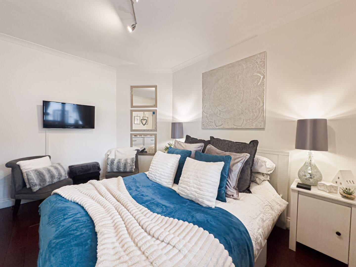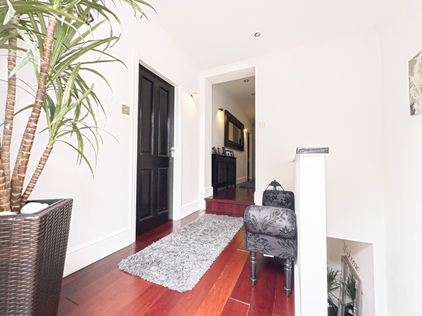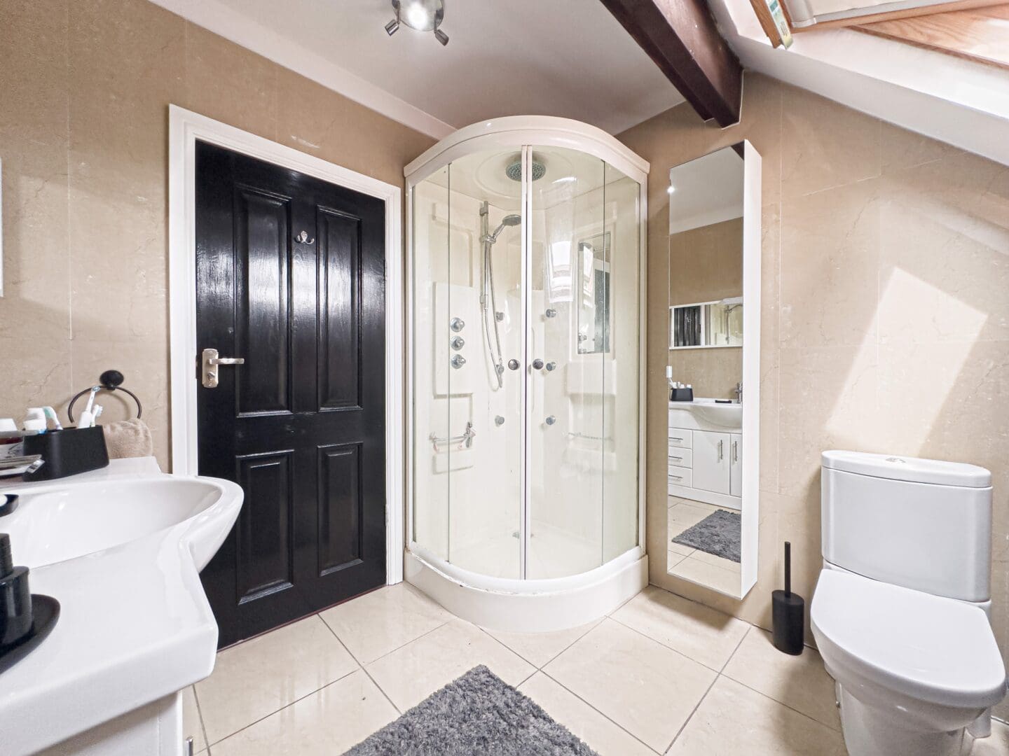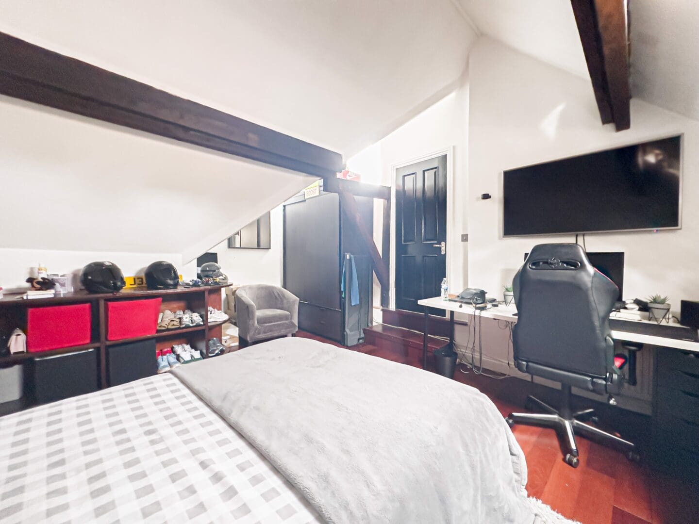 Ascending to the first floor, you will find three substantial double bedrooms, each impeccably presented featuring attractive wood style flooring throughout. The master bedroom enjoys the added luxury of a deluxe ensuite shower room, and serving the other bedrooms is a spectacular four-piece family bathroom suite boasting a roll-top bathtub and His and Hers sinks. The two remaining spacious bedrooms are found at the pinnacle of the property on the second floor, featuring characterful sloping ceilings and exposed beams, accompanied by a well-appointed shower room.