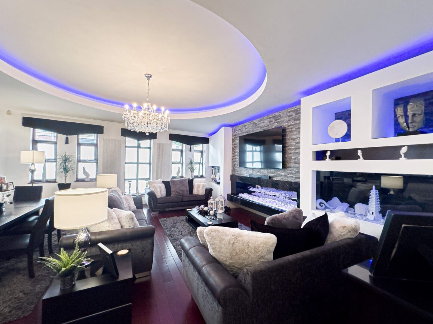 You are greeted into the residence by an inviting entrance hall which leads through to a spacious reception room, comfortably accommodating both a sitting and dining area. Finished in a striking contemporary décor, featuring an eye-catching fireplace, alcoves and mood lighting, this presents a fabulous entertaining space which is certain to make an impact. Following this is a stylish kitchen complete with a range of fitted base and wall units, granite worktops and integrated appliances. Featuring a centre island which incorporates a breakfast bar, this offers a social setting for cooking in company and enjoying family dining. Concluding the ground floor is a convenient utility room and WC.