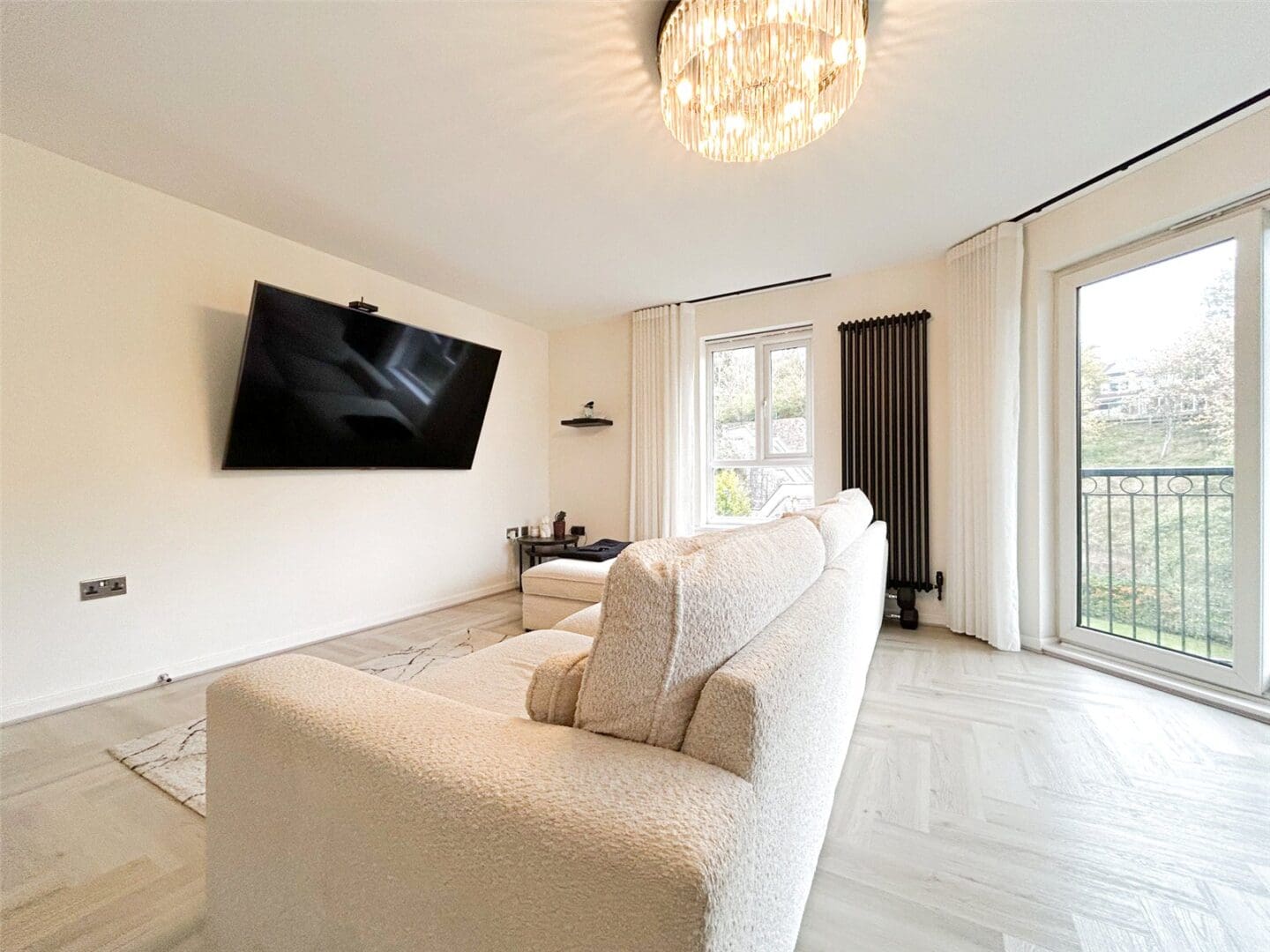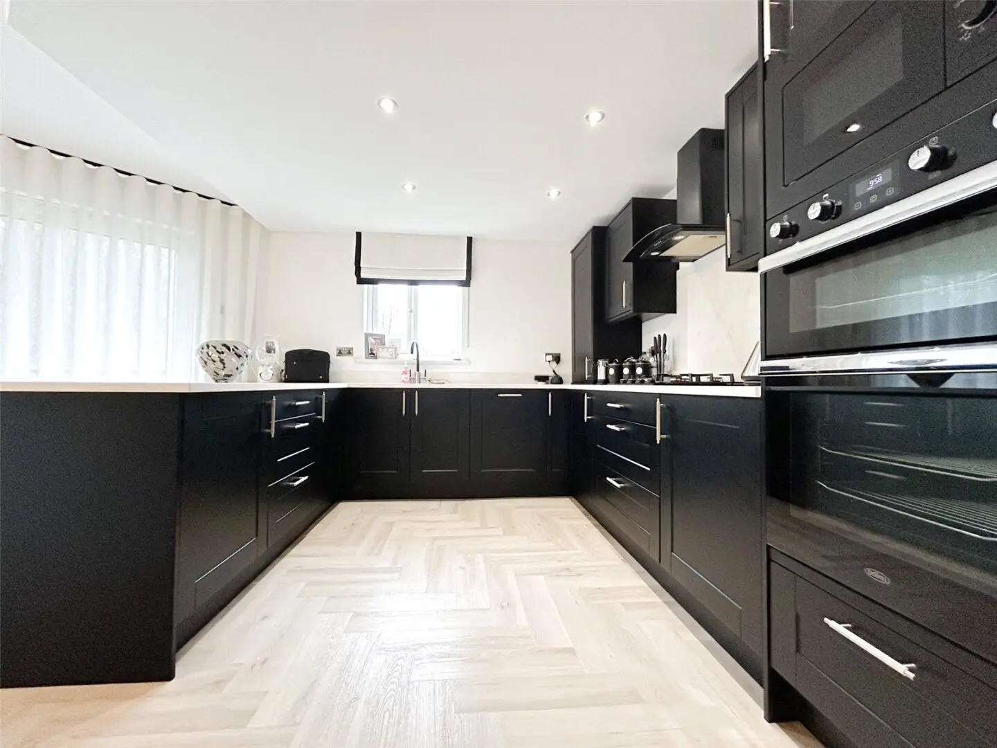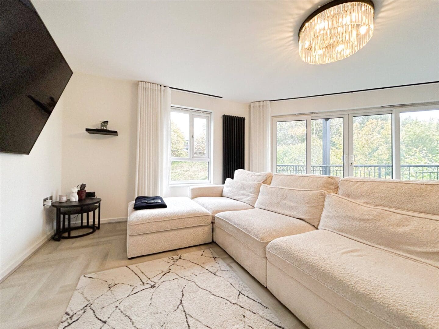 Step inside to find a spacious open-plan living and dining area, flooded with natural light from large windows, and complemented by a modern fitted kitchen with integrated appliances. The layout is ideal for both relaxing and entertaining, with clean lines and contemporary finishes creating a truly move-in-ready home.