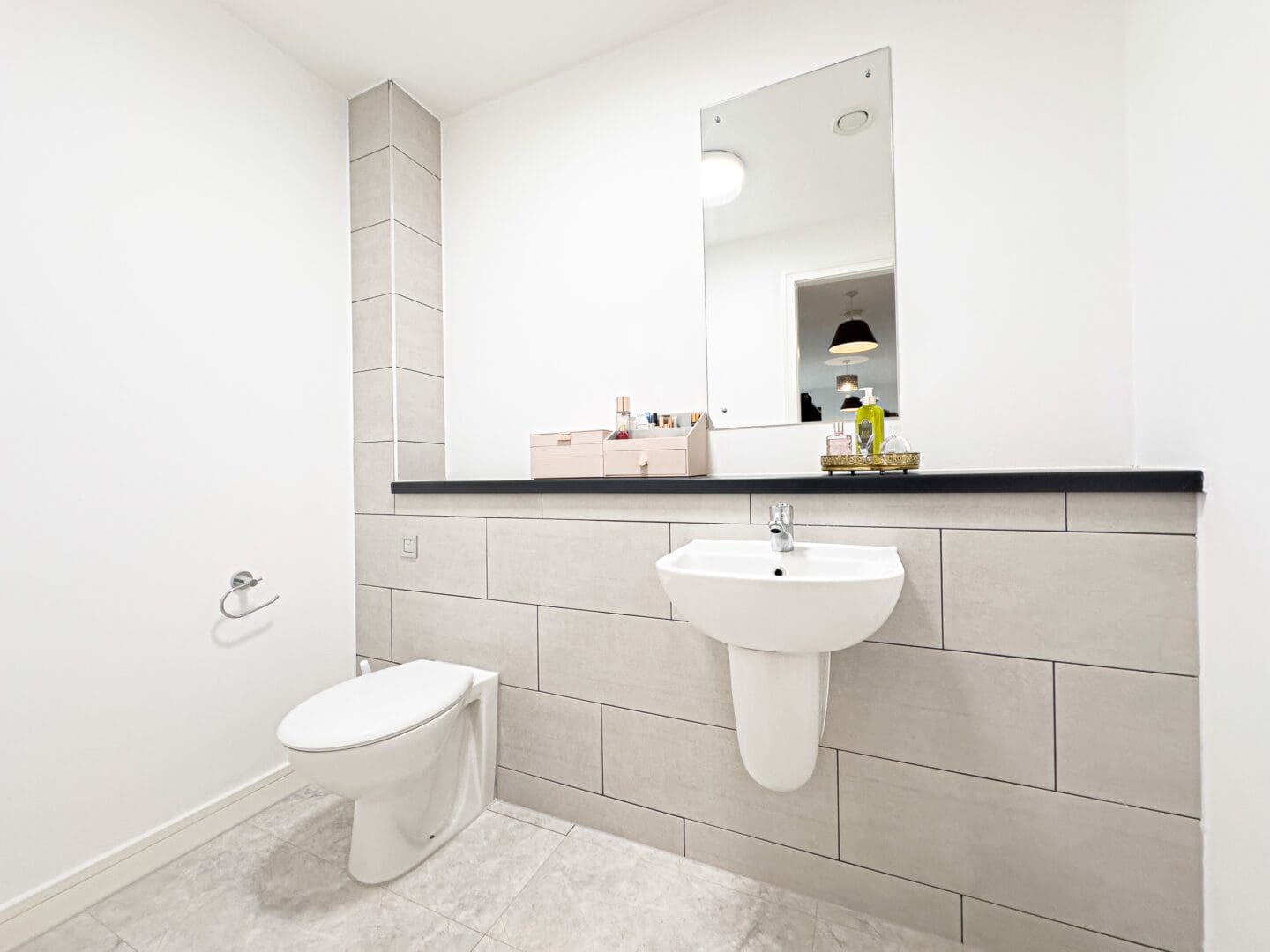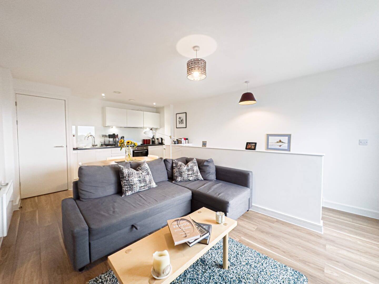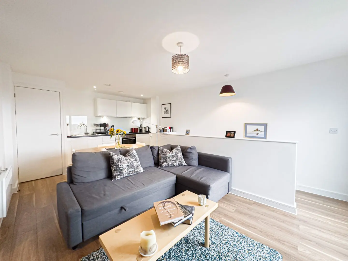 Ascend to the upper level, you will find the stunning open plan kitchen dining and living space, flooded with natural light and impeccably finished in a fresh contemporary décor throughout. The kitchen is complete with a range of stylish fitted units and complementary worktops, and with ample room to accommodate both a designated dining and sitting area, this presents a welcoming social setting for relaxing and entertaining. Adding the finishing touch to the interior of the apartment is a convenient separate WC, ideal for visitors.