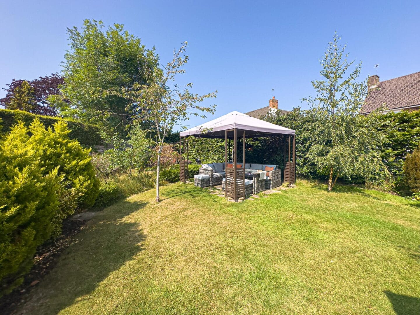 Externally, the residence is further enhanced by a private rear garden which wraps around the property, providing an outdoor oasis for the whole household to enjoy. A neatly manicured lawn offers plenty of room for recreational activities, surrounded by established greenery borders, whilst an enclosed stone patio area and paved seating area present serene spots for al-fresco dining and entertaining. To the front, a further beautifully maintained garden area adds to the property’s kerb appeal, whilst a slate chip in-and-out driveway provides ample off-road parking, and a double length tandem garage offers an abundance of additional storage space.