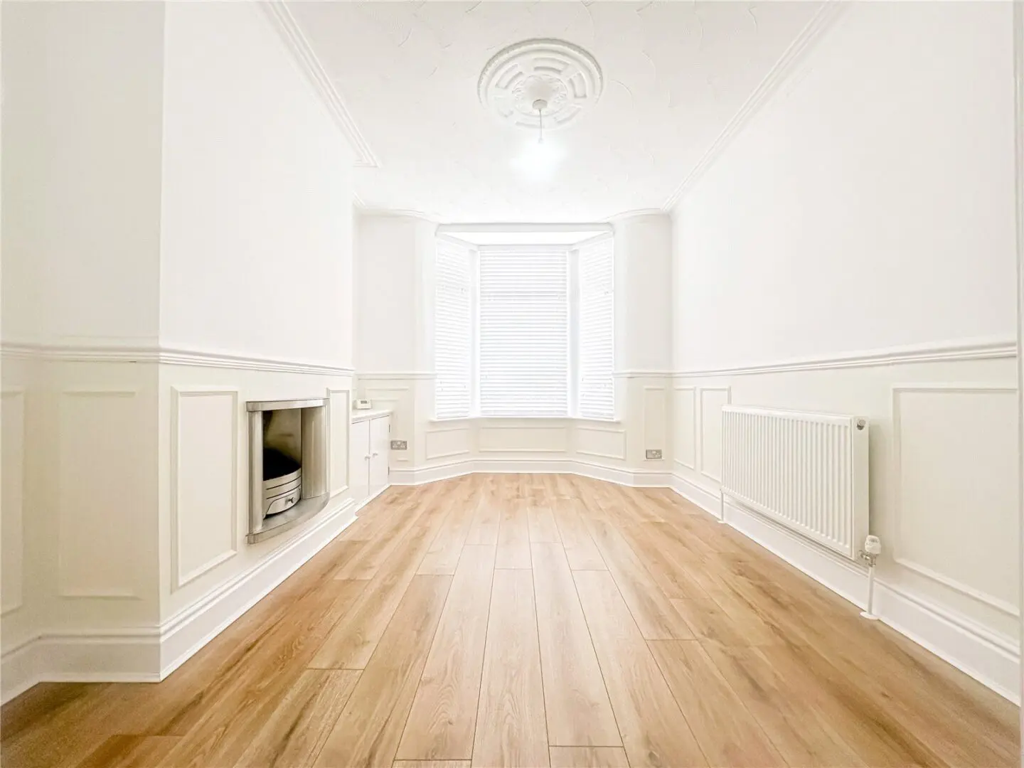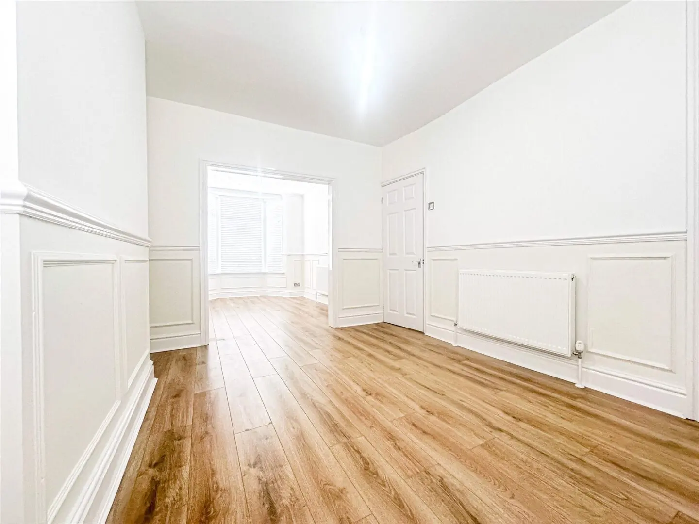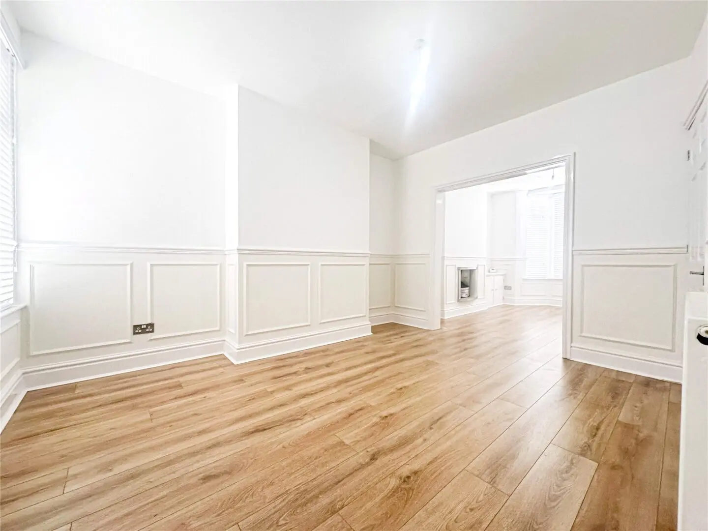 Upon entering, you’re welcomed by a bright entrance hallway that leads into a spacious bay-fronted lounge, bathed in natural light and finished in a calming neutral palette with elegant wall panelling and wood-effect flooring. This inviting space flows effortlessly into a second reception room—ideal for dining or entertaining—followed by a sleek, modern kitchen complete with a range of fitted units and complementary worktops.