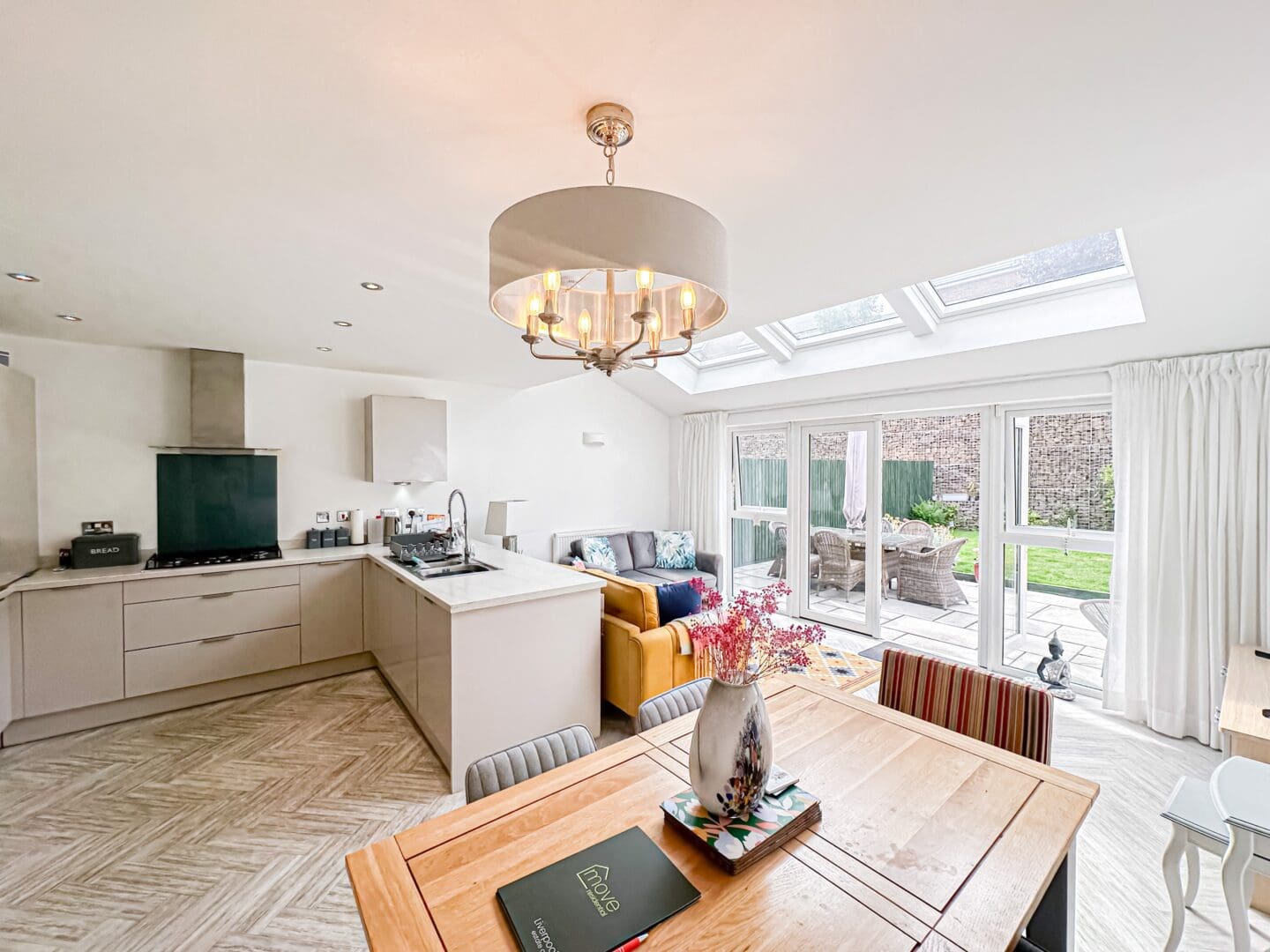 An inviting entrance hall greets you into the property, leading through to a bright and spacious family lounge which has been beautifully finished in a tasteful décor featuring plush carpeting, presenting a welcoming setting to relax and unwind. Following this is a sensational open plan kitchen dining and living area which is certain to impress even the most discerning of buyers. Evidently finished to high specifications, this room boasts attractive parquet style flooring throughout and enjoys French doors which provide seamless access out to the garden, along with skylights flooding the space with natural light. The kitchen is complete with a range of stylish fitted base and wall units, complementary worktops, and a selection of sleek integrated appliances. With ample room to accommodate a designated sitting and dining area, this presents the ultimate social setting for enjoying family mealtimes and entertaining on a larger scale. Concluding the ground floor is a well-equipped utility room and a convenient WC.