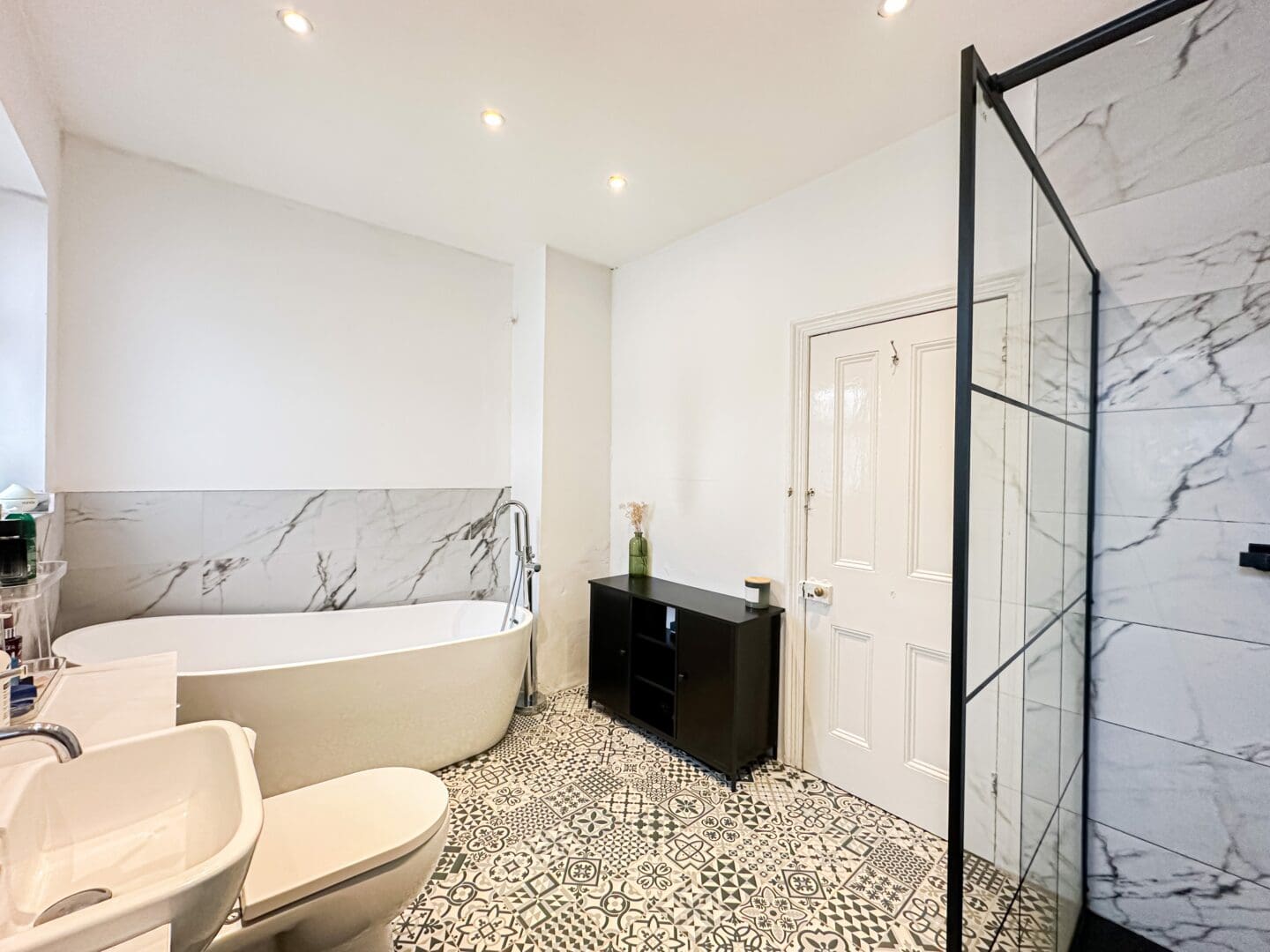 Ascending to the first floor, you will discover three generous bedrooms, each beautifully presented, accompanied by a luxurious four-piece family bathroom suite featuring a freestanding bathtub and walk-in shower unit.