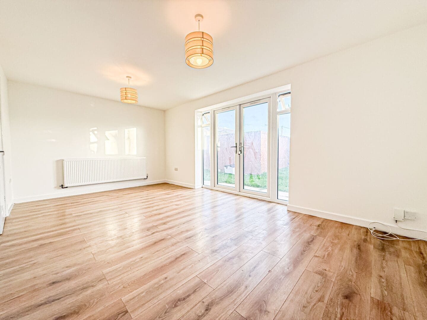 An inviting entrance hall greets you into the property, leading through to a generous kitchen diner complete with a range of modern fitted base and wall units, complementary worktops, and ample room to accommodate a dining table, providing a social setting for enjoying family mealtimes and cooking in company. To the rear of the property is a spacious living room finished in a fresh neutral décor featuring attractive wood style flooring. Boasting french doors which provide seamless access to the garden and flood the room with natural light, this presents a welcoming and tranquil space for relaxing and entertaining guests. Concluding the ground floor is a convenient WC.