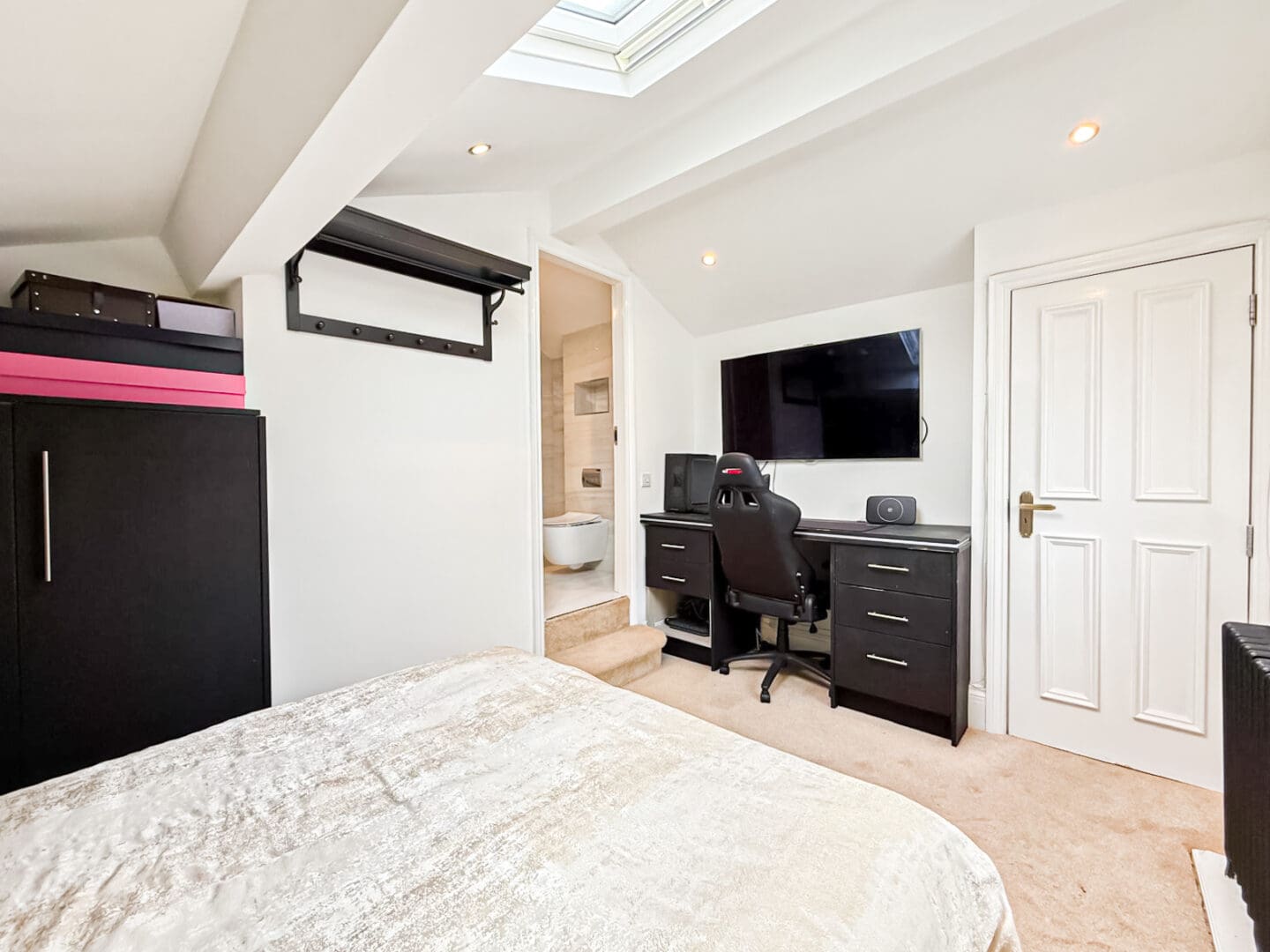 The sleeping accommodation consists of three bright and generously sized double bedrooms set over the first and second floors, all finished to an immaculate standard featuring plush carpeting throughout, and receiving an abundance of natural light. Each bedroom enjoys the added luxury of a deluxe ensuite bathroom, providing convenience for busy families and visitors.