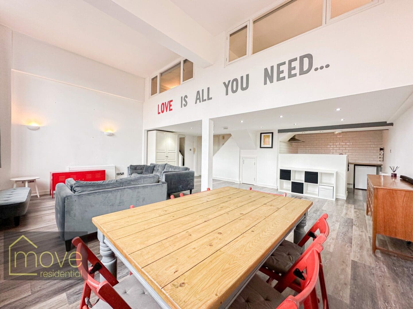 The property is accessed via a lift through a well-maintained communal entrance, with the apartment itself centring around an impressive open plan living and dining area, with a double height ceiling and huge original sash windows, this bright and airy space is flooded with natural light. Featuring a tasteful neutral décor, this vast and versatile room presents the ideal social setting, offering an abundance of possibilities for future occupants. The modern kitchen is complete with sleek fitted base units, wood style worktops providing plentiful surface space, and subway tile splashbacks. Completing this floor is a contemporary style three-piece family bathroom suite.