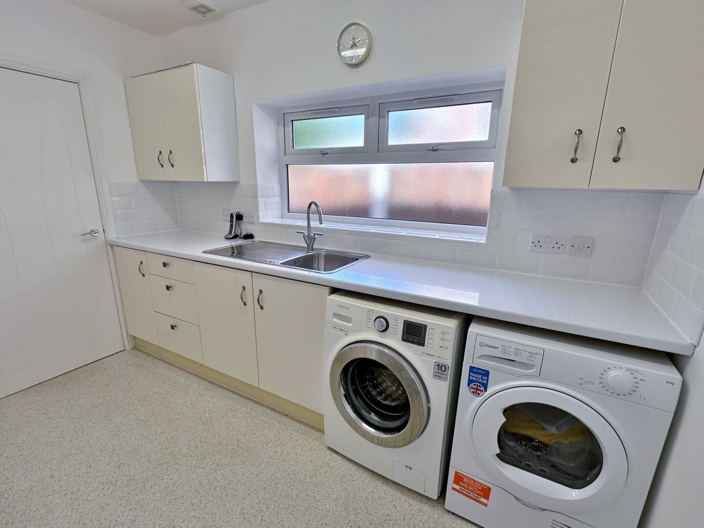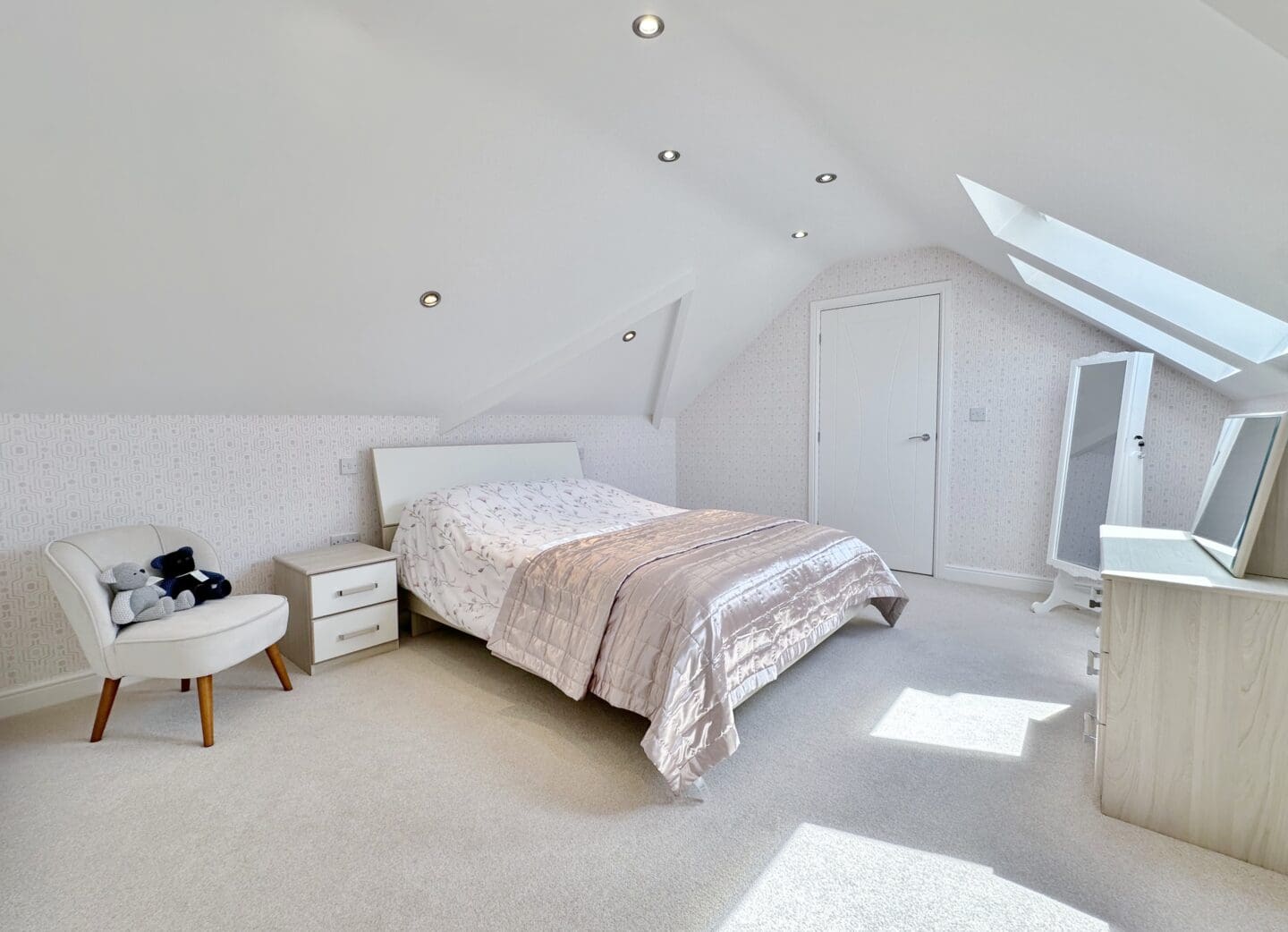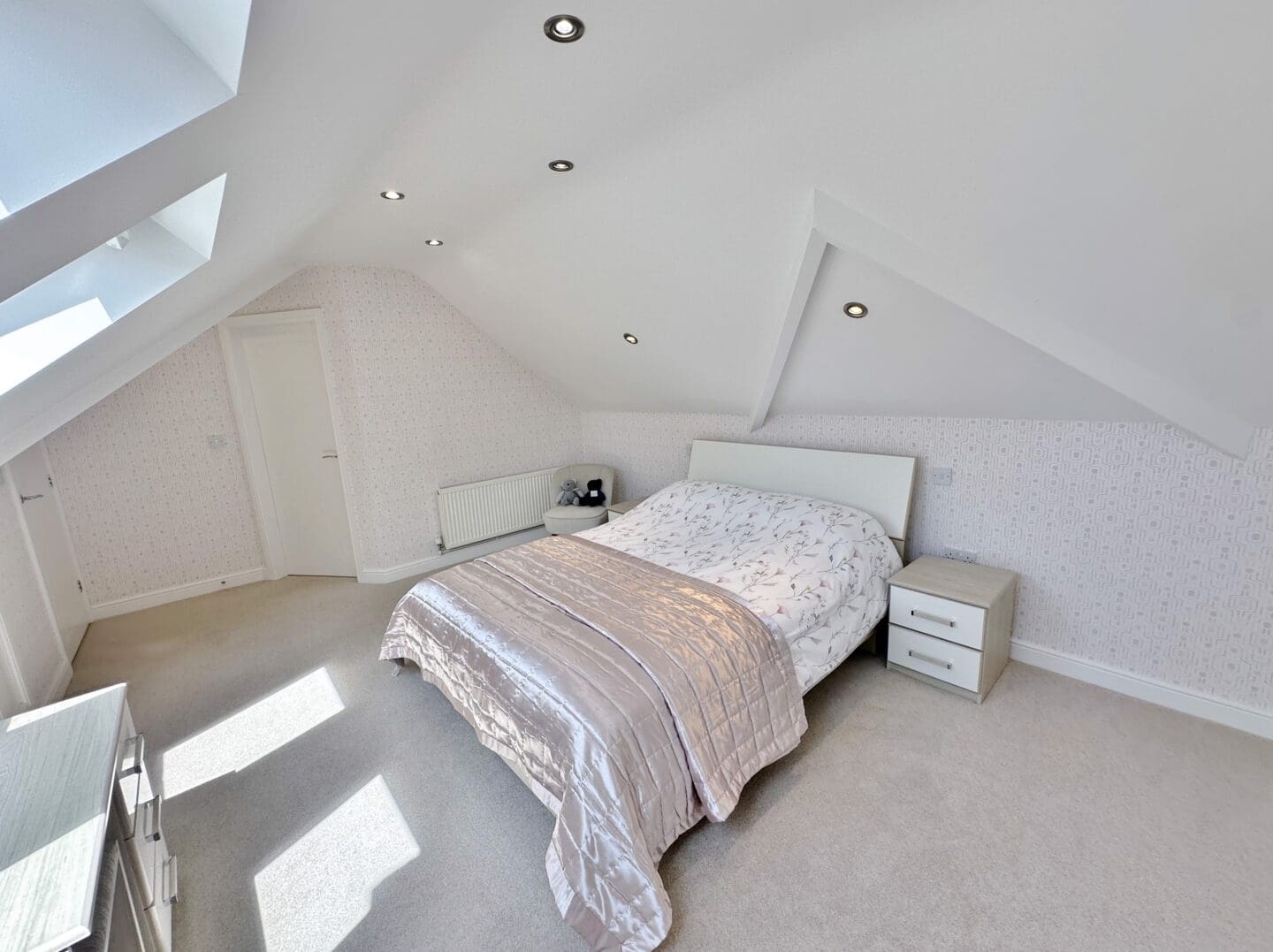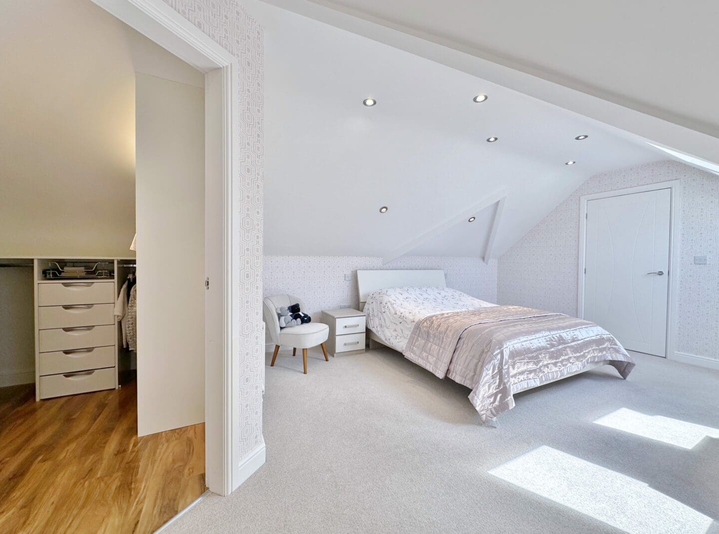 The kitchen is sleek and contemporary, with clean lines, premium integrated appliances, and a stylish breakfast bar. Bi-fold doors stretch across the rear, connecting the main living space to the beautifully landscaped garden and creating a seamless indoor/outdoor lifestyle. One of the most distinctive features is the private indoor pool room, enclosed in full height glass panels that overlook the garden, whether used for daily exercise or relaxing weekends, it’s a rare luxury that sets this home apart. The ground floor also offers exceptional accessibility. A purpose designed main suite includes built in storage and a large en suite bathroom. A second double bedroom, wide hallways, a spacious utility area, and convenient internal access to the garage enhance the home’s flexibility and everyday comfort.