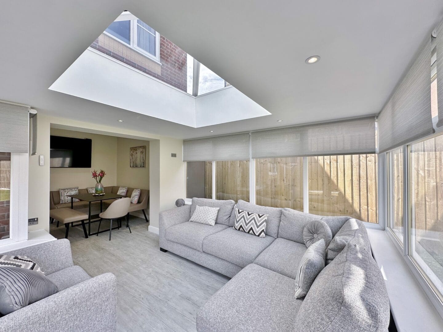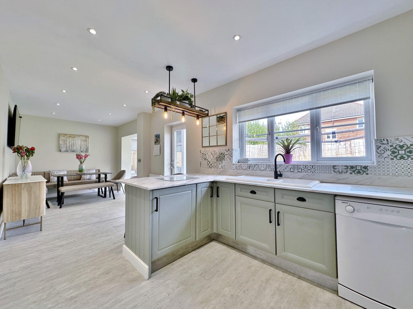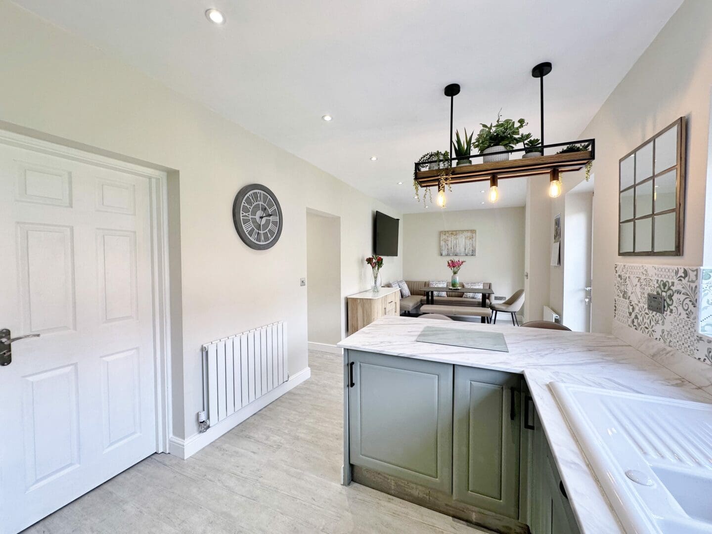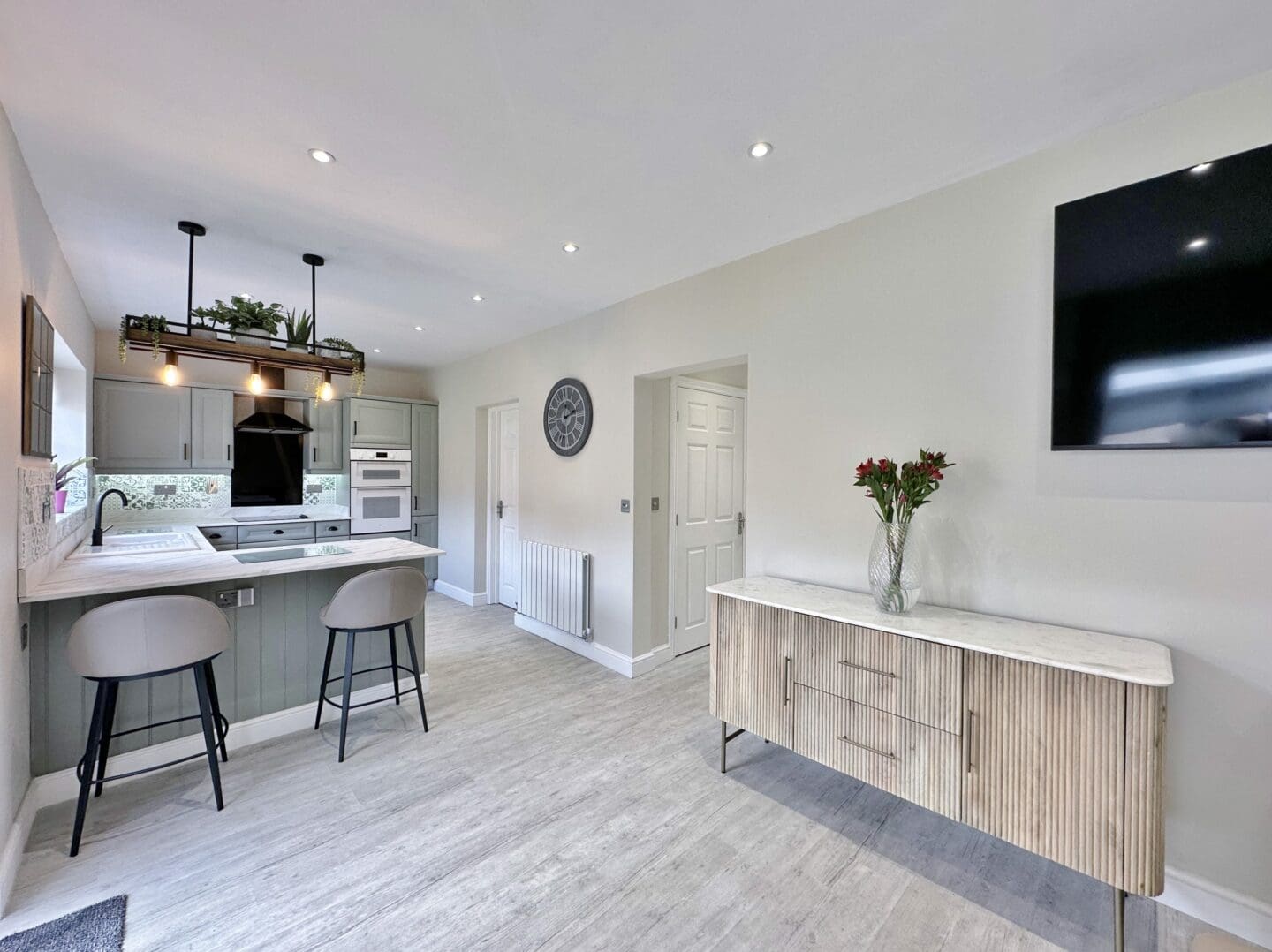 The spacious entrance hallway leads to a convenient downstairs W.C. and a beautifully styled bay fronted lounge, complete with a feature fireplace that adds charm and character. At the heart of the home lies a spectacular open plan kitchen and dining area, fitted with a bespoke range of wall and base units that seamlessly combine function and elegance. This space flows effortlessly into a bright orangery, topped with a striking sky lantern and offering lovely views over the rear garden, an ideal spot for entertaining or relaxing with family. Upstairs, the master bedroom benefits from a private en-suite shower room, while three further well proportioned bedrooms are served by a luxurious four piece family bathroom, featuring a free standing bath and a sleek walk in shower.