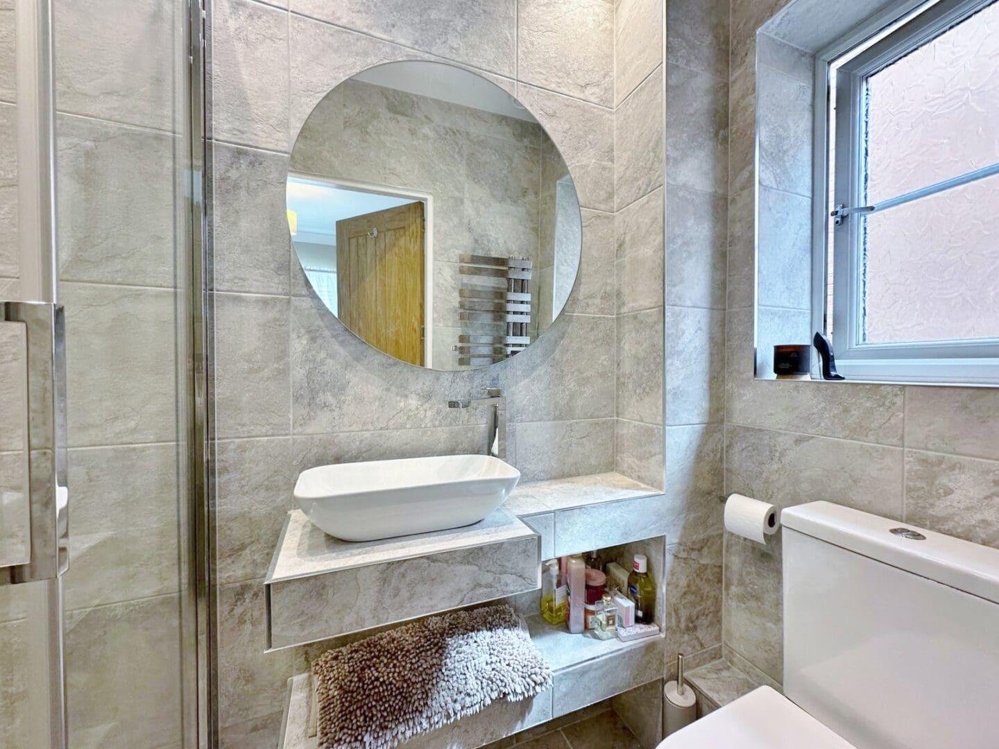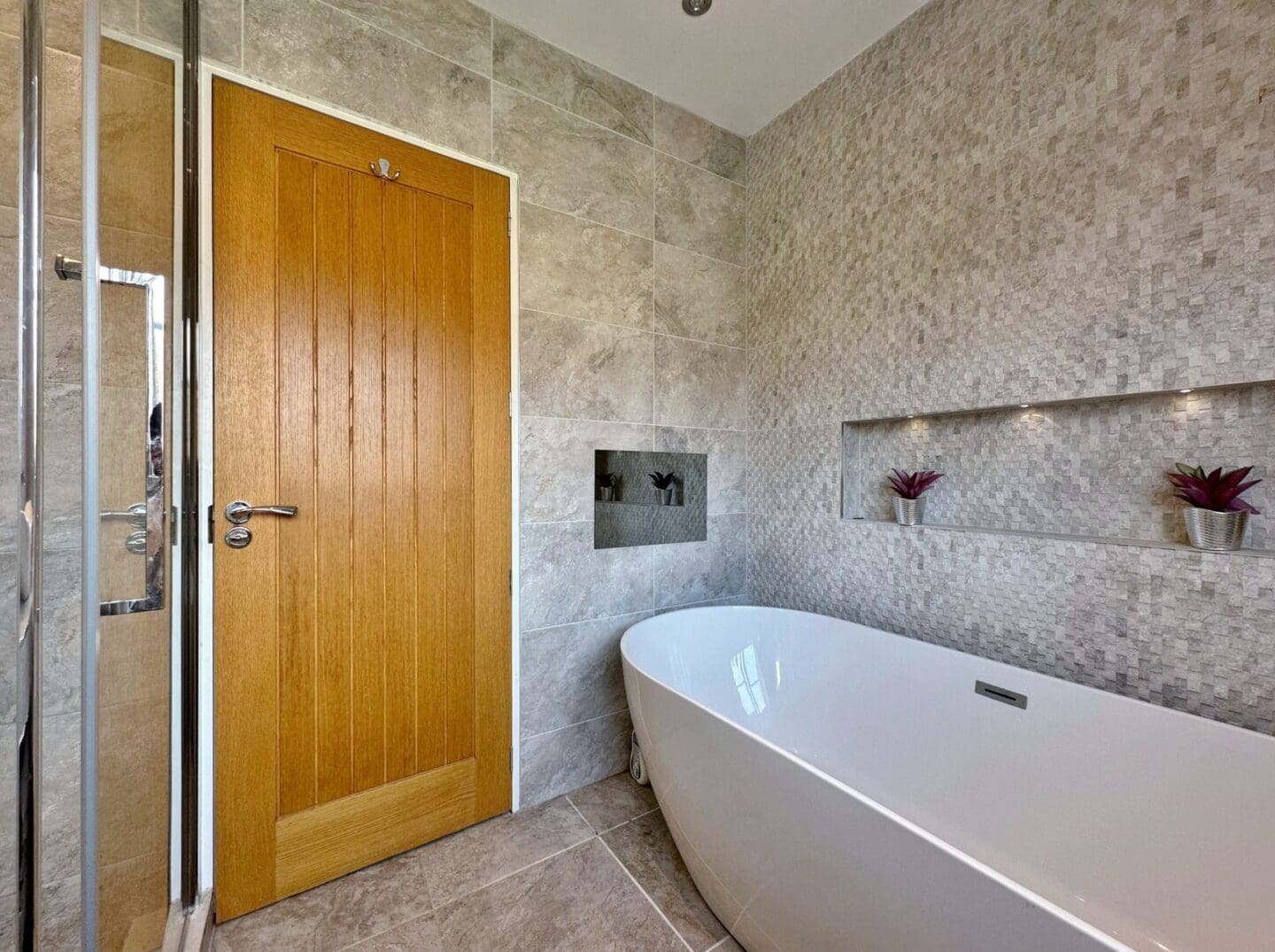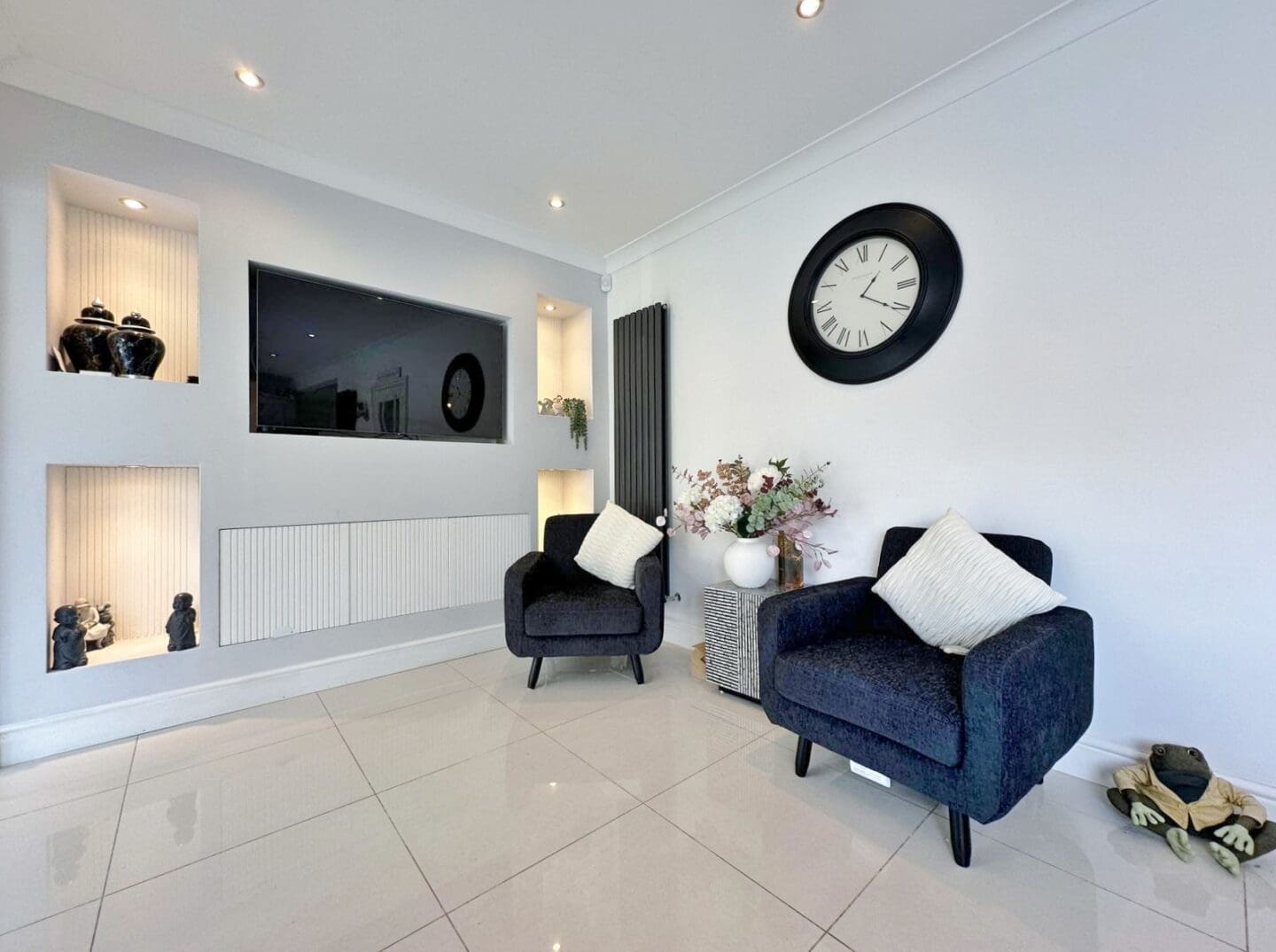 Upstairs, four generously sized bedrooms await, including a luxurious master with en-suite. The main bathroom is nothing short of spectacular, featuring a freestanding bath, Porcelanosa designer tiles, underfloor heating, a waterfall shower, and even a Waterview wall-mounted TV with Fire Stick. Additional highlights include a recently installed Worcester Bosch boiler and designer radiators, a solid oak staircase, FENSA-certified replacement windows and doors, plush new carpets, cavity wall insulation, and a sleek three-car resin-bound driveway edged with sandstone brick.