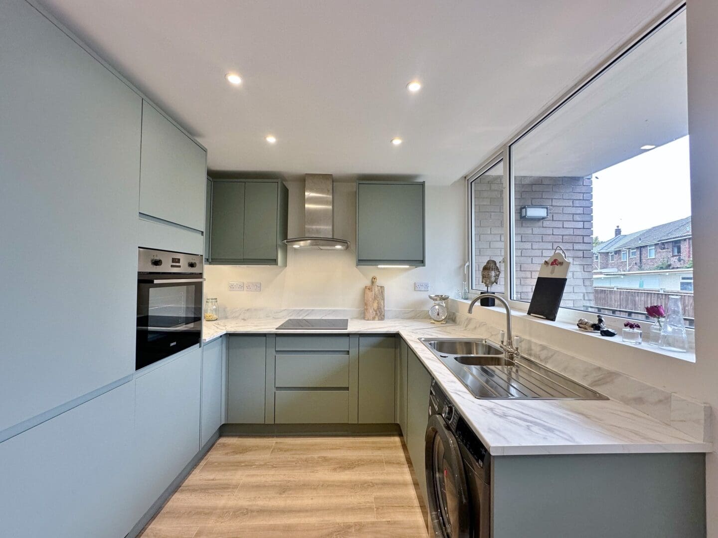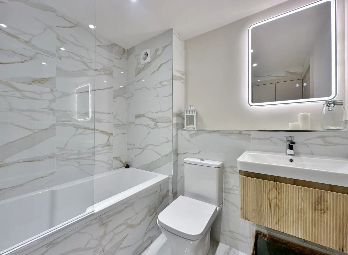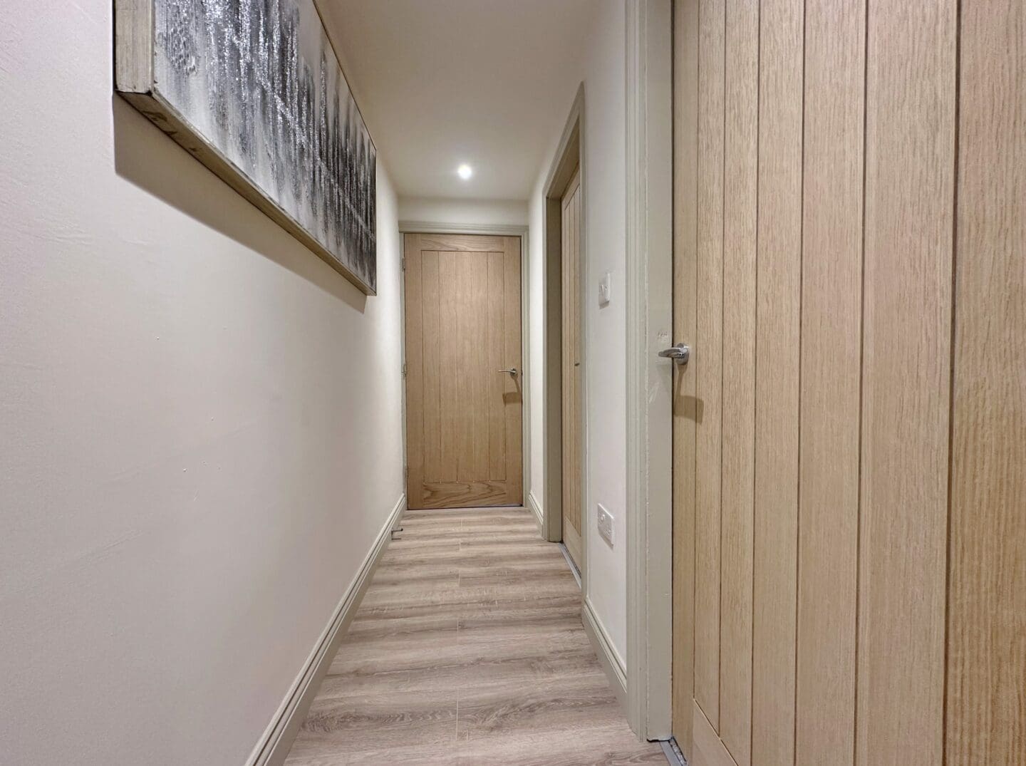 The entrance sets the tone immediately, with a newly fitted front door leading into a bright and inviting open plan living space. The lounge, dining, and kitchen areas flow effortlessly together, combining comfort and modern design. The sleek kitchen features integrated appliances and plenty of workspace, while the layout easily accommodates both a large sofa and dining set along with a door opening onto a private, non overlooked balcony, an ideal spot for morning coffee or quiet evenings outdoors. Both bedrooms are generously sized and benefit from built in wardrobes, continuing the high quality feel found throughout. The bathroom has been elegantly redesigned with a modern three piece suite, marble effect tiling, a storage cupboard, and a contemporary LED touch screen mirror that adds a luxury touch.
