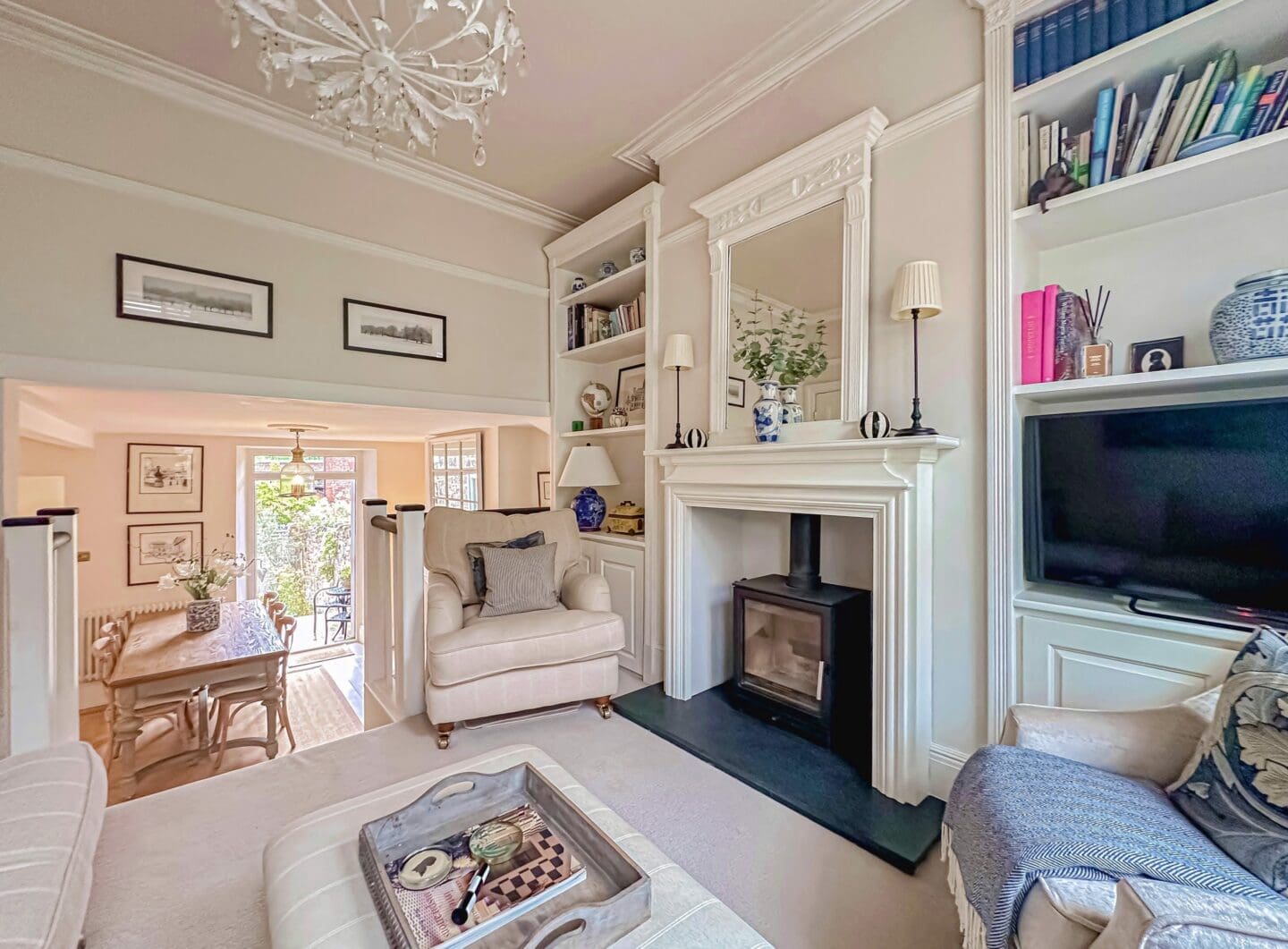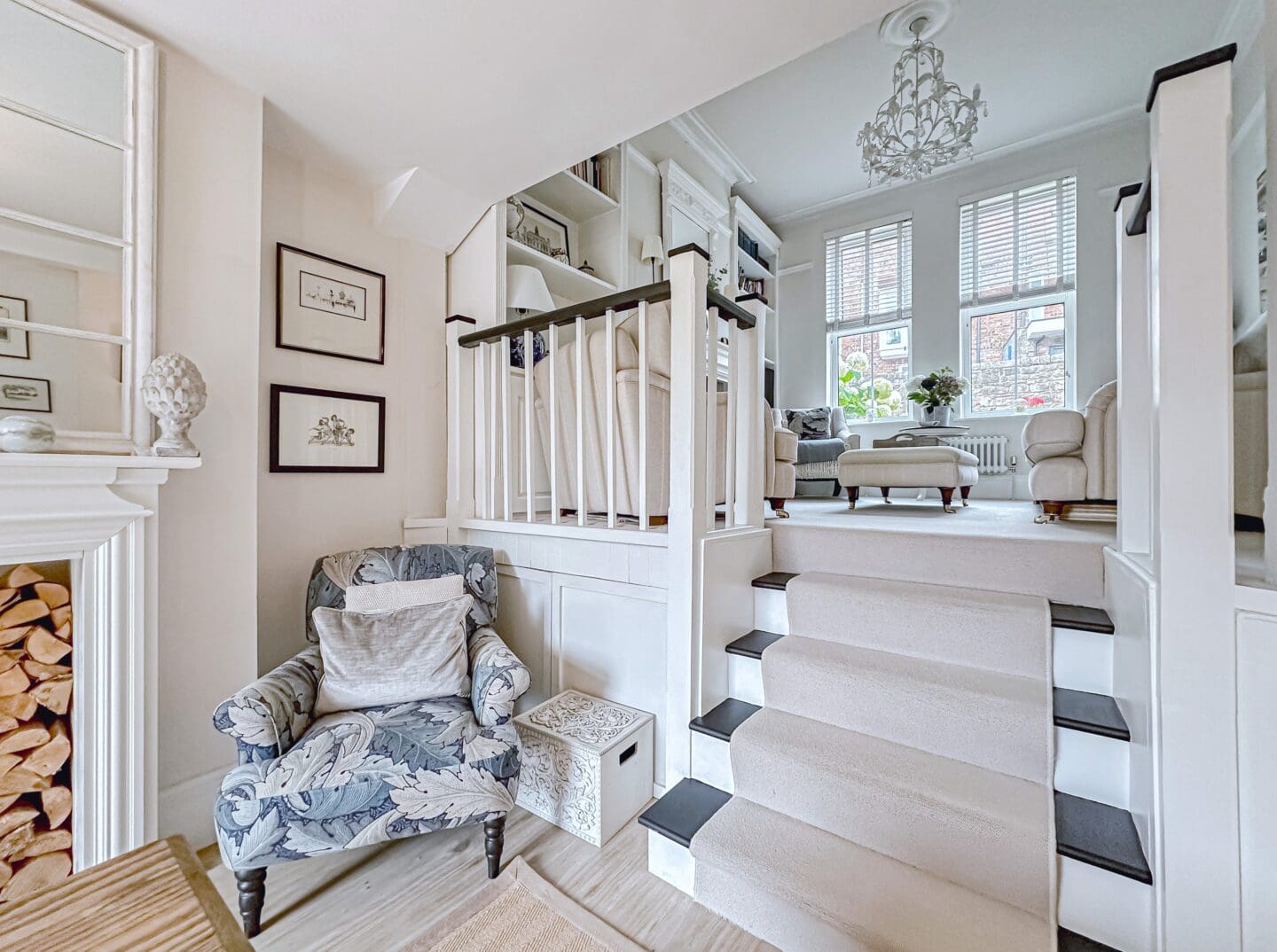 The accommodation is arranged over three spacious and beautifully appointed floors. The ground floor welcomes you with a bright and inviting hallway leading into a front reception room, where a feature log burning fireplace and expansive windows create a warm and airy atmosphere. From here, steps guide you into a second generously proportioned reception room, complete with bespoke built in furniture and direct access to the private rear courtyard through elegant patio doors. Continuing down, the stylish kitchen is fitted with custom cabinetry that echoes the character of the home, while offering a full range of integrated appliances and a well designed layout ideal for modern living.