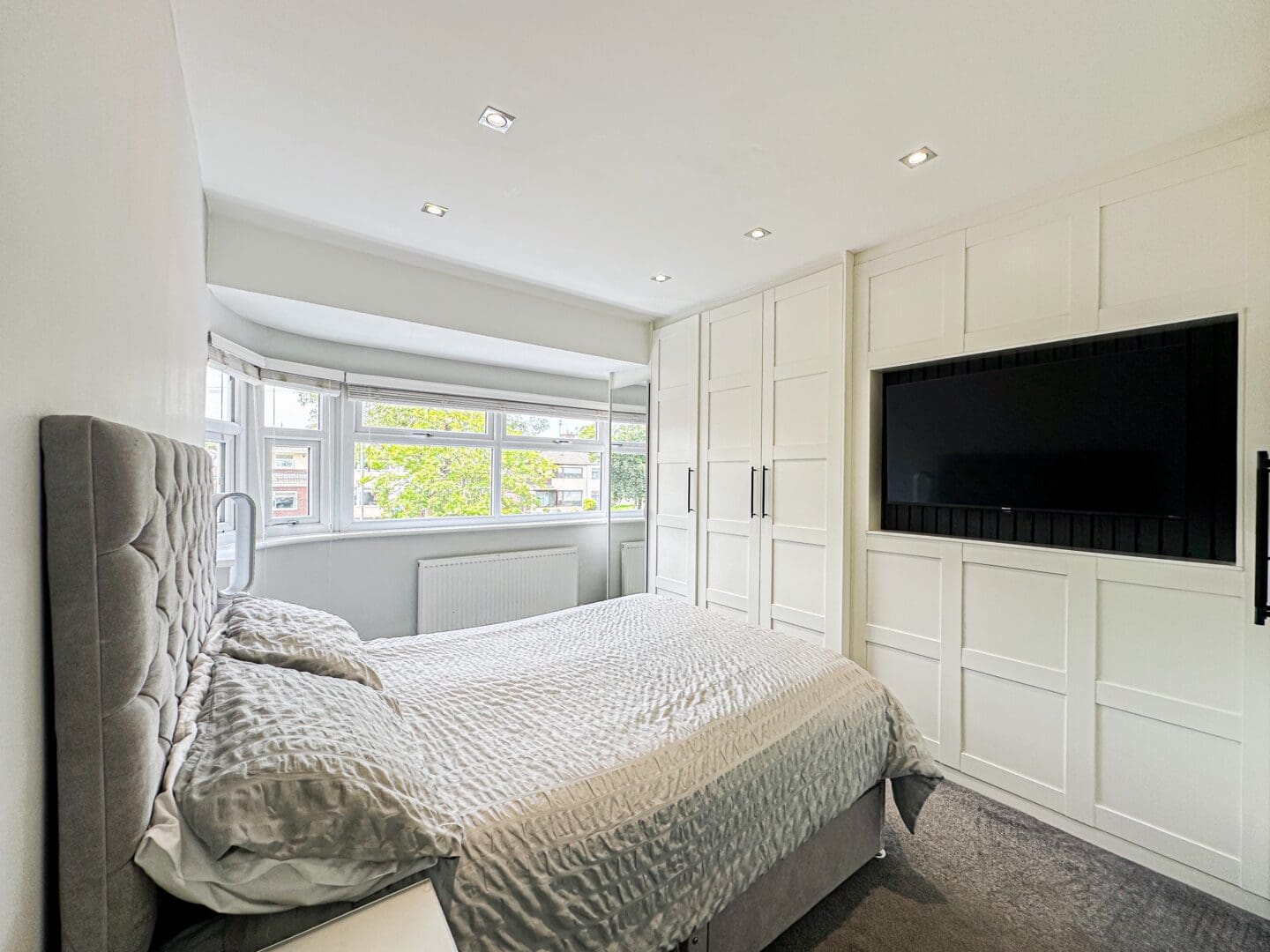 A striking entrance hall greets you into the property, featuring attractive parquet style flooring which continues throughout the ground floor, and leading you through to a spacious family lounge. Enjoying a bay window which floods the space in natural light, and a finished in a fresh contemporary décor featuring an eye-catching media wall, this presents a welcoming and stylish space to relax and unwind. At the heart of the home is a showstopping extended open plan kitchen diner which is certain to impress even the most discerning of buyers, boasting French doors to the rear providing seamless access to the garden, and skylights above illuminating the room in daylight. The kitchen is complete with a range of sleek fitted base and wall units, complementary worktops providing plentiful surface space, and a selection of integrated appliances. There is a spectacular centre island which incorporates a breakfast bar, providing the ideal spot for more casual dining, and with ample room to accommodate a dining table, this presents the ultimate social setting, equally suited to enjoying family mealtimes and entertaining on a larger scale. Concluding the extensive ground floor is a convenient WC.