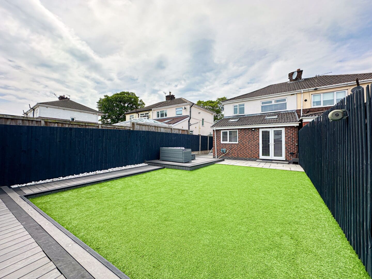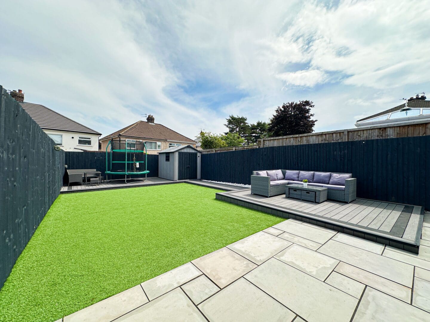 Externally, the property is further enhanced by a delightful rear garden, consisting of a low-maintenance artificial lawn, as well as raised decking and flagged patio areas presenting perfect spots for al-fresco dining and entertaining. To the front, a substantial driveway provides ample off-road parking.