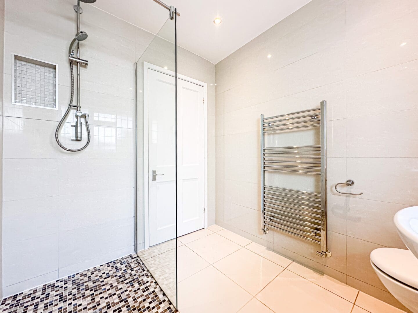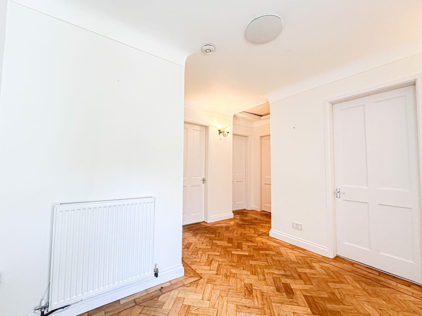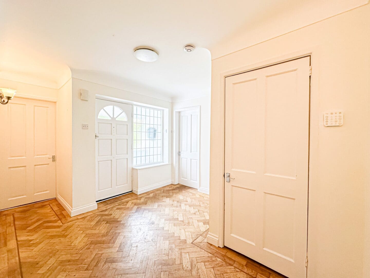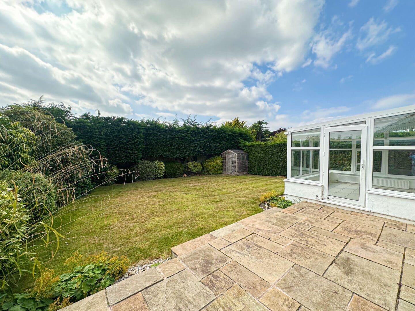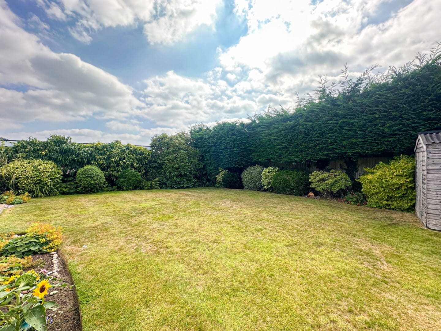 Externally, the property further benefits from a meticulously maintained rear garden surrounded by established greenery borders offering privacy and seclusion. Consisting of a neatly manicured lawn and a raised patio area, this presents a serene spot for al-fresco dining and entertaining. A further attractive garden area to the front enhances the property’s kerb appeal, whilst a sizable driveway provides ample off-road parking, and a garage offers additional storage space.