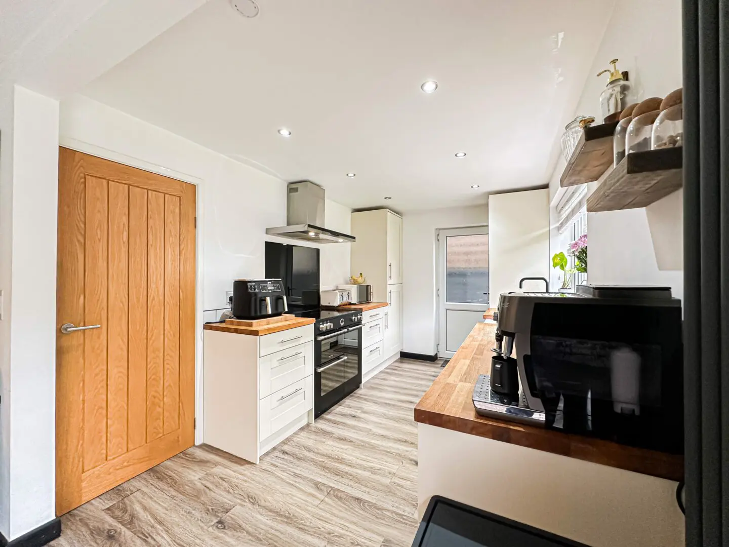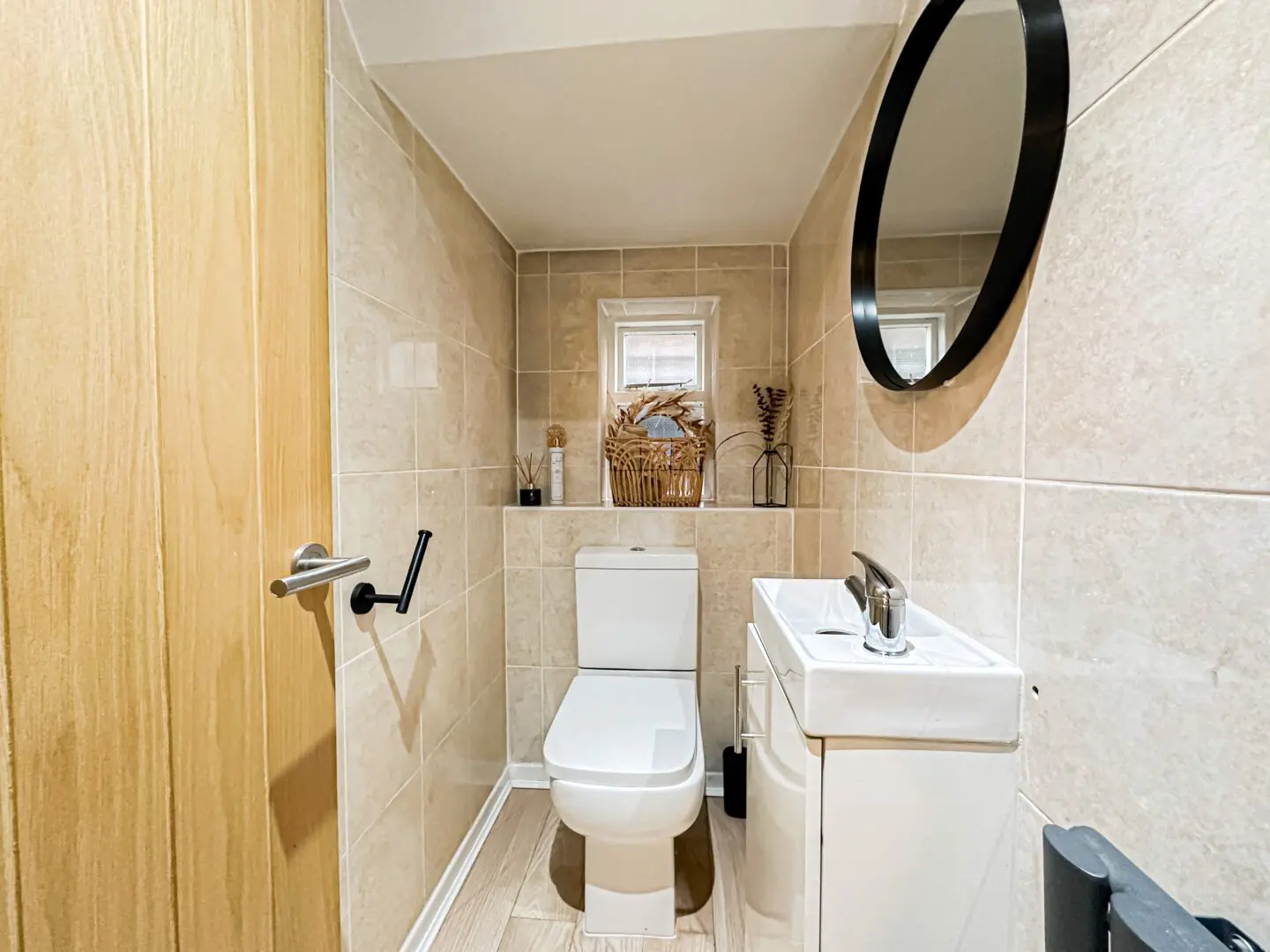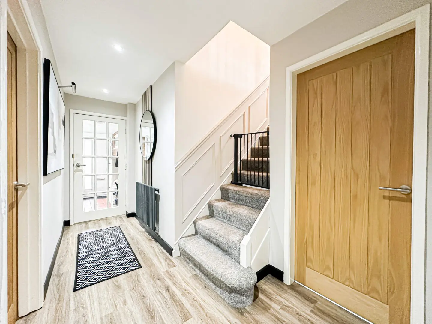 Following through the porch, you are greeted into the property by an inviting entrance hall, leading through to a bright and spacious family lounge. Beautifully finished in a tasteful décor featuring an eye-catching wood burner and attractive wood style flooring, this presents a welcoming and stylish space to relax and unwind. The rear of the property has been knocked through to create an immaculately presented open-plan kitchen diner which provides the ultimate social setting for enjoying family mealtimes and entertaining guests. The dining area enjoys a set of bi-fold doors which provide seamless access out to the garden and flood the space with natural light, flowing seamlessly into the kitchen which is complete with a range of fitted base and wall units, complementary worktops, and a selection of integrated appliances, along with a Belfast sink. Concluding the ground floor is a convenient WC.