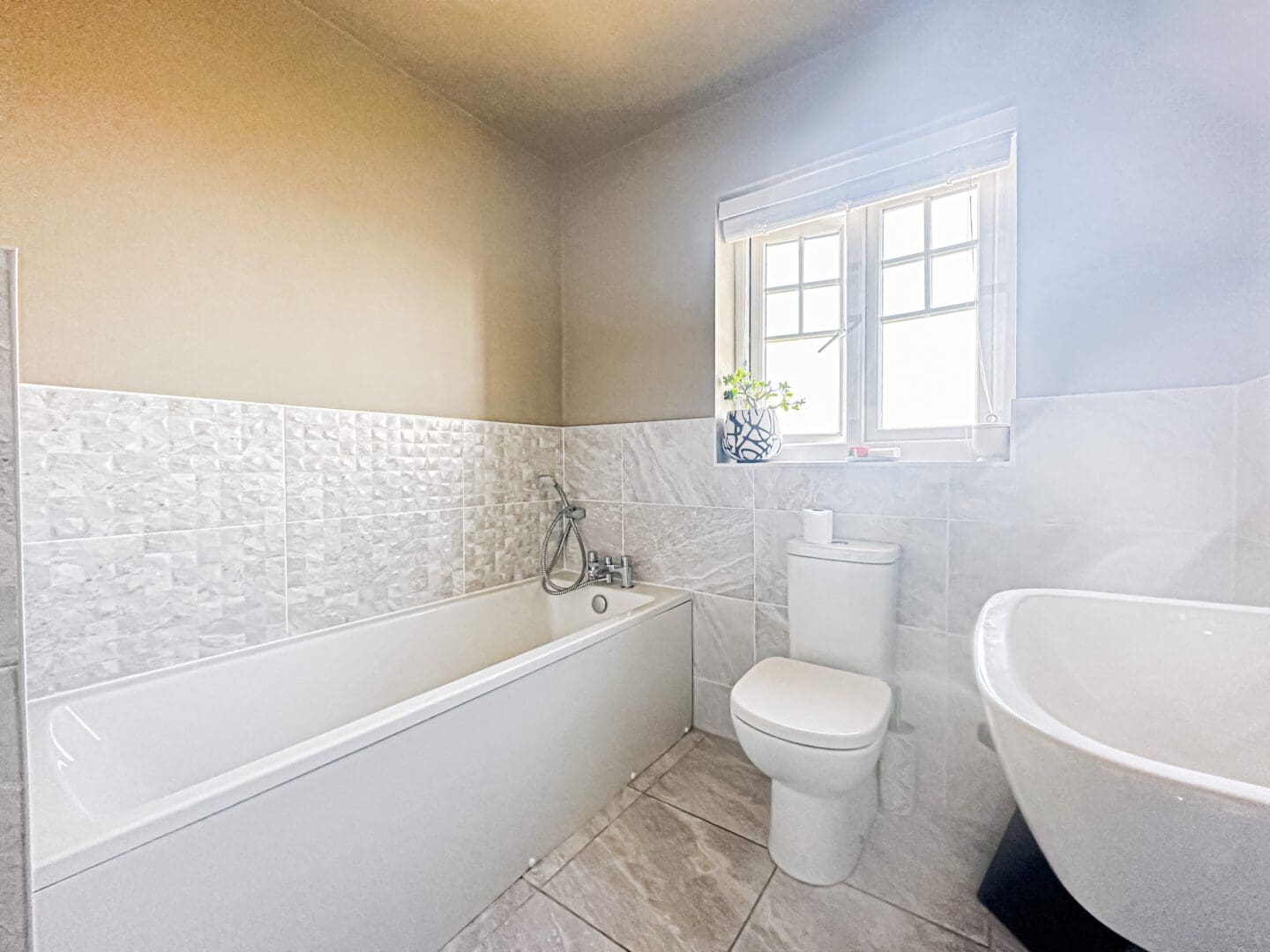Externally, the residence is further enhanced by a meticulously maintained rear garden made up of a neatly manicured lawn which offers ample room for recreational activities, and a smartly flagged patio area which provides a serene spot for al-fresco dining and entertaining. The garden benefits from not being overlooked, backing onto scenic fields which offer picturesque views, presenting a private and tranquil outdoor space for the whole household to enjoy. To the front, a driveway provides ample off-road parking, whilst a garage offers additional storage space.