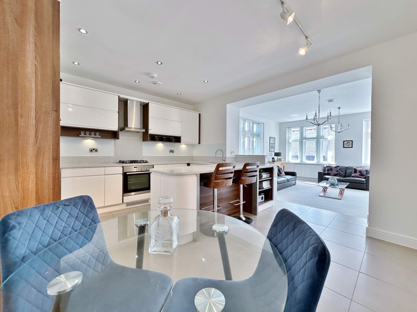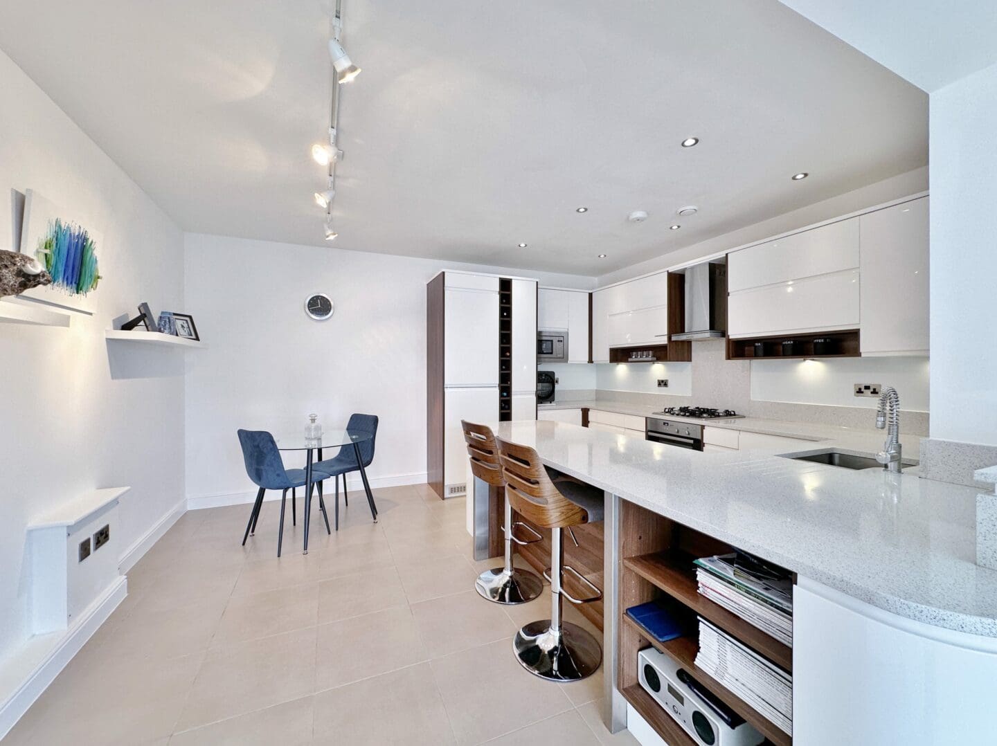 Accessed via an impressive communal reception hall with lift access to all floors, the apartment boasts high ceilings throughout and opens into a generous square entrance hall with two useful storage cupboards. The bright and airy lounge features dual aspect windows and French doors that lead directly onto the private terrace, creating a perfect space for both relaxing and entertaining. Just off the lounge is a beautifully fitted contemporary kitchen, complete with integrated appliances and a stylish breakfast bar. The thoughtful layout continues with a spacious master bedroom that includes a modern en suite shower room and a unique mezzanine style dressing room/office accessed via a short flight of steps, ideal for working from home or as additional storage. A second well proportioned double bedroom and a sleek family bathroom complete the internal accommodation. The property also benefits from two allocated parking spaces.