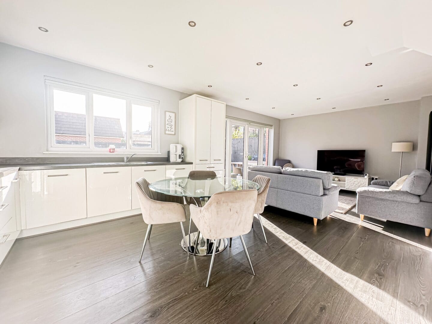 Externally, the residence is further enhanced by a meticulously maintained rear garden providing a fantastic outdoor space for the whole household to enjoy. A neatly manicured lawn offers plenty of room for recreational activities, and a smartly flagged patio area presents a serene spot for enjoying al-fresco dining and entertaining. To the front, a delightful garden area enhances the property’s visual appeal, and a sizable driveway provides ample off-road parking, whilst a detached garage accommodates additional storage space.