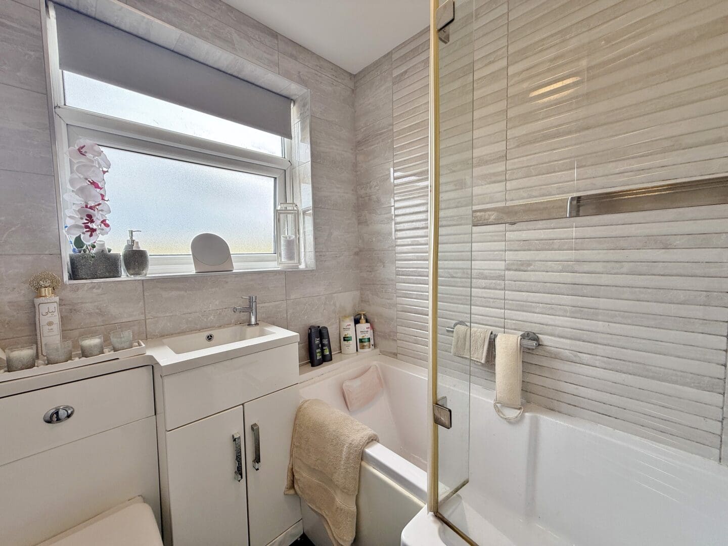 The first floor offers two generously proportioned double bedrooms, a third single bedroom and a stylish, modern bathroom suite. Externally, the property continues to impress, with ample off road parking to the front for multiple vehicles. To the rear lies a beautifully landscaped garden of generous size, enjoying an open aspect over school playing fields, providing both privacy and a sense of space.