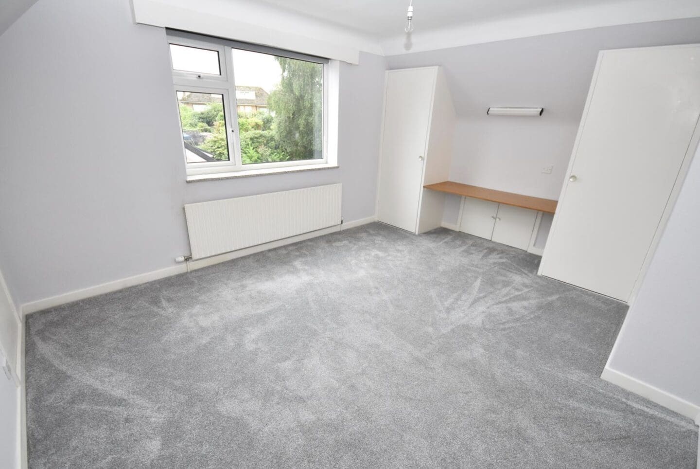 The accommodation is spacious and versatile. On the ground floor there is an entrance porch and hallway leading to a bright and airy open plan lounge and dining room, benefiting from windows on three elevations and French doors opening to the rear patio. A newly fitted kitchen is positioned to the side with ample storage, work surfaces, and integrated appliances, while a further room at the front of the property serves well as a study, snug, or third bedroom. A ground floor WC completes the layout. The first floor hosts two generous bedrooms with fitted wardrobes and and ample eaves storage, along with a family bathroom.