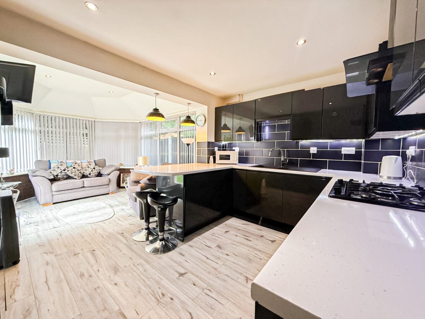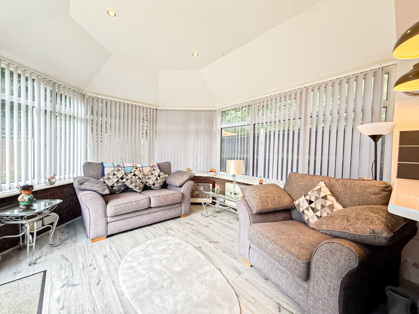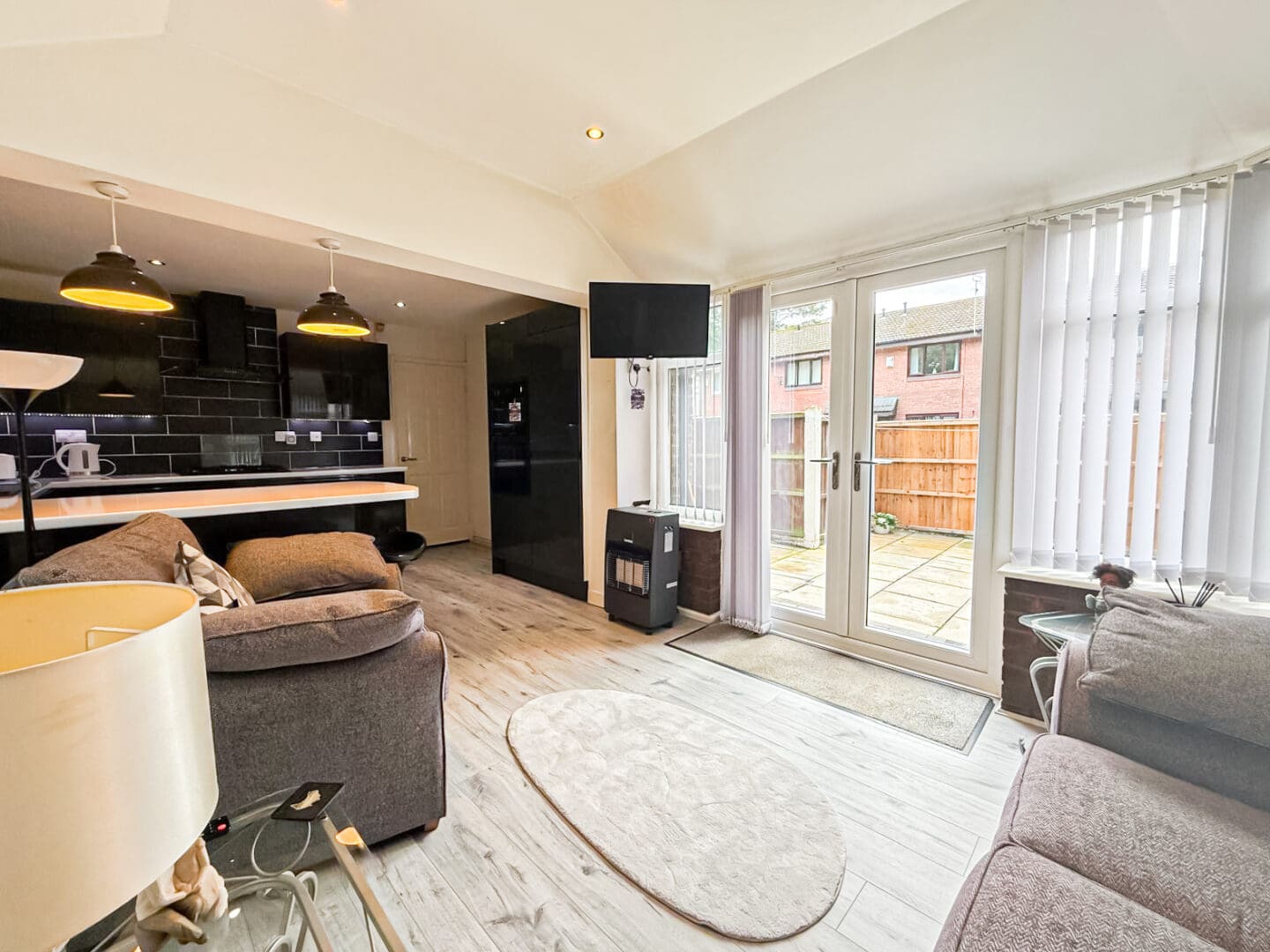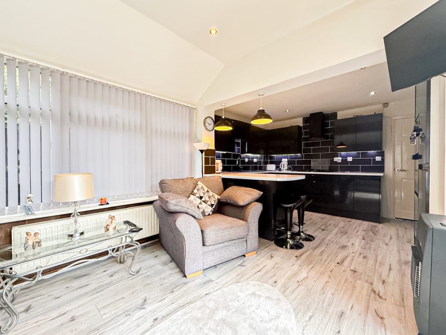 Entering via the porch, you are welcomed into the property by a bright and spacious family lounge which has been finished in a neutral décor featuring wood style flooring and an eye-catching fireplace. Following this is a modern kitchen complete with a range of sleek fitted base and wall units, complementary worktops providing plentiful surface space, and a breakfast bar. The kitchen opens out into a sunroom which presents a charming setting for sharing mealtimes whilst enjoying views of the rear garden.