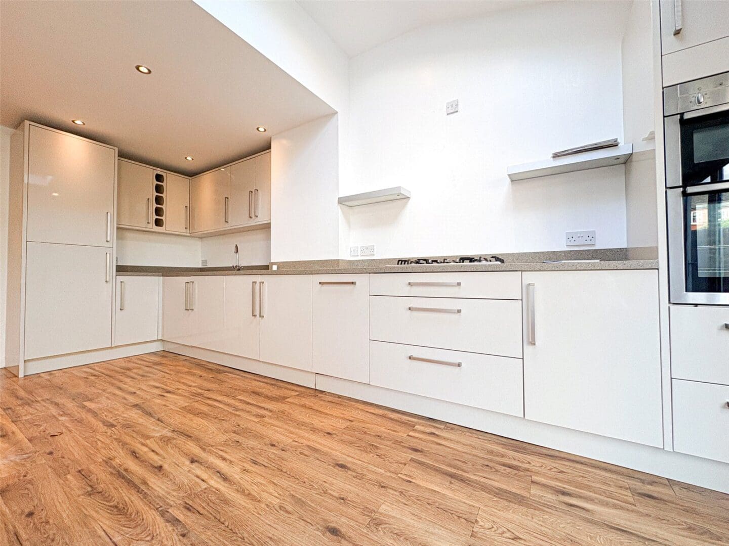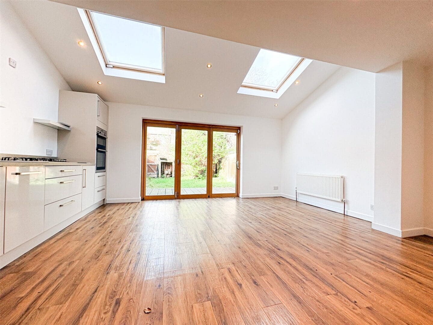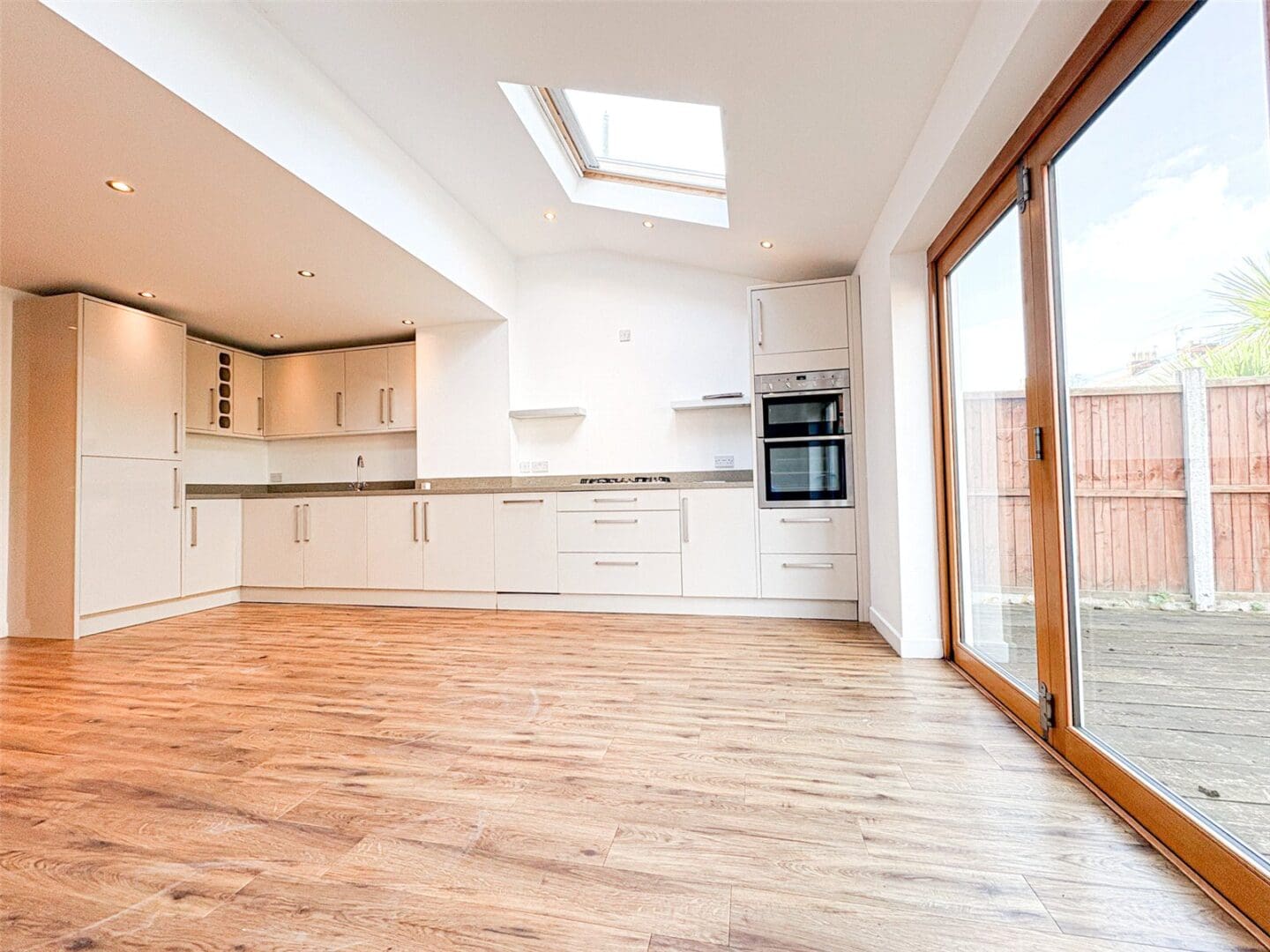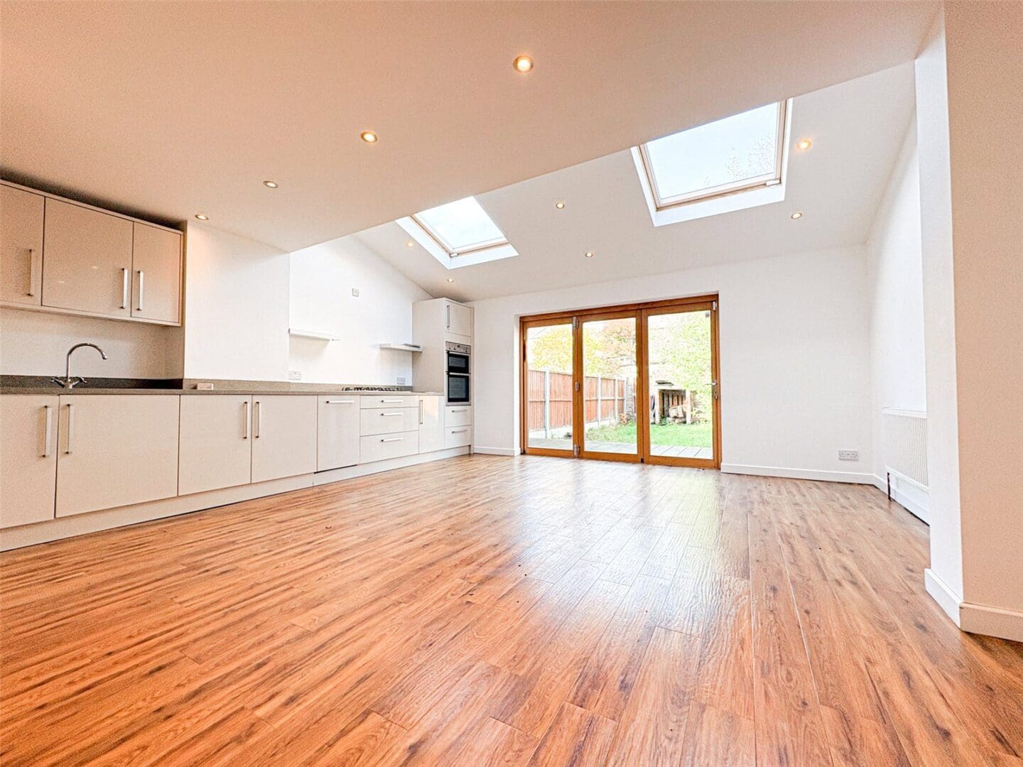The ground floor features a bright and welcoming entrance hallway leading through to a cosy front lounge, perfect for relaxing evenings. To the rear of the property is a truly impressive open-plan kitchen and dining space — the real heart of the home. This stunning area boasts a high-quality fitted kitchen with ample storage and workspace, along with stylish finishes and modern appliances. The dining area is enhanced by large skylights and wide patio doors, flooding the space with natural light and providing direct access to the rear patio garden — ideal for entertaining, summer barbecues, or enjoying your morning coffee.