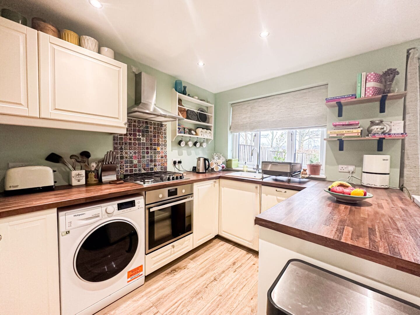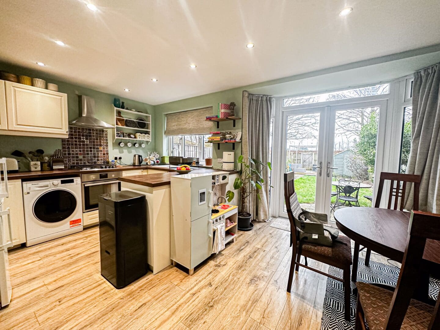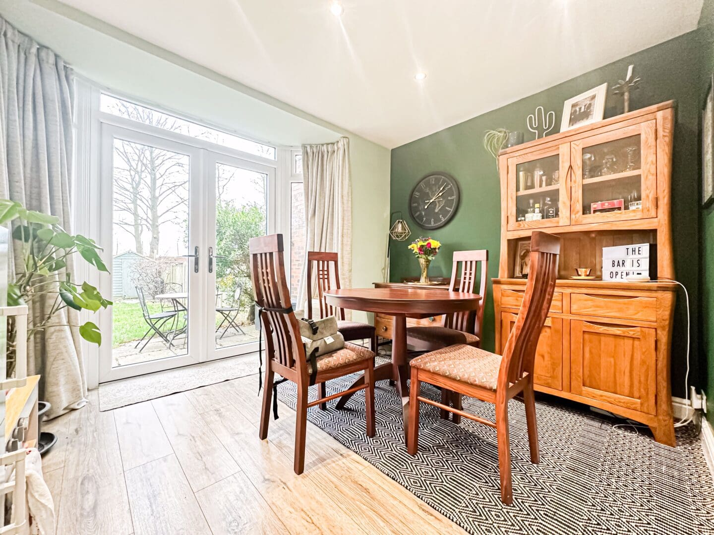 An inviting entrance hall greets you into the property, leading through to a stunning family lounge. Finished in a tasteful décor featuring plush carpeting and an eye-catching gas stove, this room exudes a warm and stylish ambiance, presenting a welcoming space to relax and unwind. The impeccably presented dining area enjoys a set of French doors out to the rear garden flooding the space with natural light, and opens out into the kitchen, offering a fabulous social setting for enjoying family mealtimes and entertaining guests. The modern kitchen is complete with a range of attractive fitted base and wall units, and complementary wood style worktops providing plentiful surface space. Concluding the ground floor is a convenient WC located under the stairs.