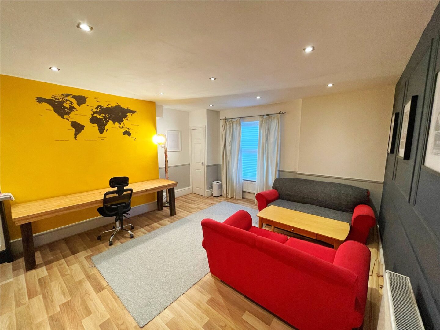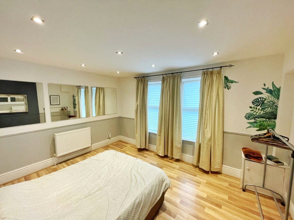 The apartment comprises a welcoming entrance hallway leading to a spacious open-plan living and dining area, filled with natural light from large sash windows. The contemporary fitted kitchen features modern units and integrated appliances, providing a sleek and practical cooking space. The bedroom is generously sized, offering a quiet retreat with ample room for storage, while the modern bathroom is finished to a high standard with quality fittings and a shower over the bath.