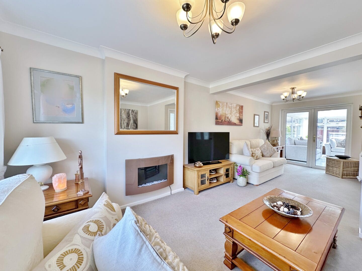Downstairs, the property features a bright entrance hallway leading into a spacious living room with feature fireplace and bay window, which opens through double doors into a conservatory, an ideal additional reception space with views over the superb gardens. The heart of the home is the open plan living kitchen dining area, designed for modern family living and entertaining, with doors leading directly out to the sunny rear garden.
