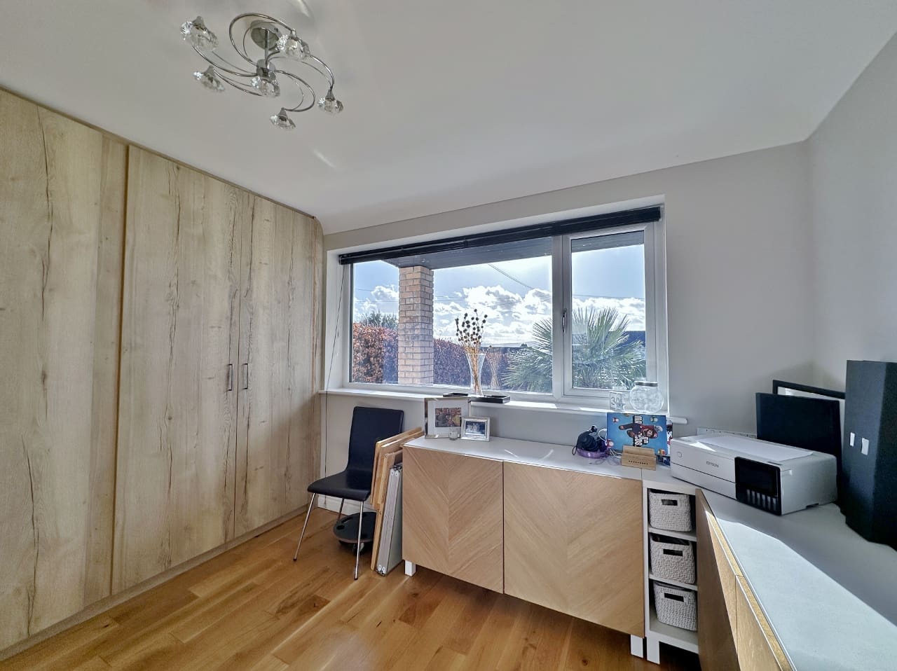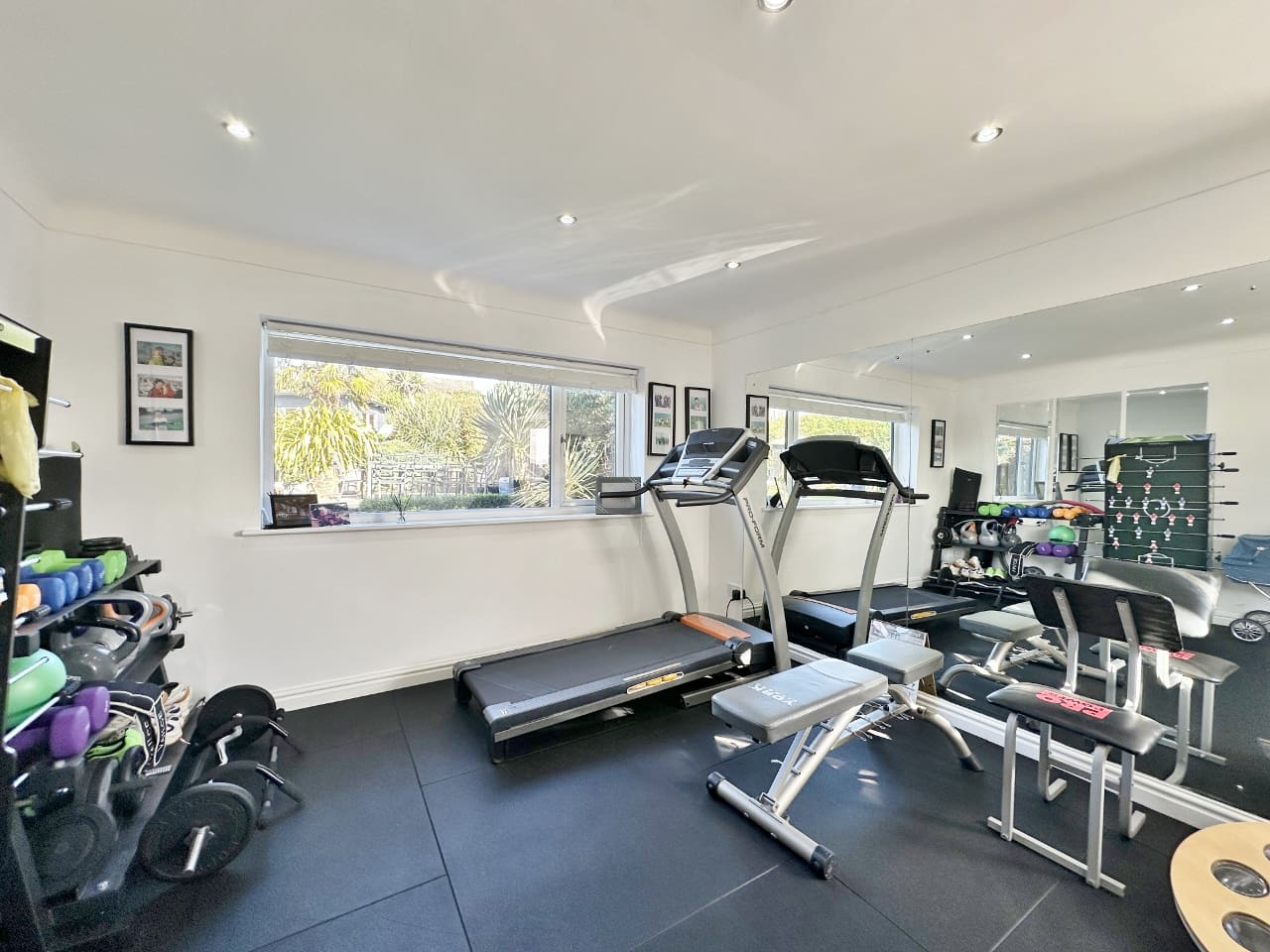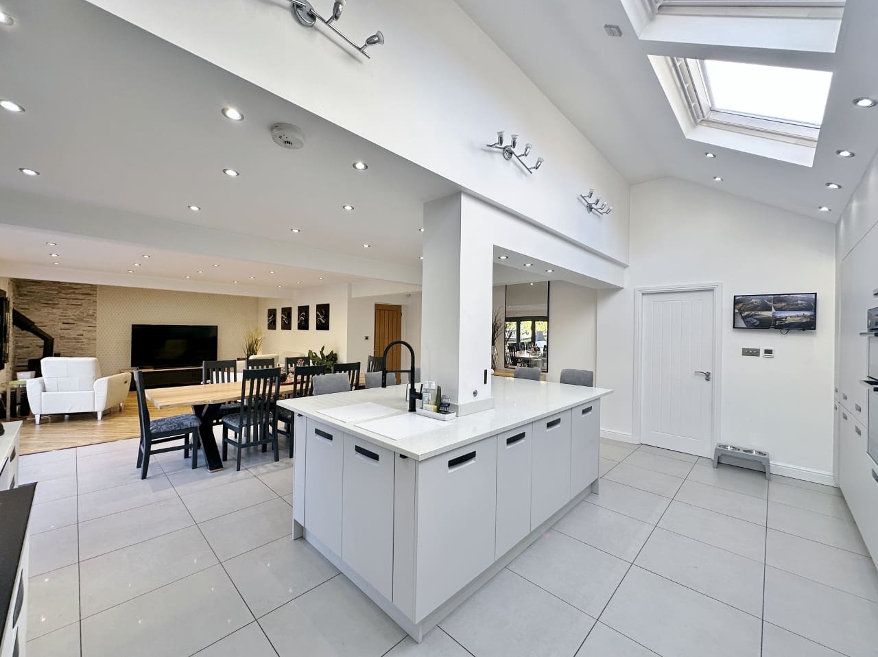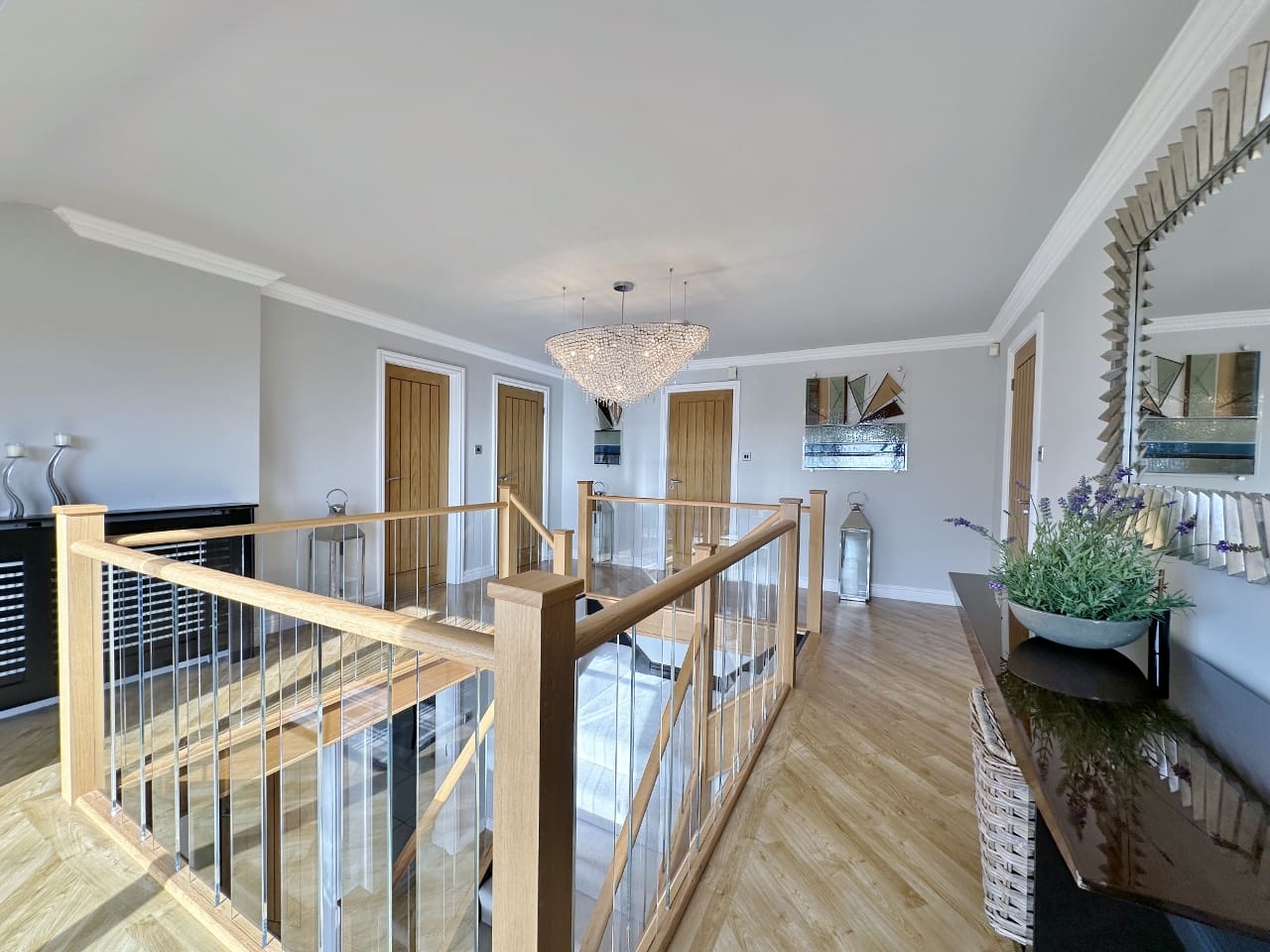 A grand entrance hallway welcomes you into this property and sets the standard for the rest of the accommodation, featuring an imperial staircase and full height windows flooding the space with natural light. From here you have a formal lounge and access into the breathing open plan living kitchen diner, a generous sized room with bespoke fitted kitchen with underfloor heating and electric velux with rain sensor, large dining area with bi-folding doors opening to the superb rear garden and a lounge area with log burning stove. The ground floor further offers a utility room with underfloor heating, gym/bedroom five, study/bedroom six and a modern shower room.